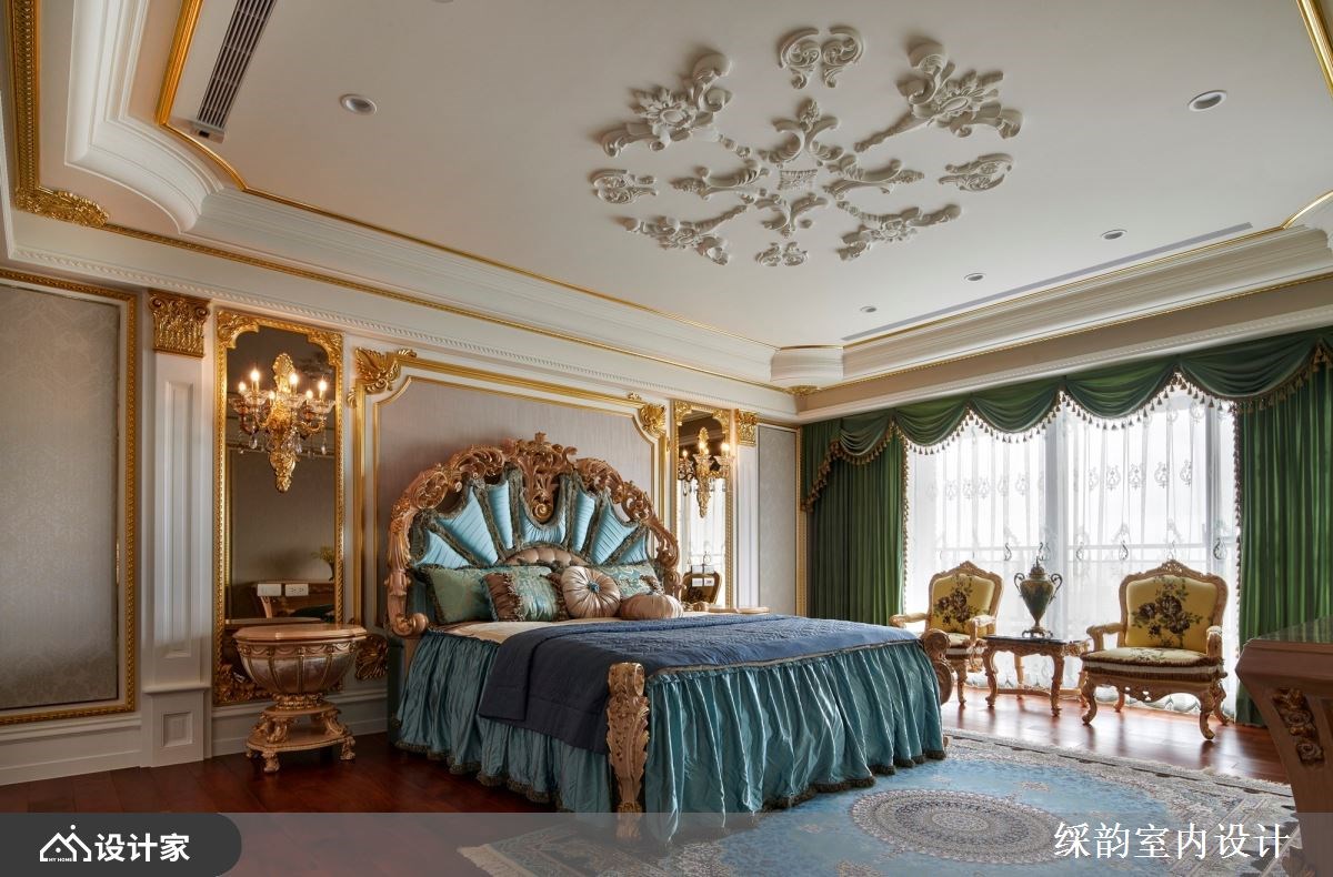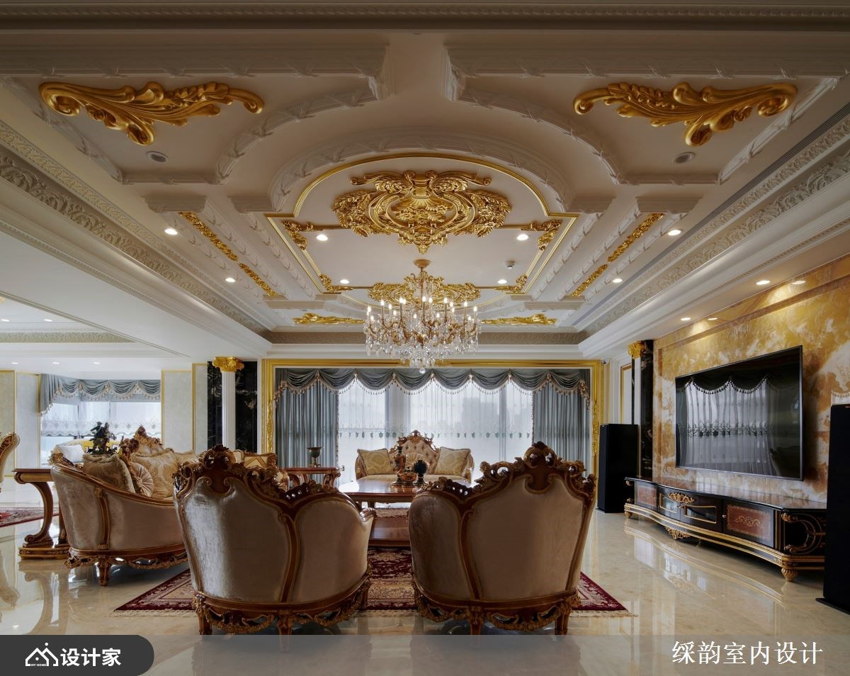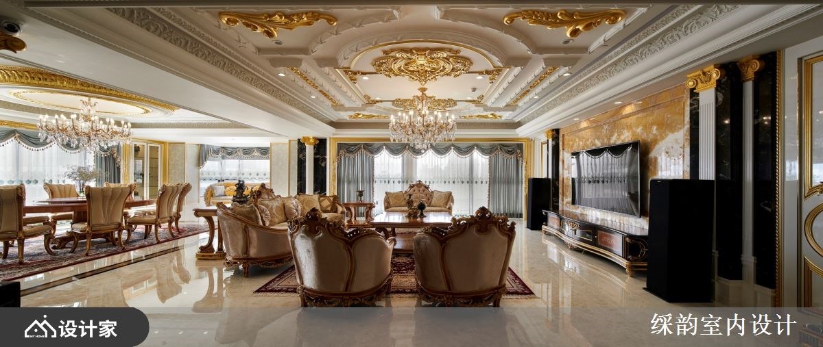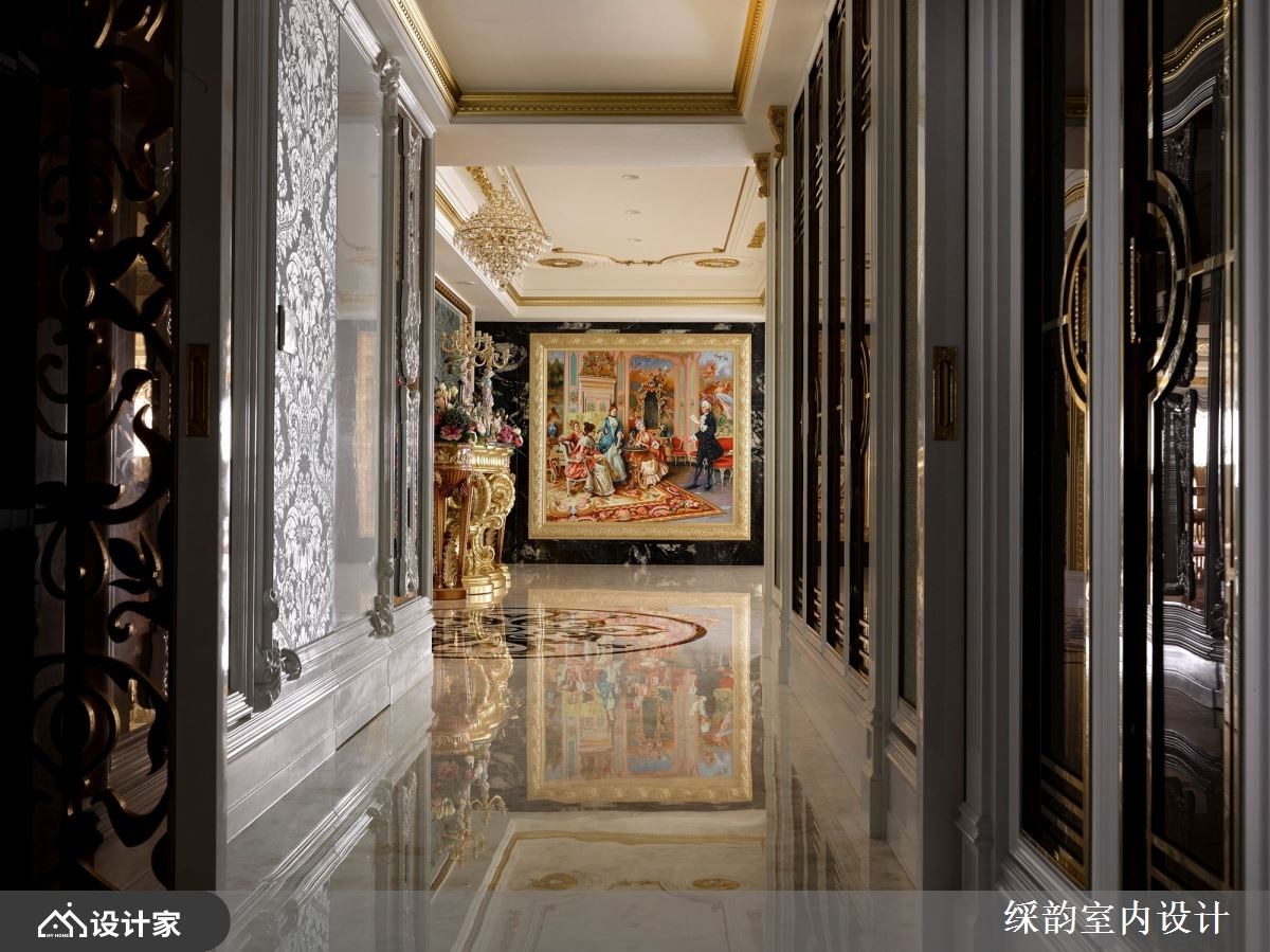 跨越世纪的设计巧思,䌽韵室内设计将 6600 平米大的毛胚屋精雕细琢后,仿佛将时代迁移到了中古世纪欧洲,重现欧式古典贵族的宫廷生活。玄关通往厅区的廊道如同凡尔赛宫的镜厅设计,透过动线布局引导视线落在端景的壁画艺术上,优雅中带着严肃贵气的氛围弥漫在廊道空间。经典罗马式爱奥尼克柱以对称组合镶嵌于客厅电视墙,衬着橘子玉大理石材凸显空间尊贵气质。 【欧式古典风华再现】 汲取 17 世纪巴洛克风格代表性的穹顶与艺术工艺,精致而轻巧纤细的雕花设计攀附于餐厅天花,华丽洛可可风格水晶灯悬吊在圆弧形轮廓,在欧式古典设计中流露中国传统团圆的寓意。配色上大量使用金箔增添浓烈的华丽风情,戏剧性光线配置刻画出空间里的强烈对比,展现超凡脱俗的豪宅气度。 针对三代同堂的生活需求,私领域连带起居室让私领域机能全面升级,打造专属阅读空间以及孩子们的游戏区。居室金色与米色交织贵族气质,墙面利用媲美丝绸质感的墙纸装饰,而令人惊艳的艺术床头雕饰在空间中华丽绽放,搭配欧式古典壁灯形塑浪漫优雅的宫廷风格。 小编的最爱 此案着重于室内装饰艺术的表现,有别于一般豪宅设计的用材与设计逻辑,䌽韵室内设计把空间当成立体艺术品在规划,繁复华丽的雕饰簇拥着空间,形塑超越真实感的梦幻氛围。在生活机能之下强调华贵的豪邸气魄,连同家具与艺术装饰都带着古典雕刻艺术,透过硬装到软装在现代空间围塑出欧式古典情怀。