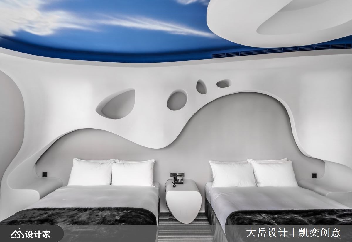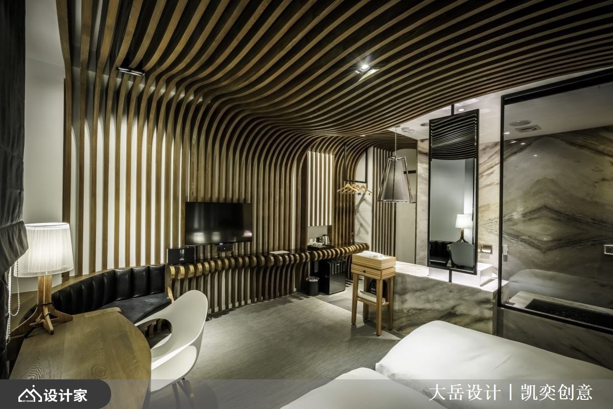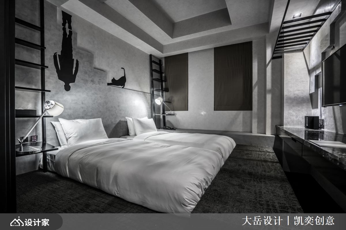 位于台中的伯达行旅以奇幻旅程作为酒店主轴,他们找来注重照明、空间互动的大岳设计团队,突破以往对于酒店设计的既定印象,挹注超现实主义名作和大师的艺术理念,让房客可以在与众不同的氛围营造下,开启现实和虚幻交织的梦游仙境之旅。 【艺术具象化,表现客房的多维视角】 走廊采取墨黑的几何造型墙面,一片片破碎意象宣告着对现实世界的裂解,缓缓拉开前所未见的奇幻序幕。大胆的鲜红卫浴隔断、熠熠生辉的折线天花板,别出心裁的客房设计表现出雷内·马格利特画作「大苹果」的深刻精髓,同时把立体派、未来派、超现实主义的艺术要素融入其中,苹果皮天花板、苹果果核衣帽架及苹果果肉床头墙,共同构筑了充满动态又有多维视角的客房主题。 在超现实主义艺术家马克斯·恩斯特的作品中,经常出现错乱的编织曲线、看似荒诞不经的世界观,而设计师将这样的概念化作了布满客房墙面、天花板的木作格栅,希望在此住宿的房客,能坠入无拘无束的梦网,抛开尘世的烦忧。此外,设计师在另一间客房,也巧手转换保罗·德尔沃在画里对三维故事的呈现,创造出跨越二、三维的阶梯语汇,在灰阶客房中引导人们走向自己的美好梦境。 讲到超现实主义,就不可错过萨尔瓦多·达利的经典作品,设计师将达利对潜意识层次的想法与造诣,在客房里具体表现为上下颠倒的奇妙幻境,天花板破洞中掉落一半的行李箱,与墙面堆叠的行李箱相互呼应,让人有种置身哈利波特魔法世界的错觉。面对擅长大面积色彩手法的胡安·米罗,设计师以其作品《蓝色二号》没有界线、时限的运动表达为灵感,打造出蓝色穹顶下柔软轻盈的睡眠环境。 小编的最爱 设计师秉持奇幻旅程的空间概念,网罗超现实主义大师们的经典名作,且细腻探究背后的逻辑与思路,成就一间间别具匠心的主题客房,让艺术能够跳脱平面框架,变得亲近且真实,赋予造访的宾客难以忘怀的沉浸式体验。