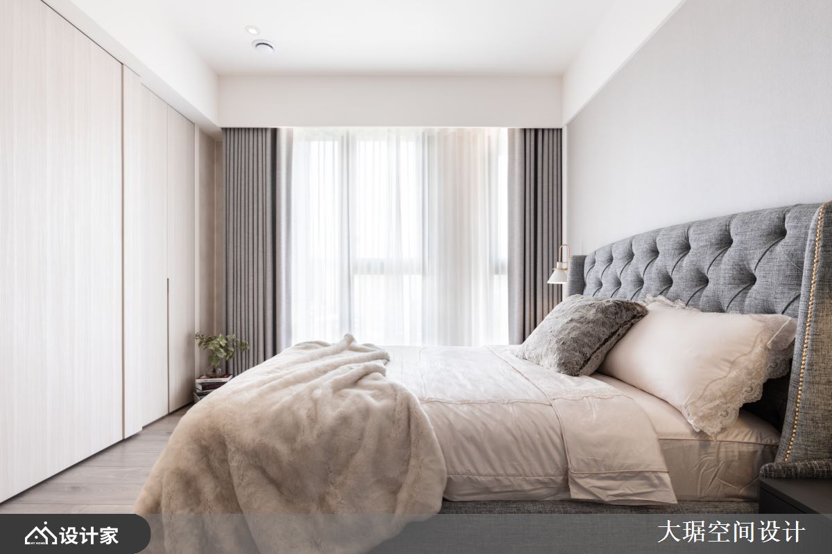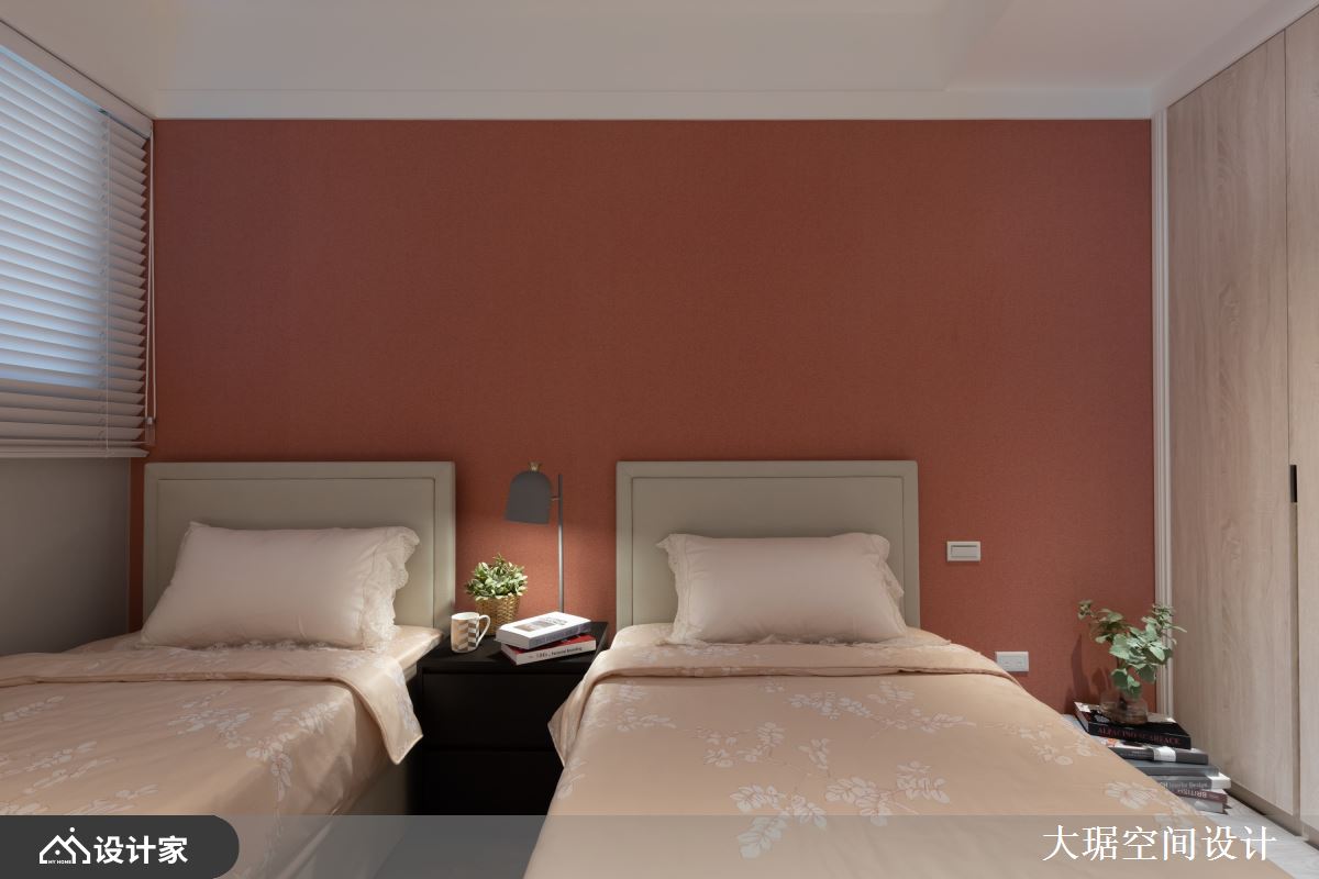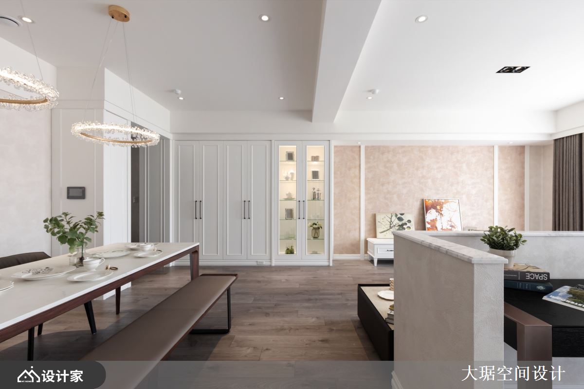 小编带你看好宅 设计师透过线条语汇、色调呈现,展现美式风的温和感,并让餐厅、客厅、书房呈开放视野,缔造入门后的豁然开朗感受,让整个住宅充满温馨隽永的生活雅韵,快跟着小编一起来看看吧! 玄关在天花板做出圆形造型、形成挑高格局,步入客厅,则藉由白色为基调,减少彩度干扰,并跳脱电视墙常用石材的制式作法,在主墙铺陈简约的蓝宝坚尼进口粉色壁纸、建构视觉亮点,兼具大自然石纹质地、又略带水彩笔触,展现如春天般的轻柔淡雅;并以半高矮墙围塑半开放的书房,在矮墙上以大理石作局部点缀,后方以成扁平电缆板书柜挹注机能,展现优雅气质与层次感;餐区则给予淡雅壁纸铺叙,以香槟金元素做辉映,让整幅画面显得雅致奢华! 小编的最爱 卧房将配角墙面当作主墙用,在侧墙铺陈牡丹花壁纸,并将其延续至后方更衣间,形成场域的串联呼应,床头墙则选择低调的淡雅壁纸、显得相对安静,在明确的主从分配之下,可使睡眠更为沉稳安定,但也带出整体气度!
