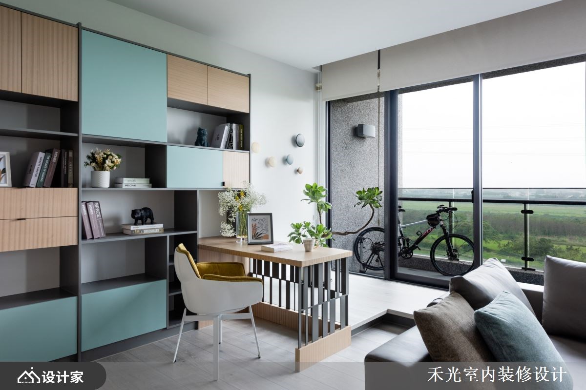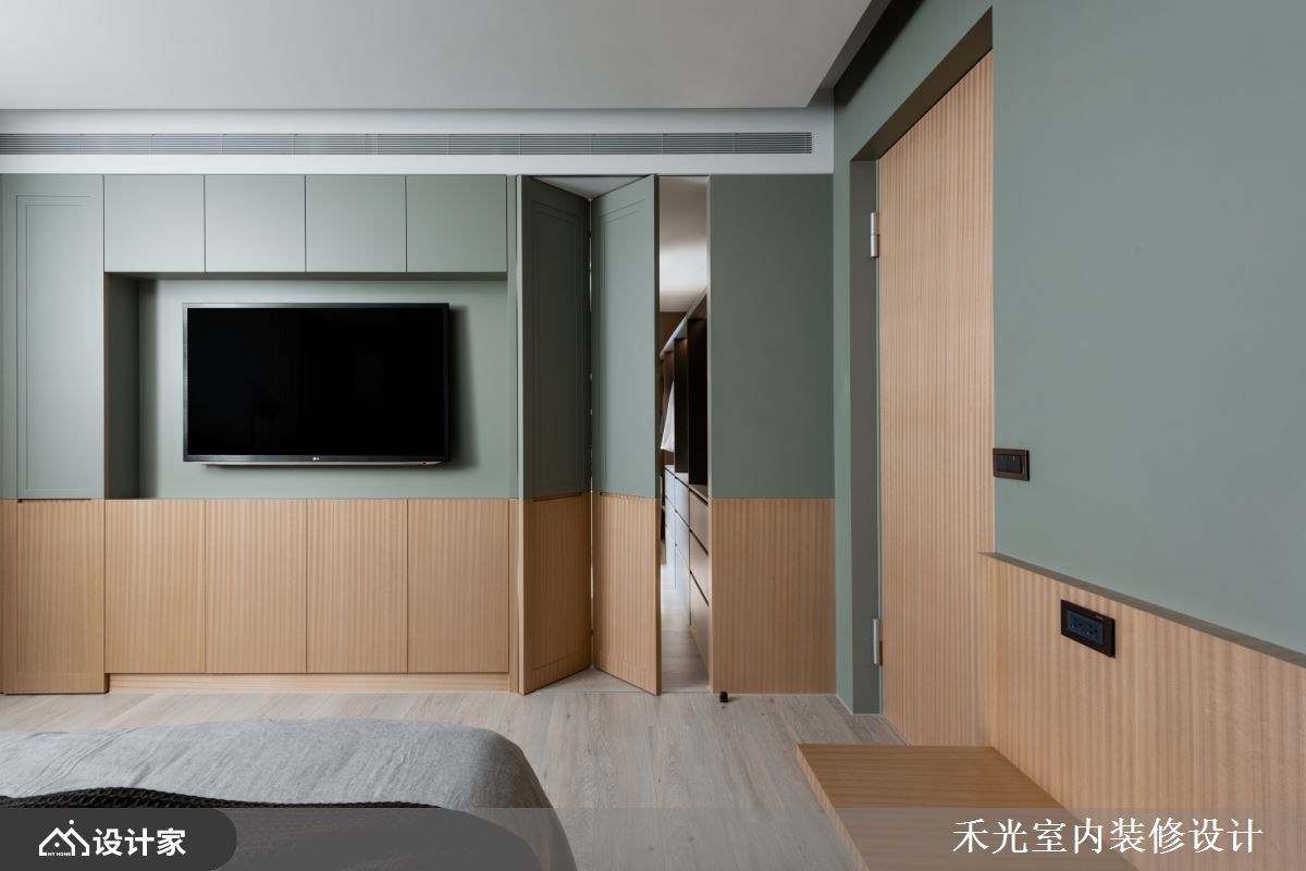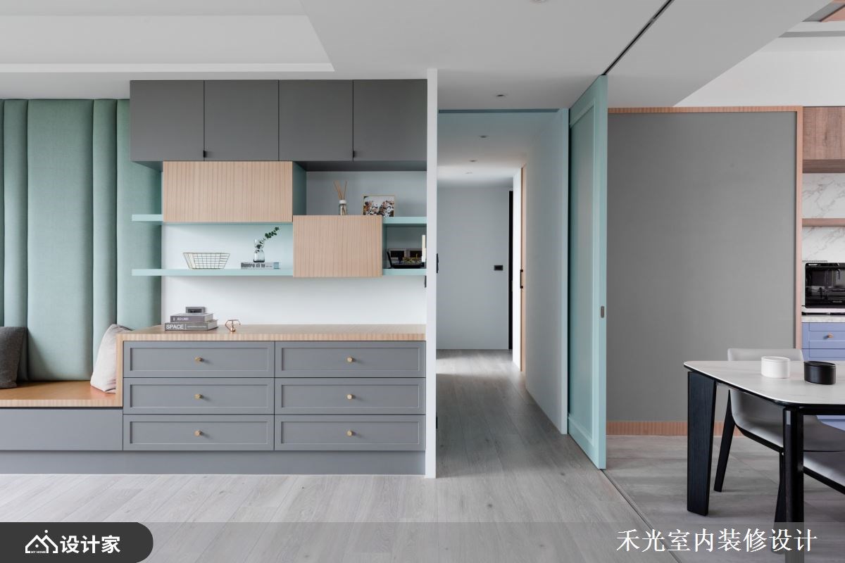 如果说窗外的绿意景观,是与众不同的环境优势,那么室内湖水绿与木质调的绝妙搭配,就是巧夺天工的设计呼应。设计师透过格局、动线、收纳的重新规划,为两大一狗量身定制突破风格框架的高机能宅邸。 【茶镜推拉门,细腻隐藏中岛厨房】 玄关特别自电视墙延伸出湖水绿的收纳柜,加深落尘区的空间感,同时藉由透气鞋柜、穿鞋椅、一日衣柜的高效能组合,让人一回家就感觉被包覆的安心。开放式公领域以客厅作为空间核心,两侧分别是书房及健身空间,而设计师也细腻地运用茶镜装饰推拉门,隐藏后方的餐厅与中岛厨房,关门时可以创造内外虚实交错的视觉景深,开启时又可以串联前后采光,营造敞亮的家居质感。 健身空间在墙面设计绷布与木作的异建材混搭,塑造机能充沛的展示区和放松飘窗,当空中瑜伽练累了,可以坐在卧榻上稍作休息,眺望户外的美好景致,心境更显沉淀。转身来到灰色特殊涂料妆点的多功能室,湛蓝色的收纳柜大胆跳色,而高起的地板提供长辈或亲友来访时,暂时住宿的舒适场域,也巧妙保留了未来成员变化的弹性空间。 小编的最爱 主卧选择灰绿色作为沉稳的主视觉,木纹的半腰墙板延续空间与自然的连结,使温润触感油然而生,而收纳功能齐全的电视墙,也透过线板的修饰隐藏更衣間入口,带来宛如韩剧场景、内敛典雅的家居氛围,让夫妻俩可以享受从容不迫的生活步调。