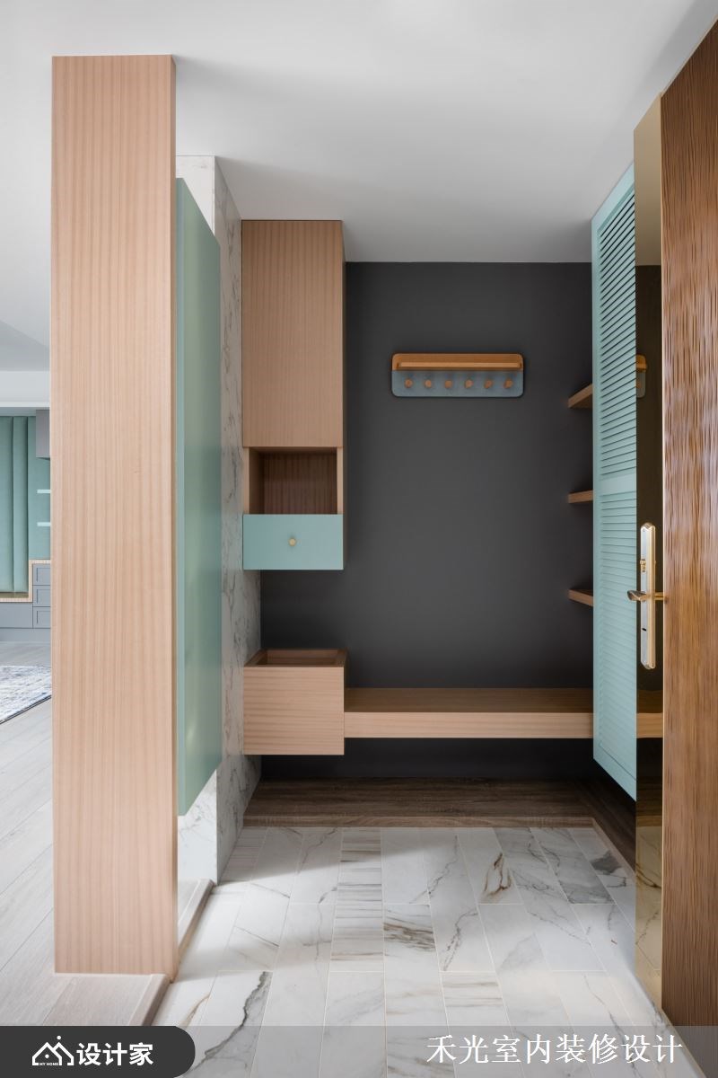 步入式鞋柜与拱门!莫兰迪色妆点混搭风亲子宅