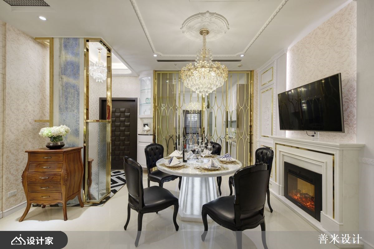 推开大门,黑白几何造型的大理石砖勾勒着金黄线段,典雅壁纸铺陈墙面,将视线由玄关处引导到屏风隔间。结合镀钛金属与石材的穿透屏风前摆放着屋主的木制品收藏,象征着回到自己家的归属。99 平米二手房在格局与动线上都有很多缺陷,设计师在二手房装修过程中重新梳理空间动线,换新老旧管线并重做天花扩容室内空间,并利用高质感的石材、镀钛金属与线板装饰壁面,将老旧二手房翻新成别具奢华风格的精品宅邸。