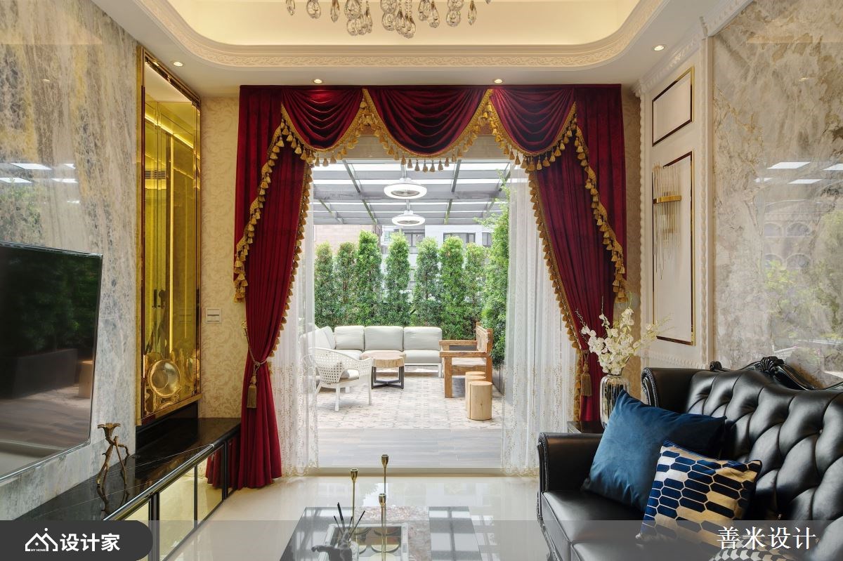 【色彩创造空间好风水】 顺应屋主在意的风水考量,设计师将代表好运的色彩透过材质表现在空间之中,白色大理石搭配玻璃与水晶灯饰呈现清透的白色,诠释室内的明亮光感;镀钛金属镶嵌于屏风、画作墙面线板,搭配客厅镶金编的红色窗帘,代表着喜气与财富充满空间。沙发背墙一片白色大理石纹如同这个家稳稳的靠山,衬着优雅的蓝色绒布沙发,规划动线时也将屋主大量的木制收藏变成空间的装饰,连同户外宽敞的露台也经过绿化设计,99 平米二手房随夫妻入住展开新生命。 小编的最爱 除了重新整理二手房的水电管线与优化动线外,居家生活必备的收纳机能也巧妙地安排在空间里。从机能区域来划分,玄关保持开阔大气仅安排木制柜体作为玄关收纳与端景,客厅区利用柱体与与空间交界处规划兼具展示机能的收纳柜;金属玻璃拉门后方的餐厨区域则将厨房收纳收拢在一起,线板弱化门片形成隐藏设计,让新居拥有充足收纳又不会被柜体影响了大气舒适的空间氛围。