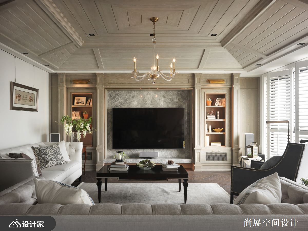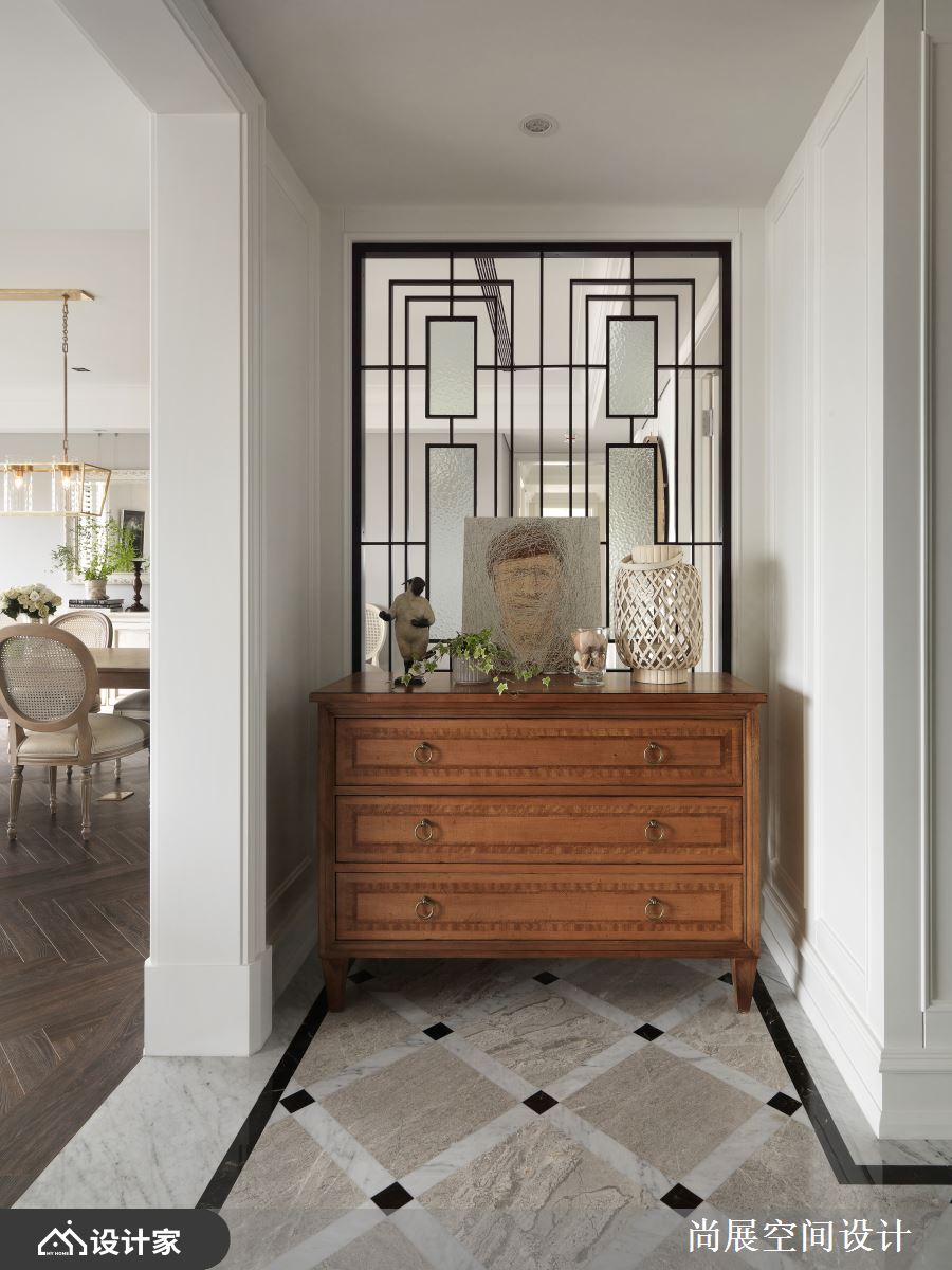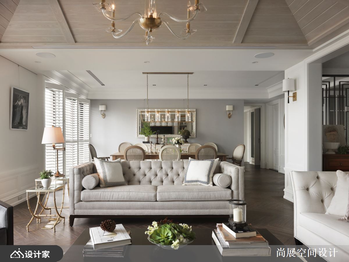 小编带你看好宅 三十年前移民加拿大的夫妻,待孩子长大成人后,决定迁徙回台享受下半场的退休生活,在参观尚展设计办公室与设计总监吴启民的自家宅邸后,由于欣赏其规划美式宅邸的美学与功力,在双方相同的美感共识之下,开启了这间美式古典大户型的设计起点,快跟着小编一起来看看吧! 入口玄关,透过篓空穿透的屏风促成光线、视线延伸流动,创造出美式庭园的模拟端景,并利用天花板与地坪材质差异,切割出隐形内外场域,交谊厅则呈现木屋式斜屋顶,一体成形衔接了电视墙,让交谊厅充满度假宅邸的美好氛围;色调上,采用美式古典的优雅白作为基底,家具多以浅米、杏色表现出层次感,选用 Ethan Allen 伊莎艾伦经典家具,打造出浓郁的美式风范,搭配坐东朝西方位,以百叶窗将美好光影引导入室。交谊厅、餐桌区则展现美式大户型的好客大方,对最重要的餐厨聚会区,摆放八人大餐桌做为中心,创造宾主尽欢的每一刻! 小编的最爱 主卧室营造出古典酒店的气度,以宽敞视野让心感到平静;次卧房则充满个人特色,墙面颜色、挑选的家具,都充分展现主人个性,无论是儿子房的清新抹茶绿、或女儿房的柔和浅鹅黄,皆洋溢着轻盈节奏!
