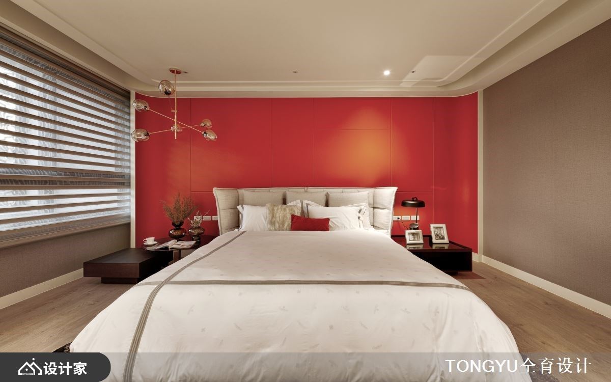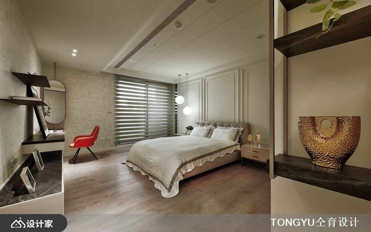 豪宅里以「疗愈」做为空间主题,藉由异材质的堆栈,且以石材、香槟金色调与线板的描绘,酝酿法式微奢的优雅气息;同时藉由自然灵感的活用,像是花艺植栽、壁纸铺陈,挹注自然生命力,订制私宅特有的人文温度。 入口玄关藉由矮柜界定内外领域,半高柜体结合吊柜与花艺造景,穿透的设计安排让入室后视野得以浏览全室,且欣赏窗边绿意景致。客厅电视墙挑选卡拉拉白大理石,透过茶镜与镀钛切割出对称之美,下方则嵌入壁炉的手法,替冷调材质增添温度;整面棕榈叶花纹墙纸成就沙发背墙之美,与玄关、茶几、电视矮柜、餐桌上的植栽相互呼应,调和出惬意、舒心之感。由于屋主希望餐厨空间能容纳演奏乐团,因此事先丈量领域尺度,而石材中岛衔接大理石餐桌,搭佐金属质感妆点桌缘,与金属边框的吊灯增添奢华美学;厨房以玻璃拉门为界,门框以金属线条点缀,搭佐对称展示柜,随着杯盘器皿的陈设,增添艺术精致神采。 小编的最爱 居室头墙以大胆的亮橘皮革为基底,搭佐灯泡造型吊灯,交织抢眼独特风采,大型的更衣室里,悬空室展示与收纳技法,展演服装与精品鞋包的魅力,营造出轻盈、简约的时尚品味。