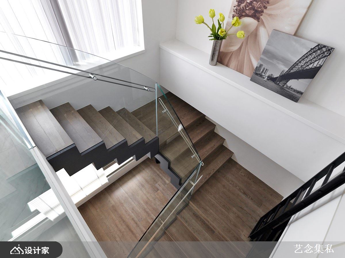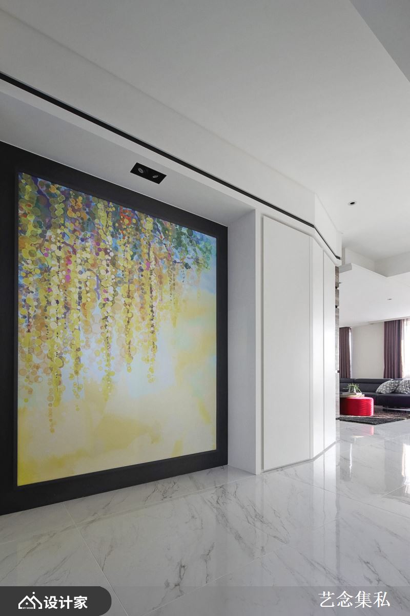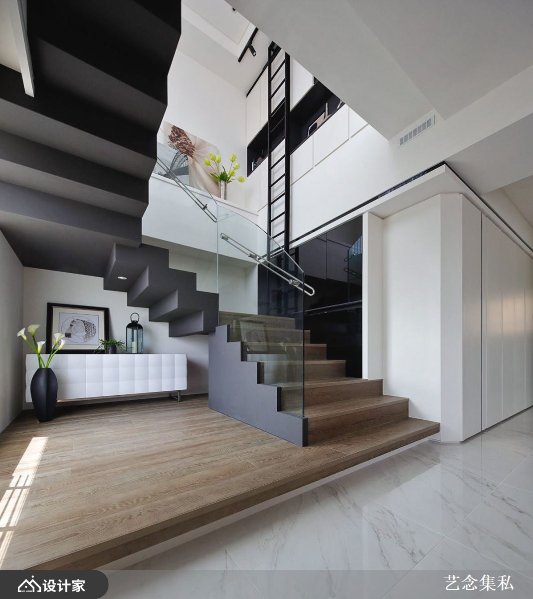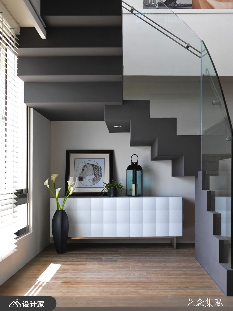 由于此栋豪宅一共将近 300 m²,大户型跃层家居让全家人住得舒适妥贴,尽管如此,也不会任意浪费任一个空间。像是甫入玄关就能一窥花艺绘画之作,还有为了避免跃层楼梯正下方成为畸零空间,设计总监黄千祝特意在此运用编柜、软件布置,将花卉、挂画点缀人文雅致情谊。缓步踏上阶梯,也有画作成为楼梯墙面上的端景一隅;让生活轻柔扣合着艺术,又能巧妙彼此融入。