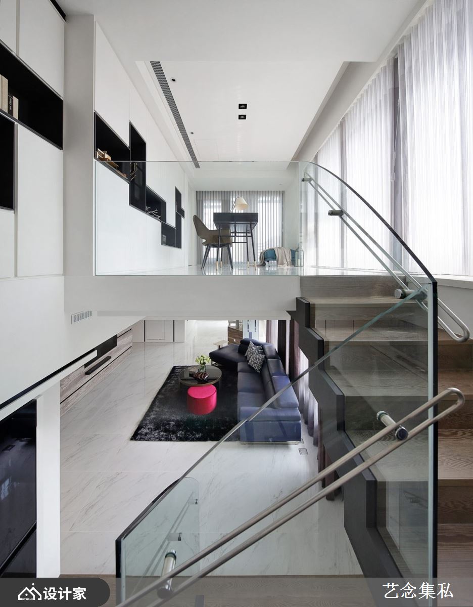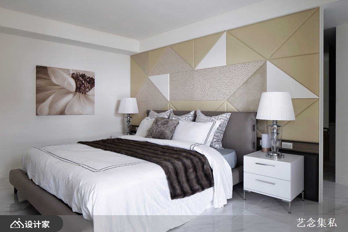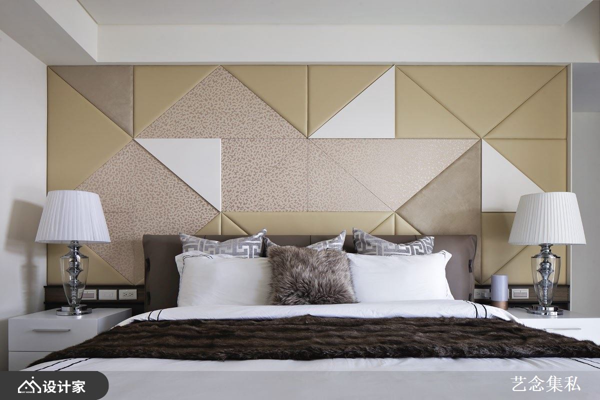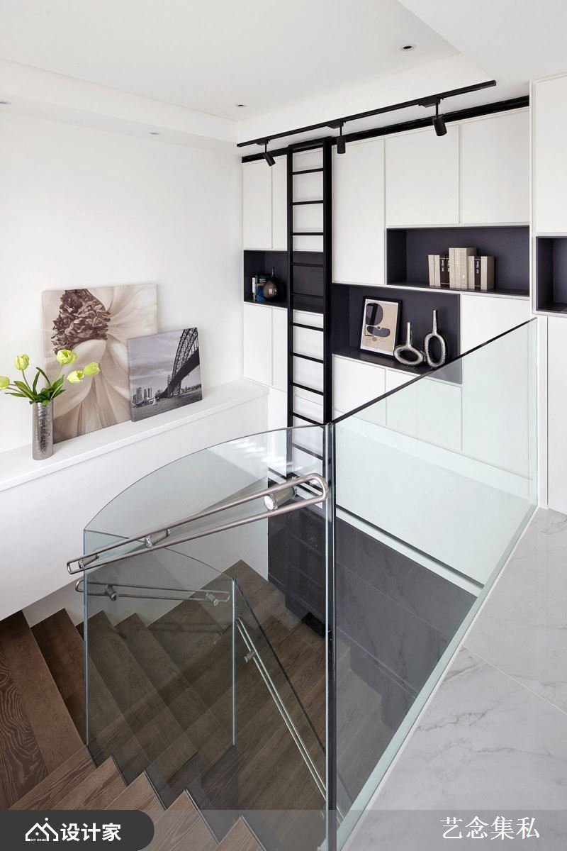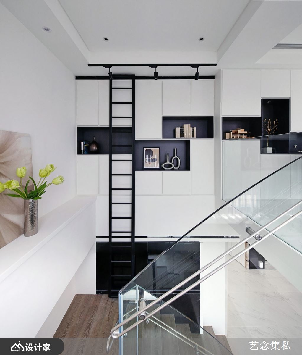 楼梯的滑轨梯收纳柜一路延续到二楼空间,藉由中间 "挖空" 般的展示柜区,呈现有如跳动般的视觉动线,上下白柜或为细而长、或为宽而短,不对称、不规则的配置而让空间多了视觉玩味。而私领域的卧房则强调放松慵懒底蕴,大地色系空间使人感受沉稳平静情境,几何拼接更酝酿出艺术质感,延续整体居家的空间韵味。
