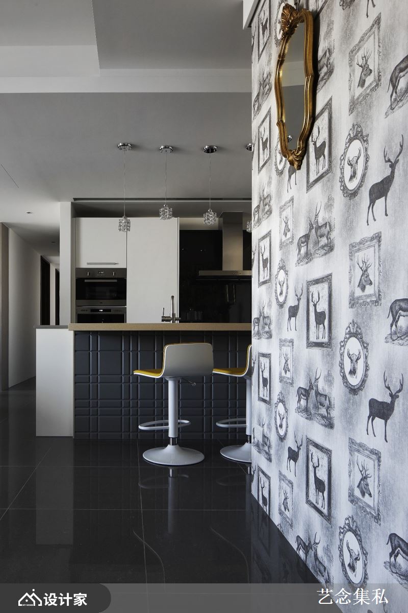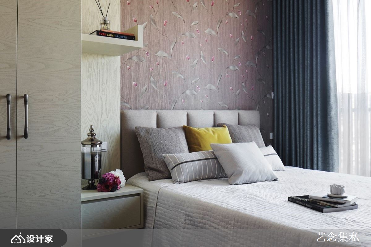 用餐空间以白底灰纹大理石餐桌巧搭现代摩登玻璃水晶吊灯,既有欧式古典的瑰丽雍容,又兼具都会意境与轻盈之姿。另外,玄关旁的墙面则以墙纸轻柔点缀英式生活感,辅以黄铜挂镜呈现略为复古情境,让沉稳家居顿时多了层次意境,也和电视墙的镜面映像,相互产生虚实映衬与通透视觉。 至于私领域空间,主卧里的雪青紫棠色床头墙面为空间定调,线板设计与黄铜台灯诠释英伦品味,圆润曲线的床头桌几搭配大理石桌面,延续餐厅的净白质感气氛,结合粉嫩、典雅、暖心的卧房空规划,让舒适惬意的家居生活就此展开。