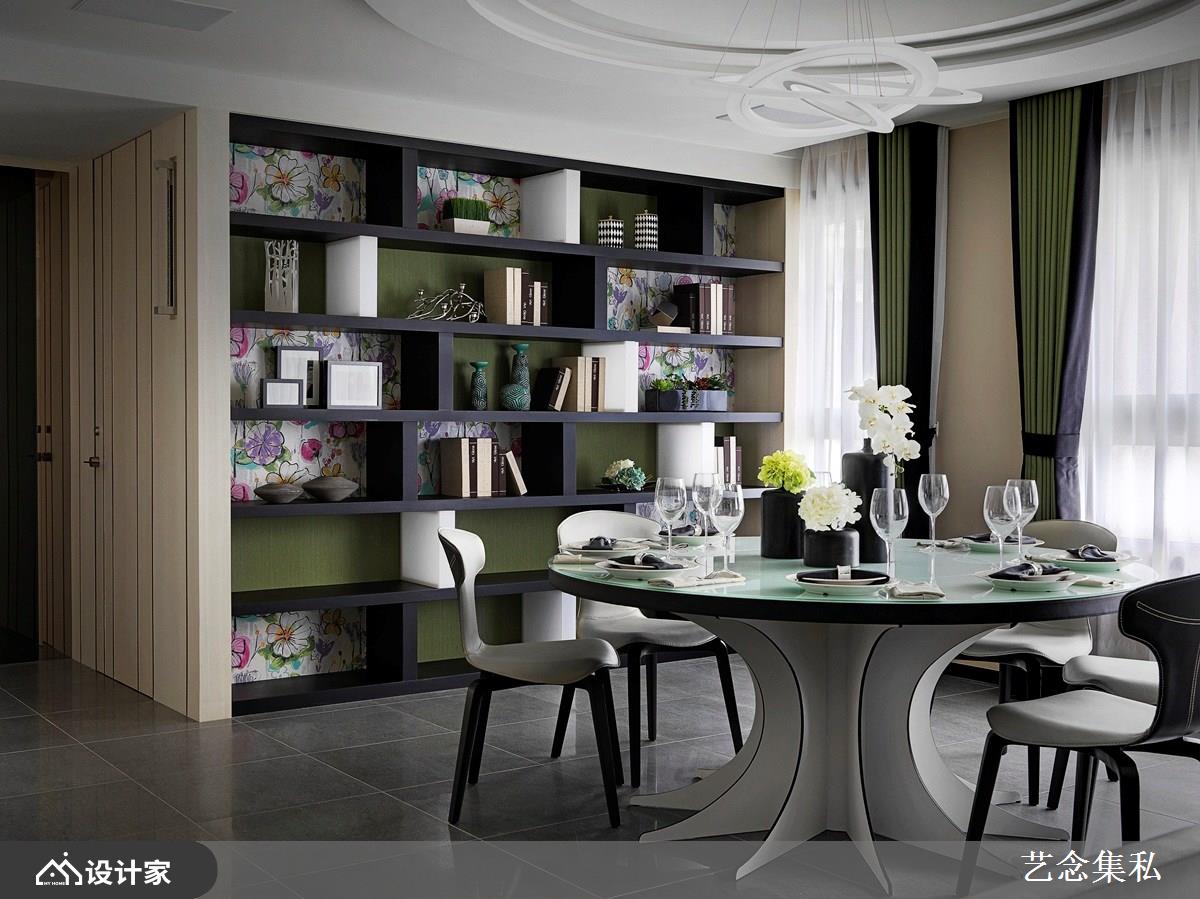 为了善加利用大片落地窗的户型空间,设计总监张绍华、黄千祝以开放式空间统整客厅、餐厅、厨房和轻食吧台区,引光入室的同时,也让整体环境更为宽广通透,充分发挥豪宅空间特性。 而圆形餐桌巧搭圆形天花板设计,造型吊灯衬托了设计品味,一旁柜架则能展示屋主收藏及家饰品项,书籍、瓷器、摆饰等,间接衬托豪宅宅邸的高端品味,其内的缤纷花卉墙纸与桌上花艺相辅相成,互相妆点用餐空间的自然气息。