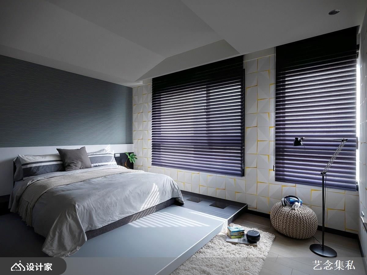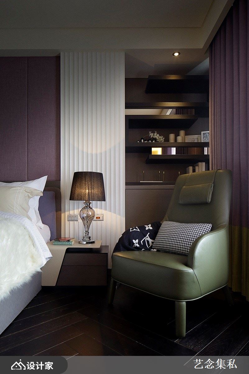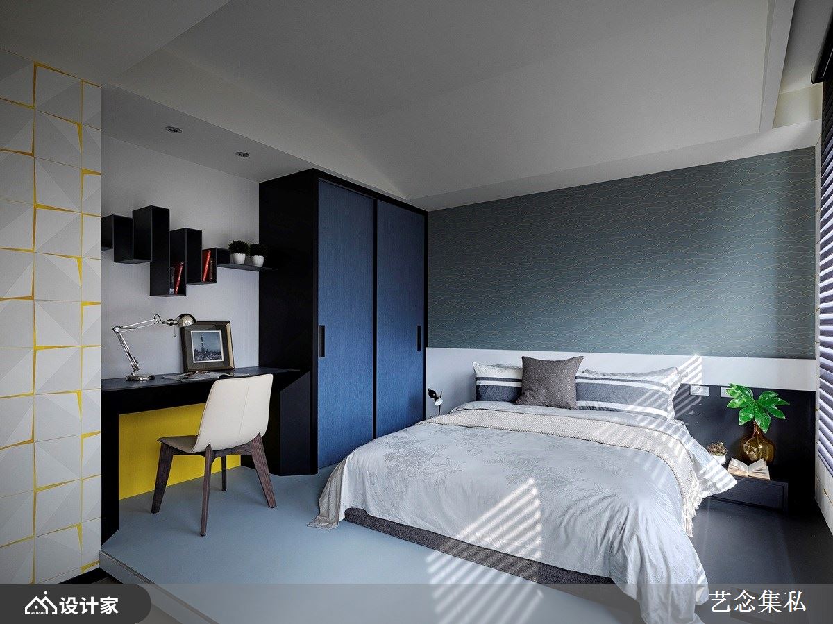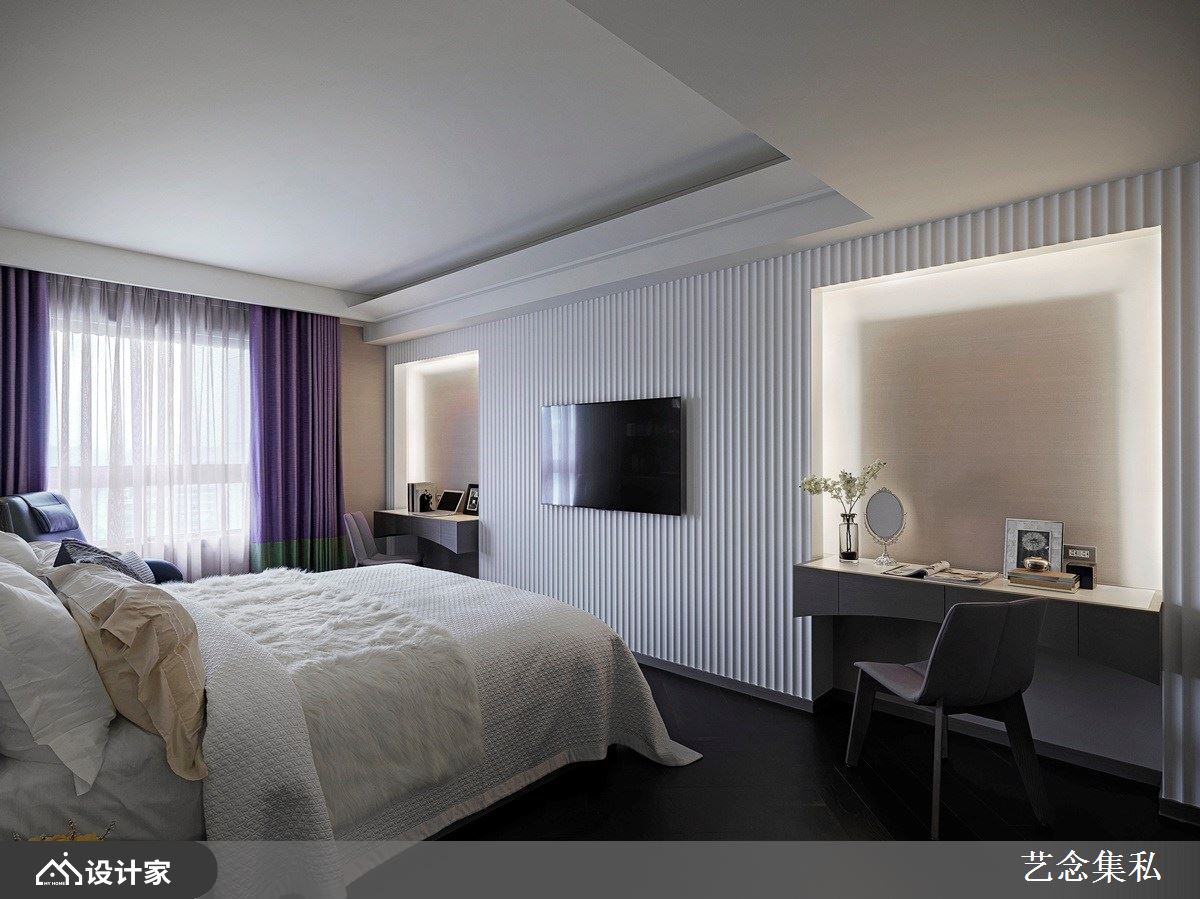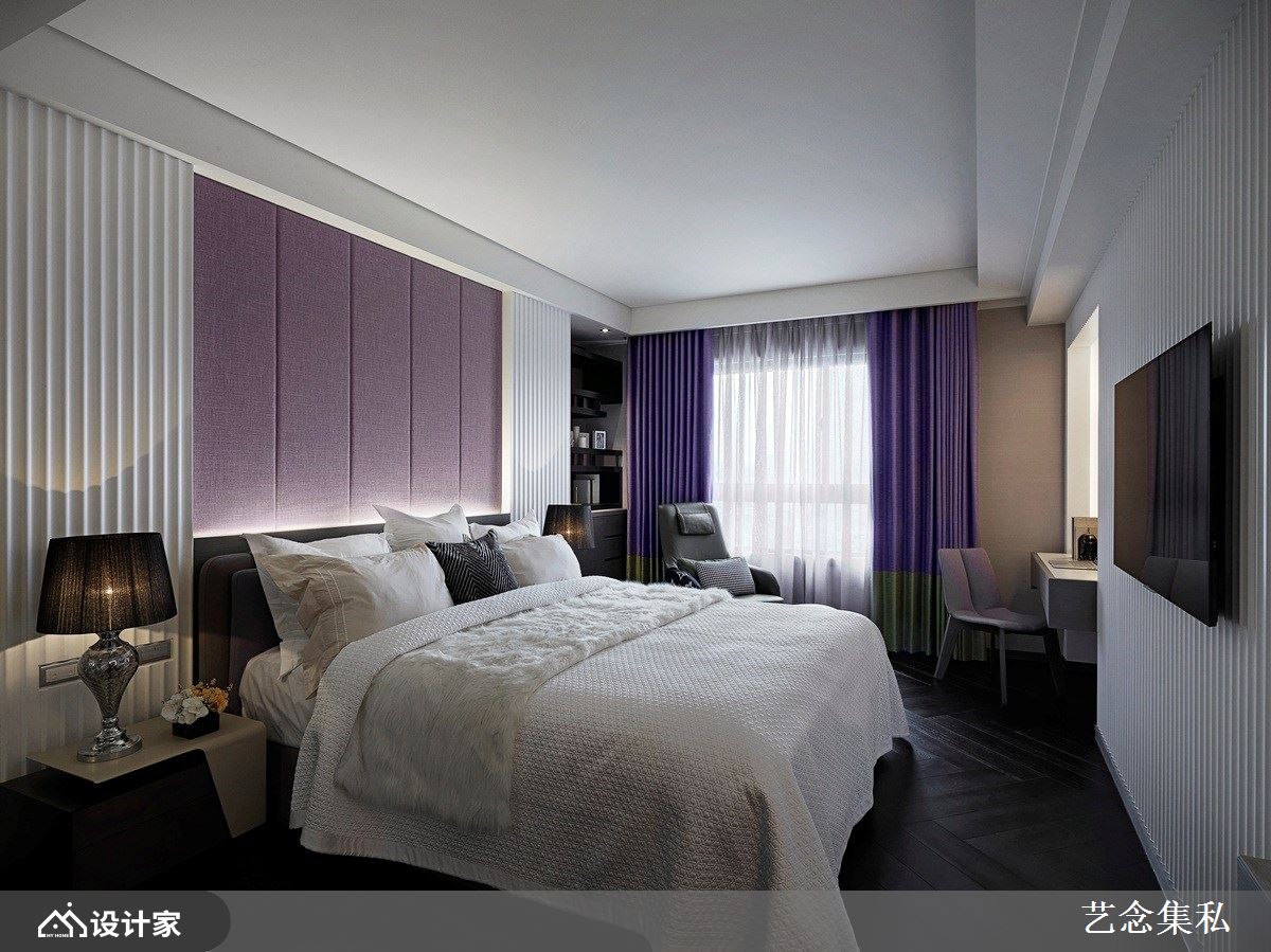 主卧房以淡雅藕紫为主色调,搭配沉稳深色人字型拼接木地板,诠释静谧纾压的私领域空间气氛,在此能好好地慵懒放松,贴心的外部双洗手台设计搭配内部干湿分离的卫生间,让屋主夫妻俩的日常生活使用更加利落便利;另一房则以天晴湛蓝色系为基调,呈现充满活力的空间情境,恣意洒入的日光更增添舒适底蕴。