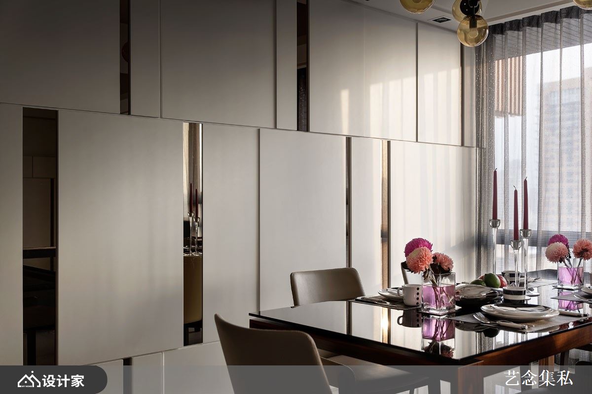 为了诠释豪宅的空间氛围,从玄关步入客厅,将间接照明隐于电视墙内,让光线和缓浸沐于场域之中,并藉由线条比例分割嵌入茶镜,让不同宽度的镜面错落有致,同时增添墙面的肌理样貌。