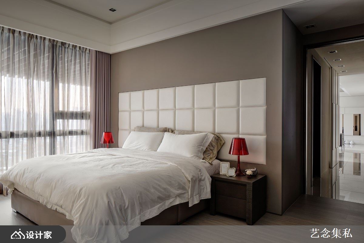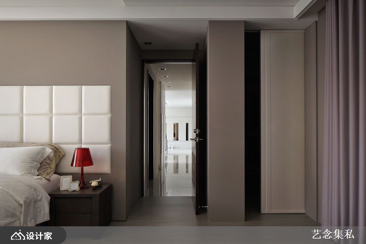 至于私人领域的主卧空间,则加入了沉稳配色作为视觉基底,两盏红色床前台灯成为卧房亮点,收纳柜面延续客厅的线条切割语汇,更衣间除了可以收纳大量女屋主洋装、套装等精美服饰,更有大型柜体能放置名牌包如三宅一生、香奈儿 CHANEL、葆蝶家 Bottega Veneta 编织单肩包等,让出门着装前的穿搭过程更加方便。