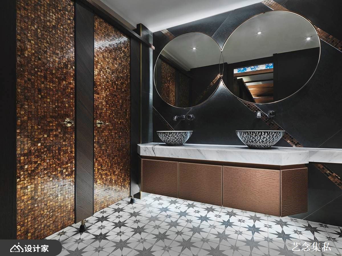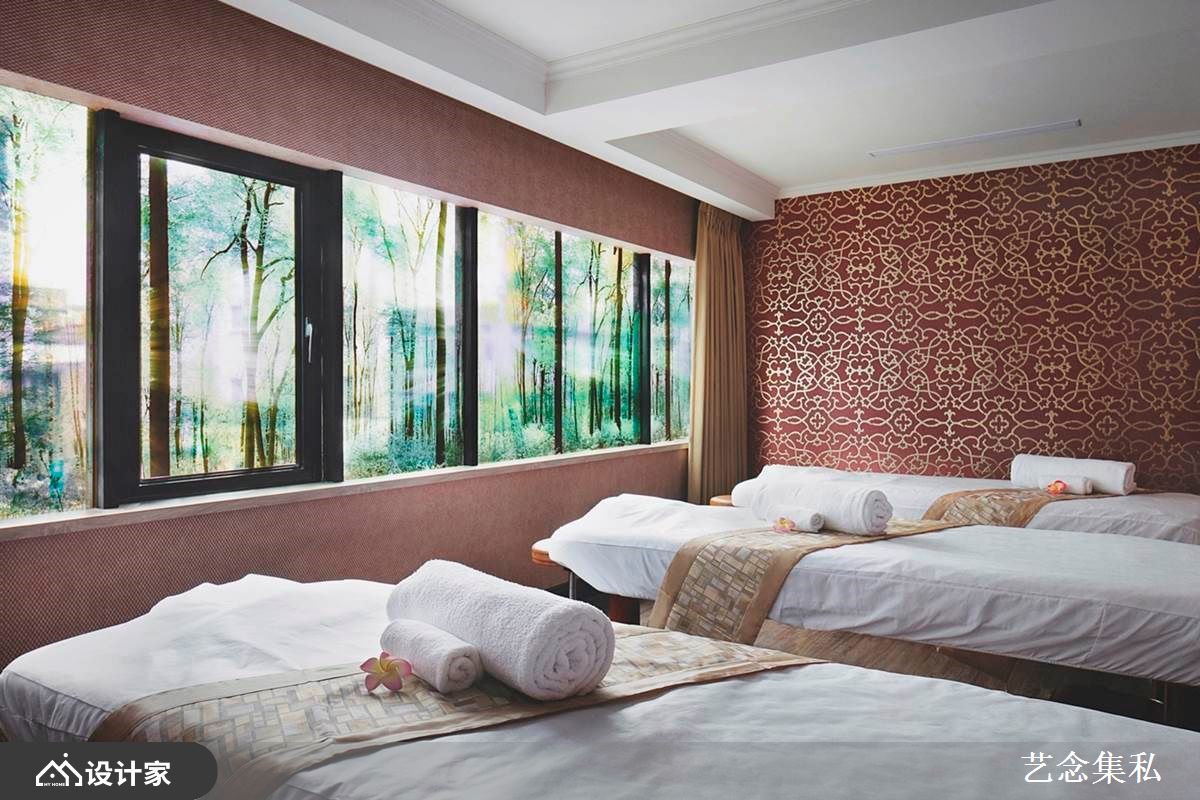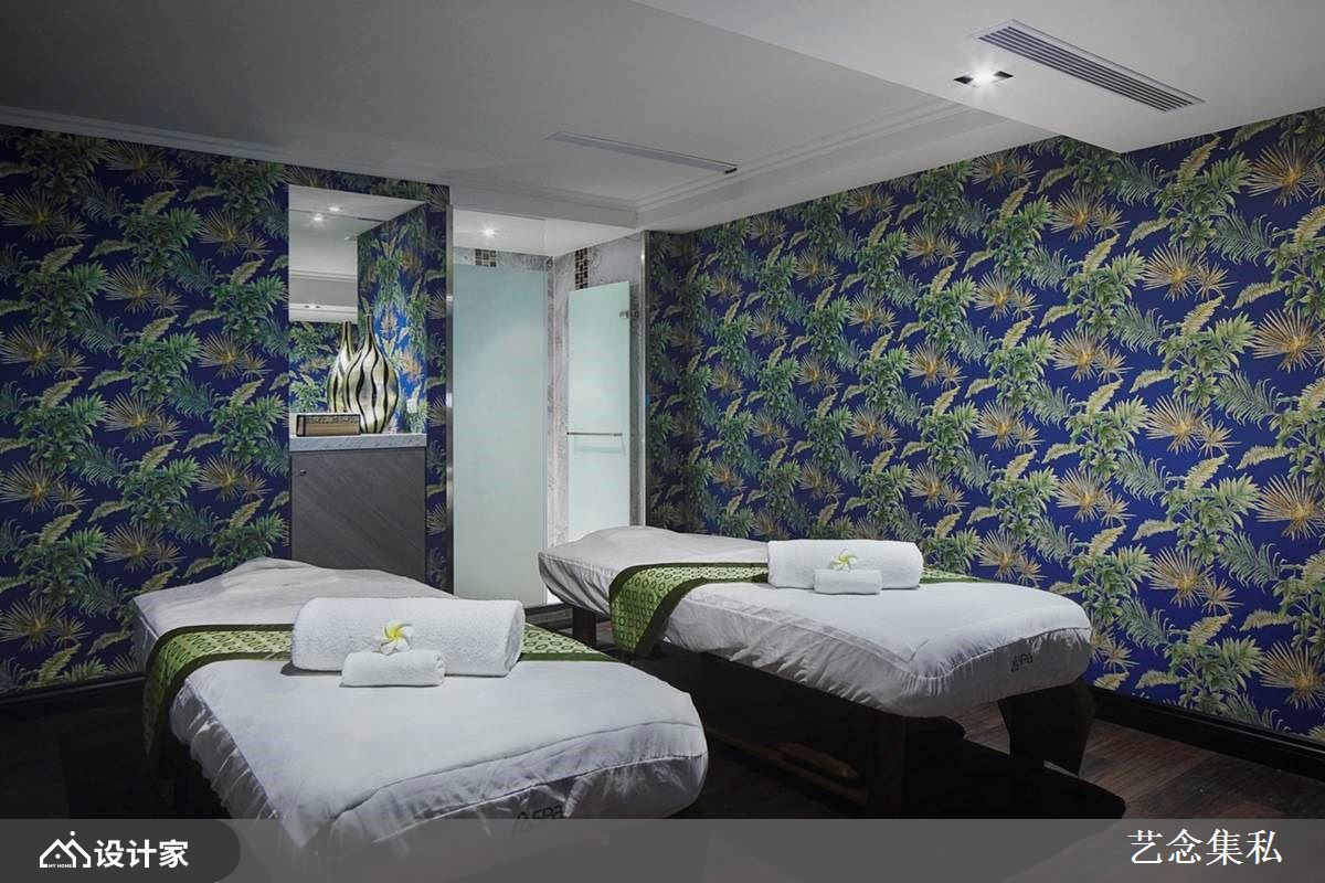 各空间亦给予生动富有灵性的色彩主题,诠释多元的氛围体验。例如油压包间,采用大地色、粉色或花草墙纸,营造疗愈气氛,来到足疗区墨绿之森,还可见细致的黄澄石纹光氛,卫生间选用西班牙八芒星花砖搭配马赛克砖混贴门面,在洗手槽加入东方中式图腾,让轻奢质量延伸至场域各处,让到访宾客可尽享星级酒店般的高质量身心飨宴。