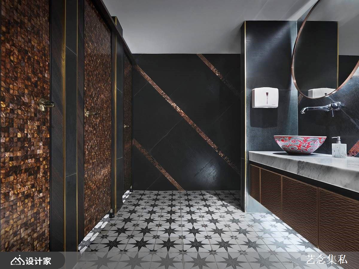 缓步进入大厅,可见一个纵横延展的大空间,如同一个敞开的邀请,吸引人走近,运用大理石建构量体,使空间渲染出泼墨山水般的潇洒诗意,以贵气黑曜搭配金箔棕褐色调,看似斑驳、实则独一无二,使空间增加流动的色彩与生机。