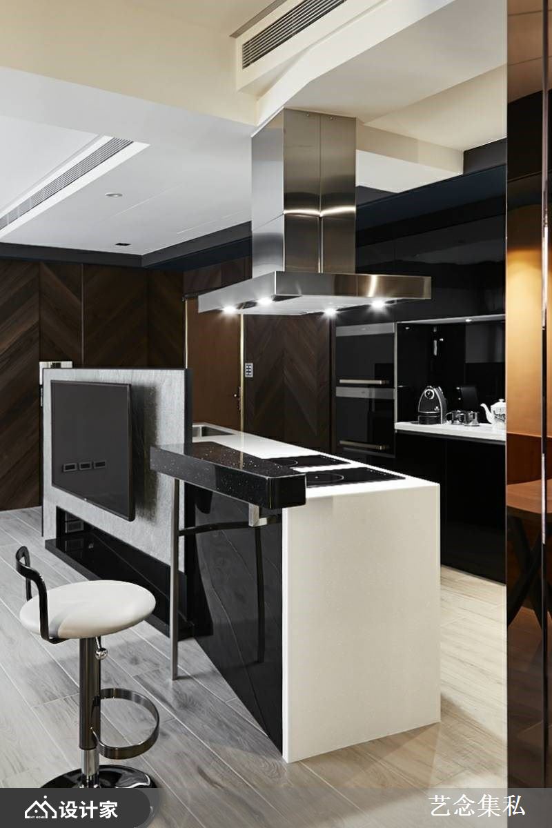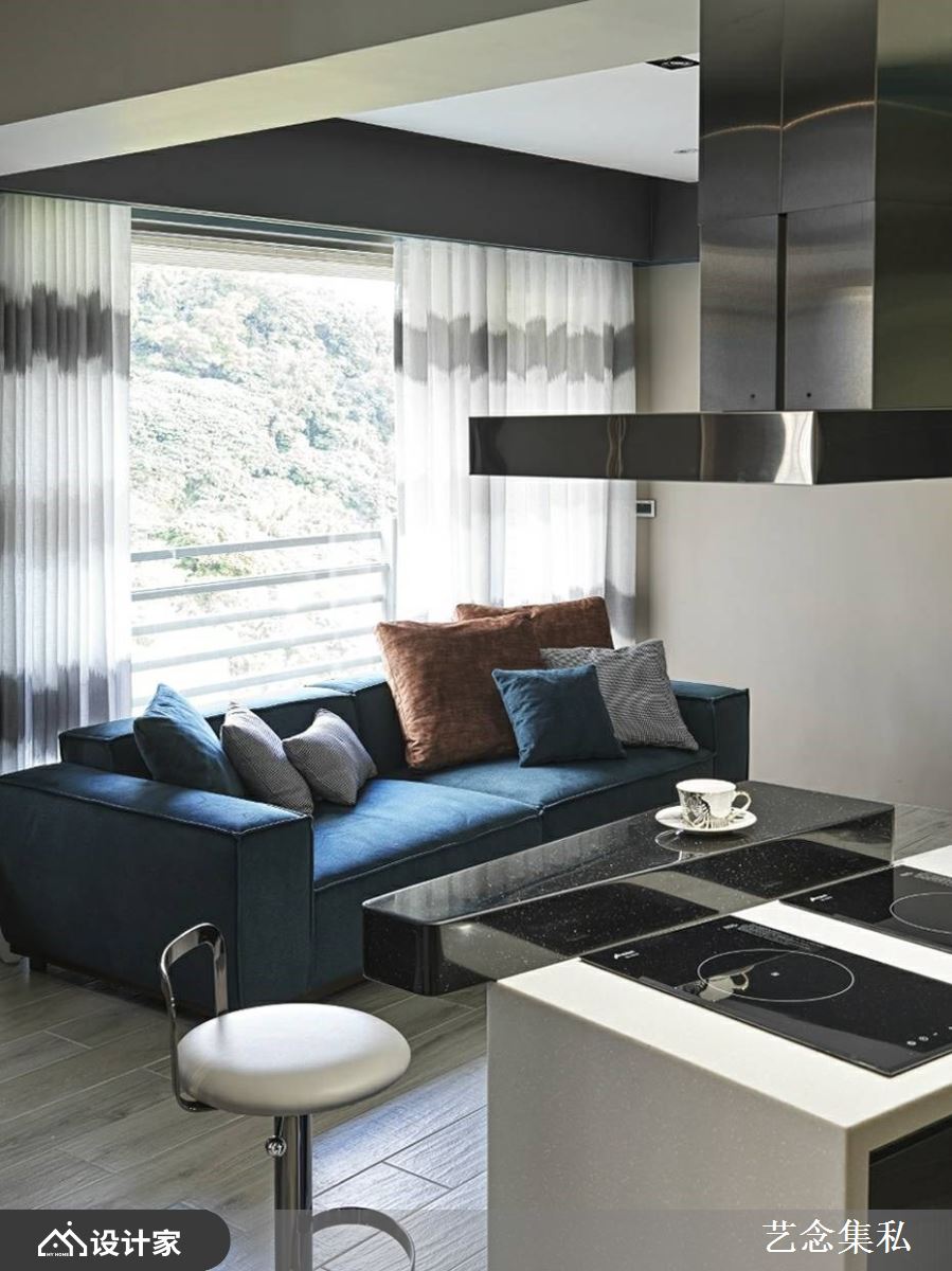 小户型空间经常面临空间不足的窘境,此屋原本客厅空间过大,挤压到其他空间,因此艺念集私以开放式、复合式作为出发点,打造厨房中岛台 + 半高电视墙 + 轻隔断墙三合一的机能设计,不顶天的大理石墙面让视觉更为通透,同时也将霁朗光感延伸至屋内深处的厨房。