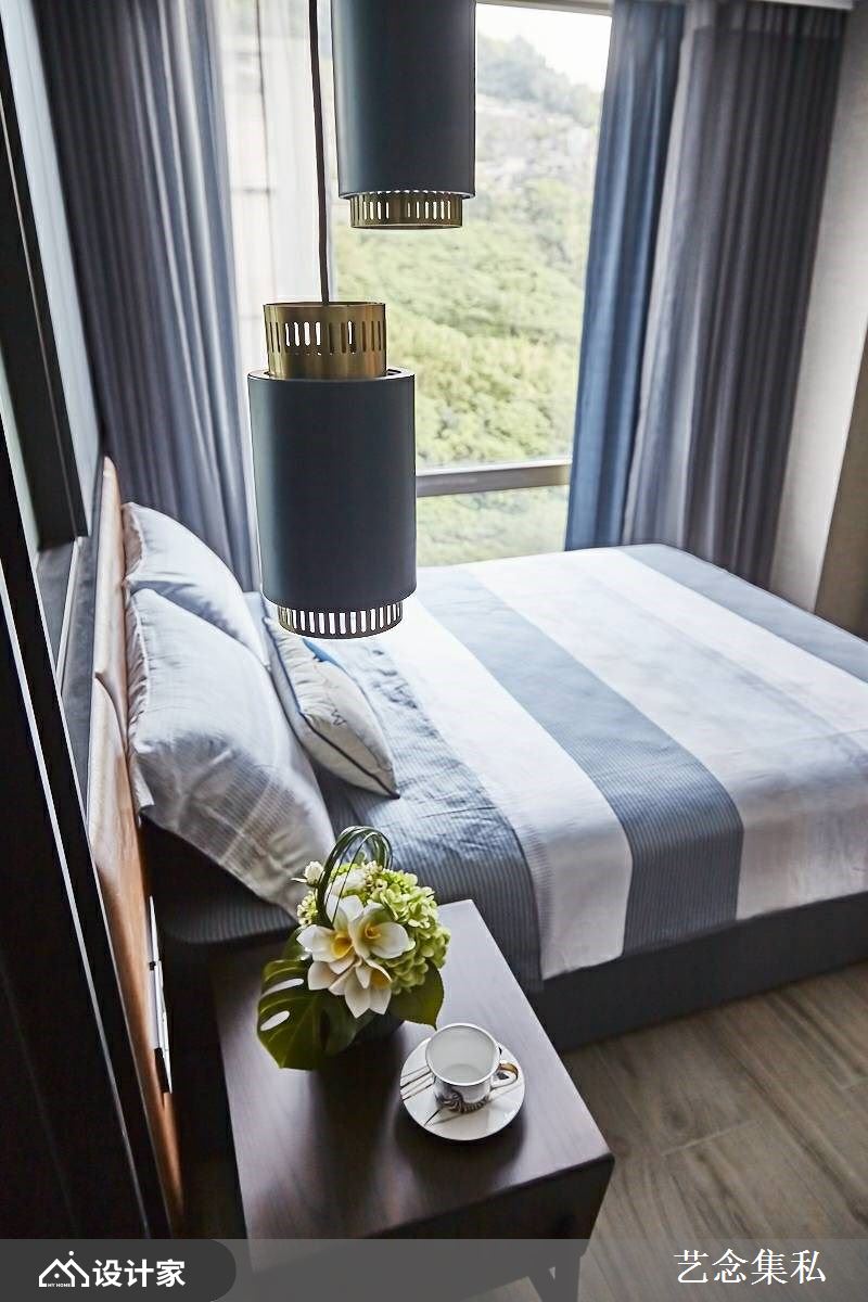 如果空间过于受限,就难以显现大器气势;因此设计总监张绍华、黄千祝在通往卧房的墙面上特意使用隐藏式拉门,节省开关门的空间规划,加上公领域的开放性,将 66 平米空间极致化!鱼骨拼木贴皮门面中间的铜镜饰面更凸显了优雅雍容,小小细节却替整体空间点缀出低调奢华品味。 卧房部分,一方面有充沛采光及窗外绿意延揽入内,二方面运用雾化玻璃营造主卧通透视觉意象,搭配设计吊灯垂挂暖漾澄光,彷佛身处国外精品酒店般慵懒惬意。至于另一间卫生间则延续 “蓝” 的色彩韵味,让里外皆串连同样的高端质感气息。