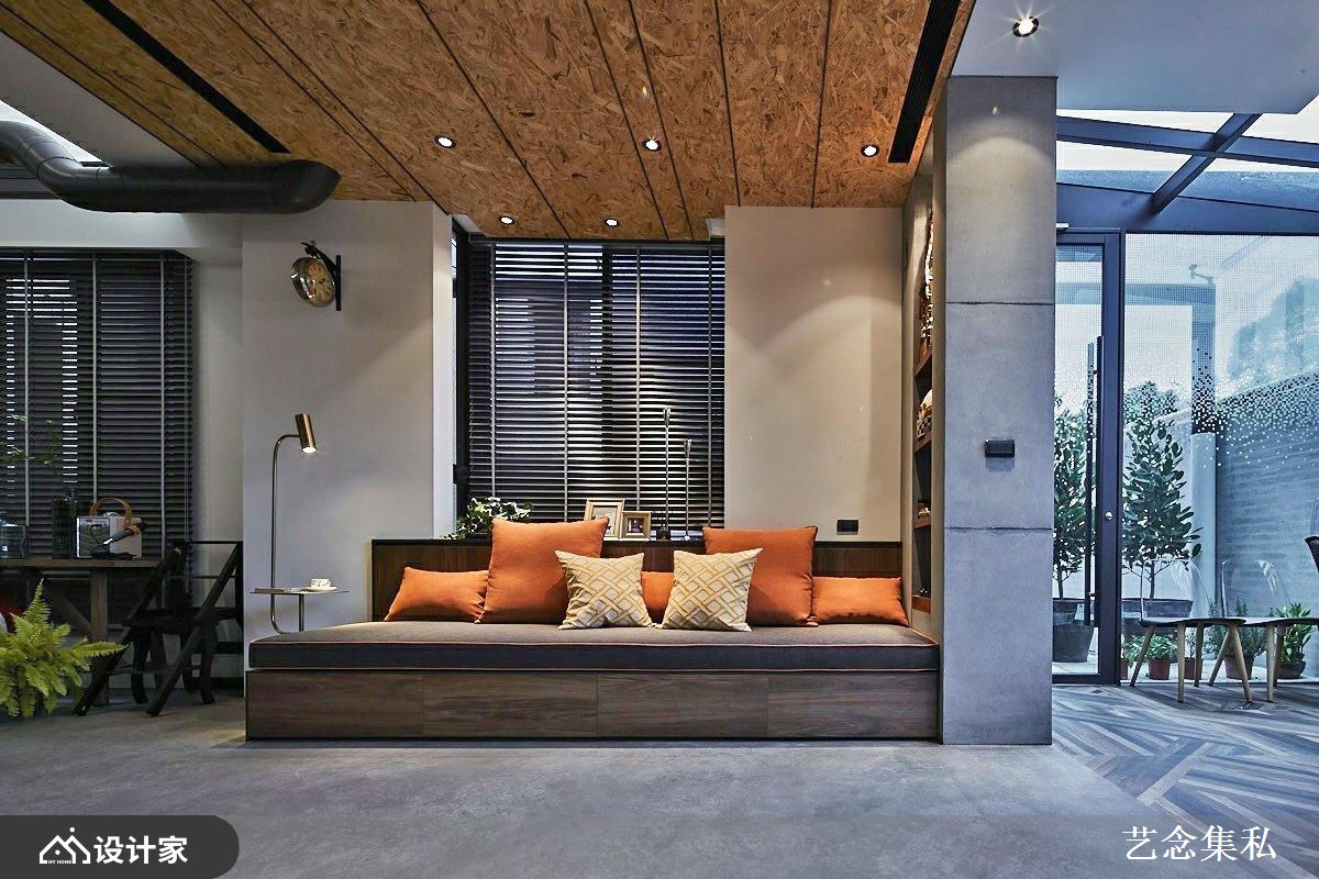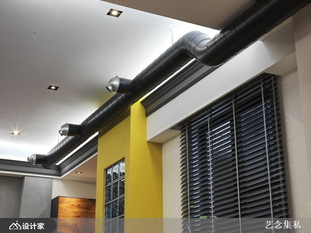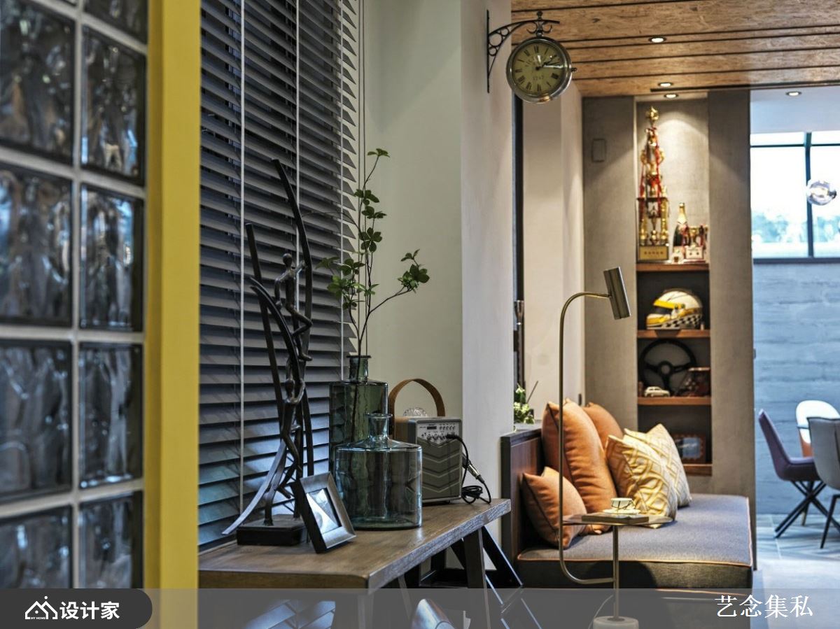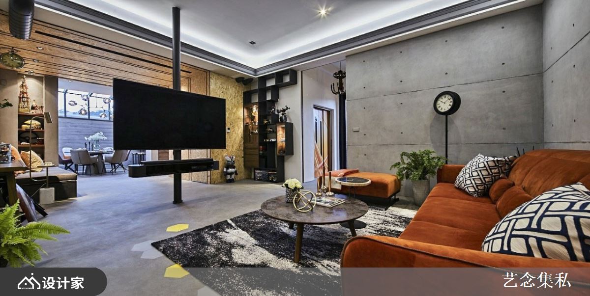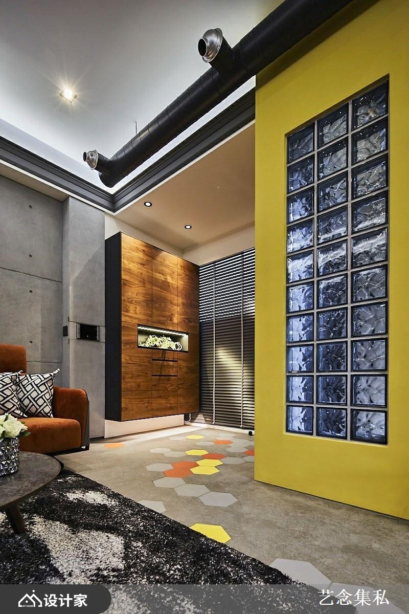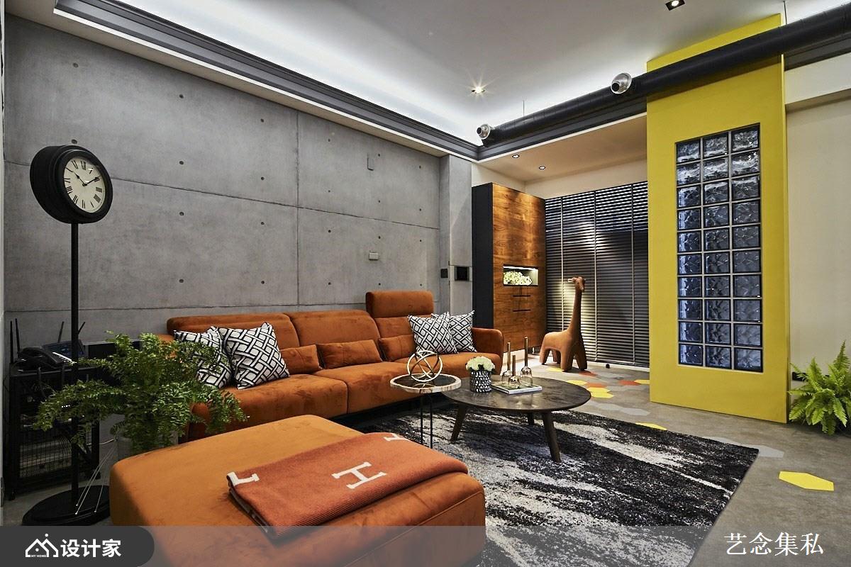 踏进玄关,藉由黄橙色大型六角砖做为动线引导入内,一旁清水混凝土沙发墙搭配铁艺管线、收纳展示柜架,散发浓厚 Loft 阁楼工业气息,又为了平衡工业风的生冷粗犷,艺念集私刻意选用 “爱马仕橘” 沙发做为空间场域的色彩计划,再以嫩黄、植栽点缀其中,让步入客厅时便能感受到温馨暖漾的家居氛围。
