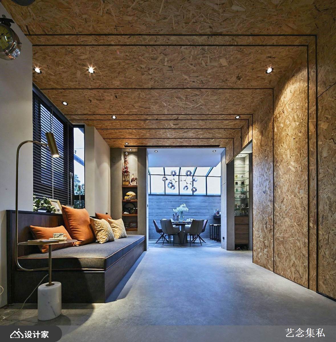 然而豪宅空间宽敞,不代表平面配置可以等比例放大,而需考虑电视与座位之间的黄金距离。设计团队以大屏幕电视做为客厅空间的中界,轻盈划分出电视沙发座位区及椅窗雅座;回到家想慵懒入座看电视时,便可待在大型沙发区;如有多位亲友宾客造访,从客厅步入至餐厅之间的座位区更是惬意闲聊的好地方,此处 OSB 板从墙面延伸至天花板,不但隔热且又环保,另一方面,电视也可旋转至此,方便家人调整至各个角度一起观赏电视。
