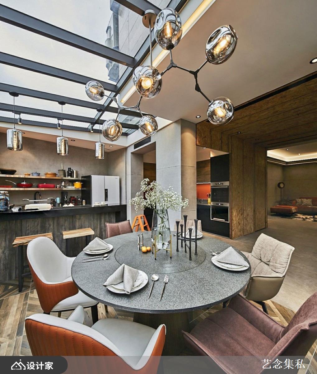 继续向后走,便是开放性厨房及餐厅,Lindsey Adelman 造型吊灯成为空间最吸眼球的焦点设计,替空间臻全了质感氛氲,再加上还有高脚吧台轻食区域,休闲雅致的生活步调就此展开,厨房、吧台、餐桌三大空间了满足现代家庭对于宴客餐叙的需求,高阔开朗的日光玻璃用餐区援引充沛光感;当夜晚降临,静谧夜空随之铺填幂盖餐厅空间,自述着丰仪风情。