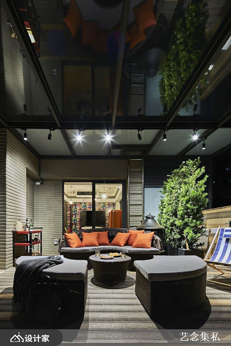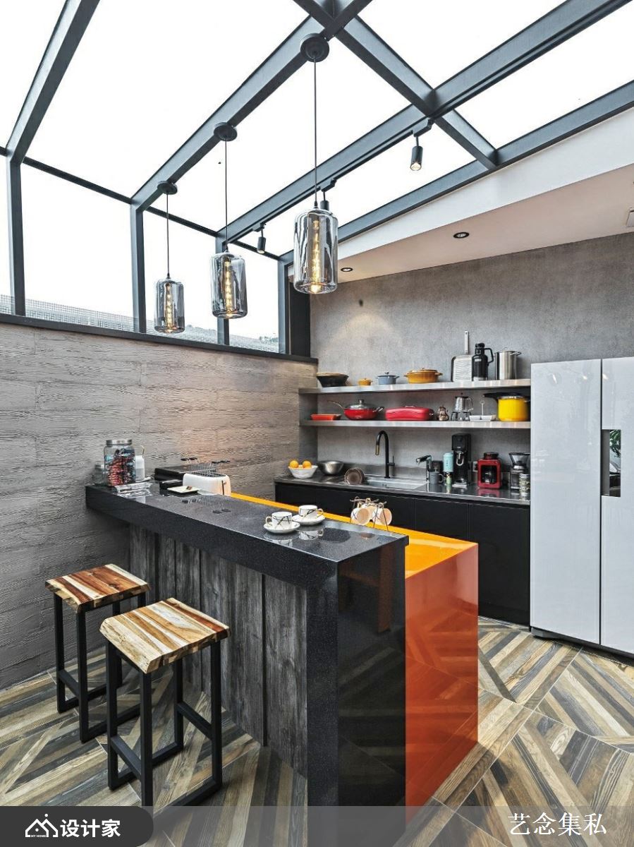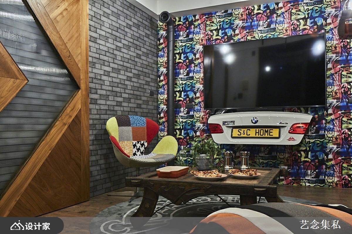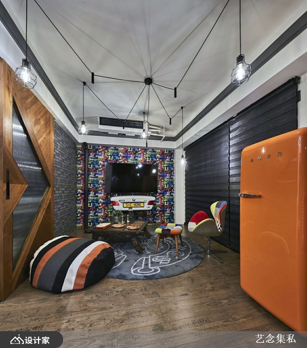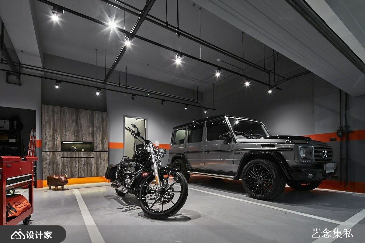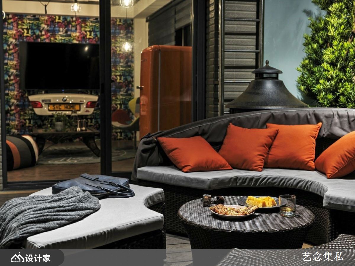 顶楼楼层除了能烤肉、品茗、小酌,更是招待宾客的半开放型派对场域,大屏幕电视搭配 B&W 后车盖、街头涂鸦墙纸,风格集汇而缤纷有致;拉开落地窗,摆放户外藤制家具,铺上软垫便适合在此来场休闲派对生活,夜晚时分还能观赏星空,十分惬意。 最后,由于男屋主喜爱骑重型机车,艺念集私团队也一并将车库做了装修,藉由铁艺轨道灯打造微工业风的空间样貌,亮橘色贯穿着整栋建筑内装的同时,也延续成为车库的色彩应用,这里就是专属于男屋主的秘密基地。
