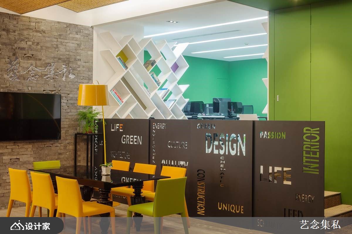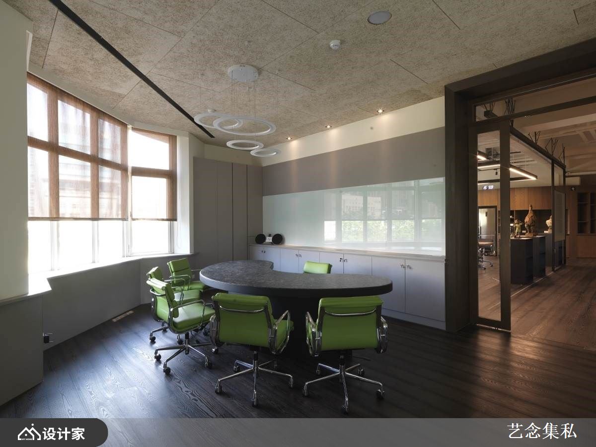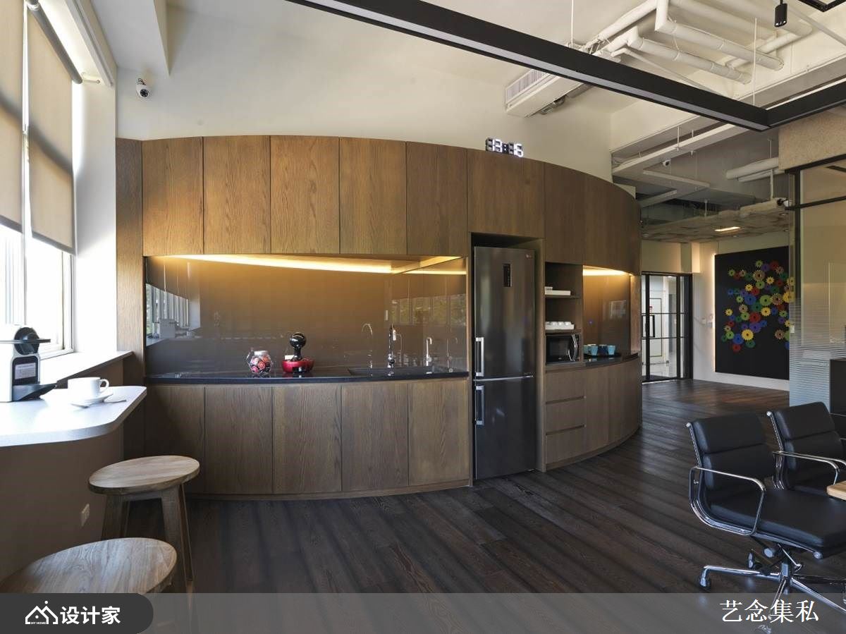 作为新创投资公司,办公空间需强调具有易于沟通、讨论的空间配置,以及便于简报开会的实用机能,因此设计总监张绍华、黄千祝以开放式工作空间(Open-plan office)作为主轴,茶水间与两个会议长桌采用通透无隔间的规划;再加上业主希望避开锐角的设计,艺念集私将茶水间化为美型 “弧线” 柜体,替空间打造独一无二的弧线收纳柜墙面,除了结合冰箱柜、水槽之外,更能摆放微波炉、烤箱及咖啡机,替宾客准备咖啡茶点时更加随兴与惬意。