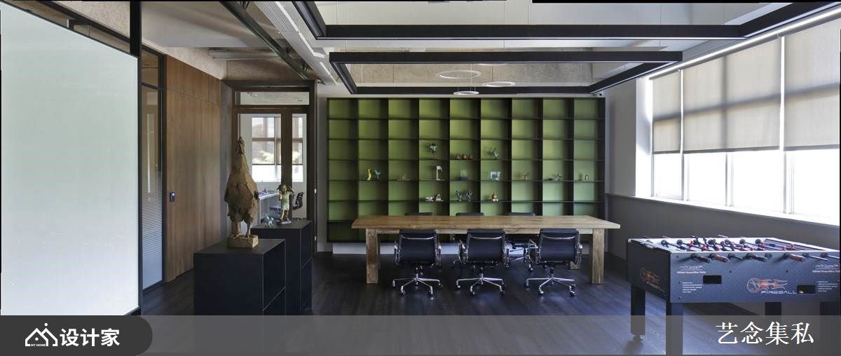 在空间调性上,以沉稳深色木质感搭配轨道灯,形塑办公空间的内敛都会气息,再辅以业主的木雕收藏品作为点缀,以及趣味十足的足球台,巧妙模糊办公与休闲的氛围界线,替空间增添一抹亲切逸趣。