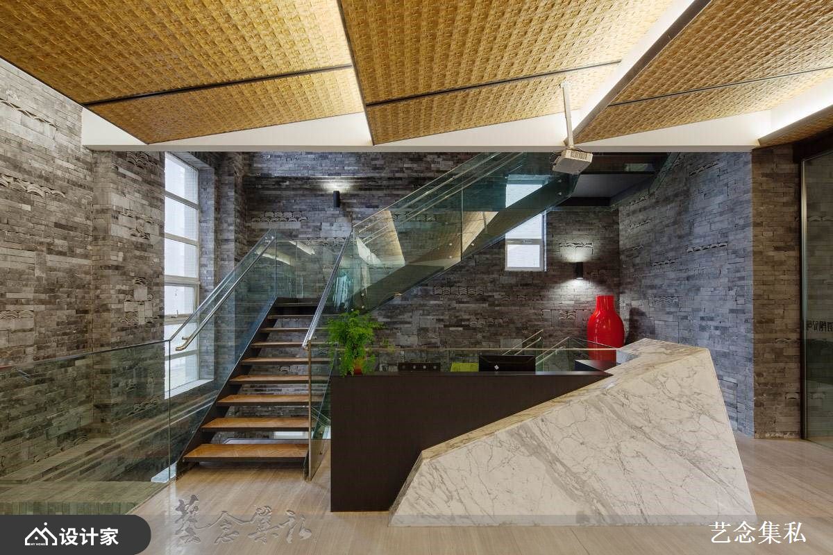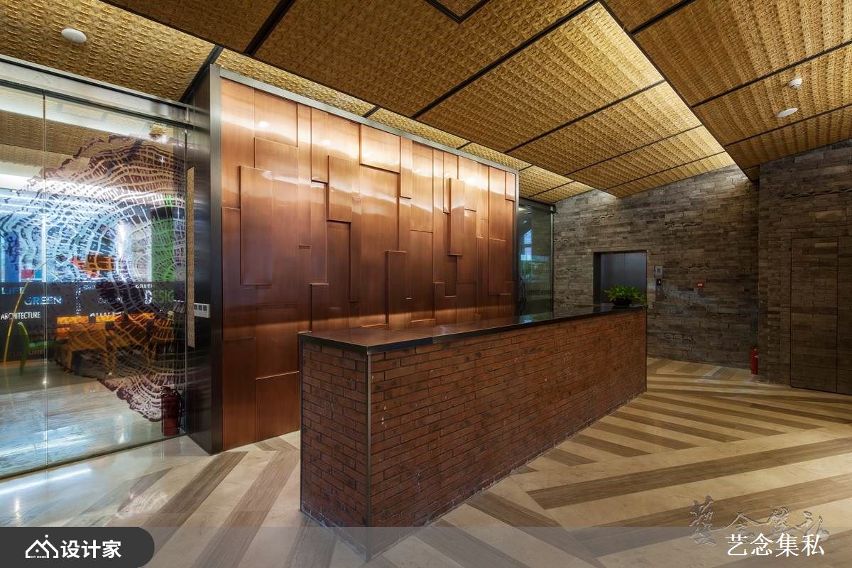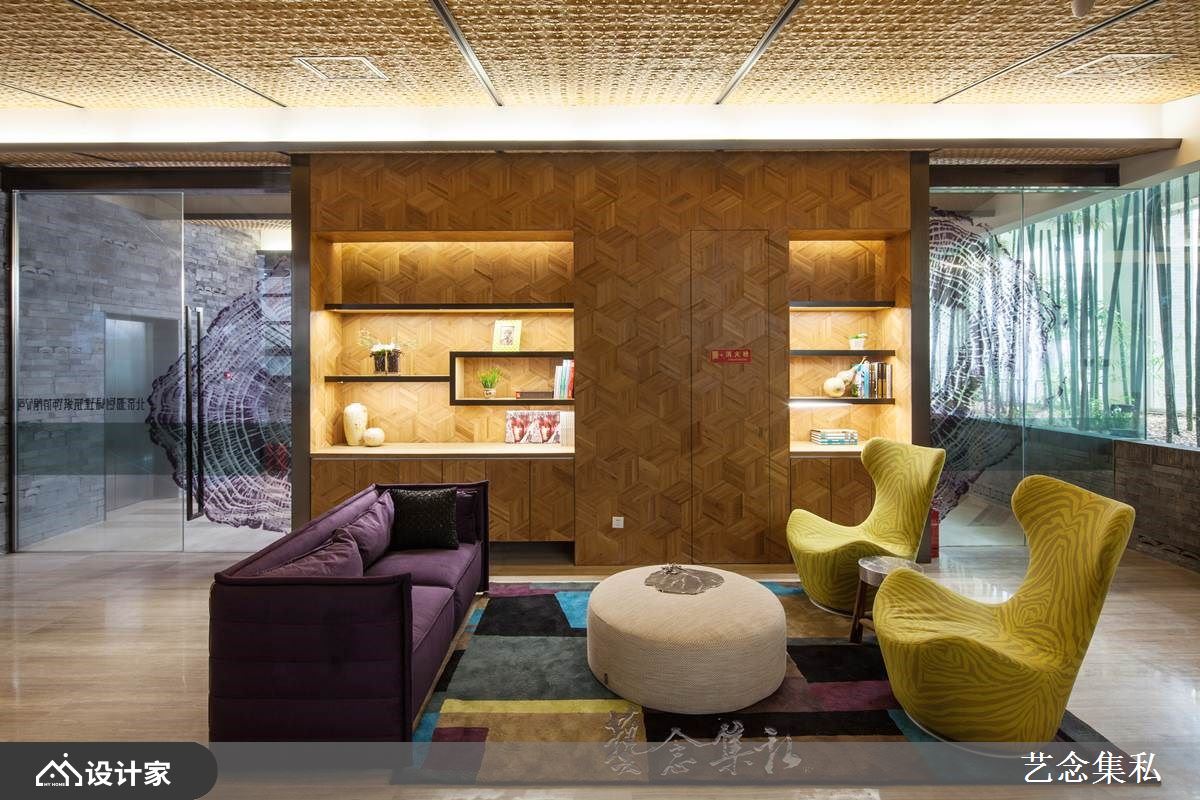 此案为艺念集私设计团队设计的北京办公室,为了突破豪宅装修设计办公室予人的刻板印象,设计总监张绍华、黄千祝摆脱窠臼框架,以创新姿态运用许多亚洲与中式元素作为设计亮点,像是竹编天花板,藉由间接照明让光线轻抚表面,展现竹编脉络肌理。 而两侧砖墙则散发人文风雅,灰砖古瓦的层迭与穿插,有如缓缓诉诸北京悠久的历史风韵,与柜台的红砖遥相呼应,此处背墙更以红铜材质、对应到鲜黄色调的意大利精品灯具品牌 Foscarini 的 Twiggy 立灯,更跳色搭配黛紫色沙发座椅,缤纷奔放的色彩计划,混搭出专属于艺念集私的设计性格。