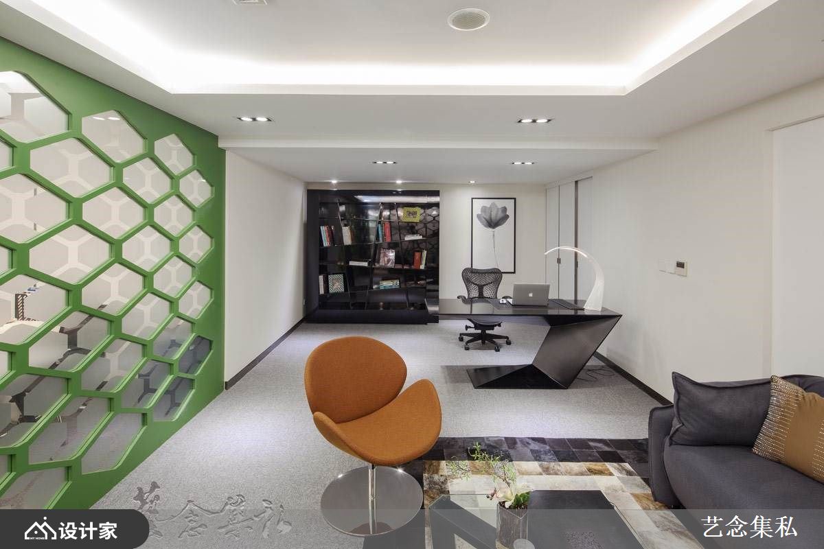 步入地下室,乃是工作区域与会议厅之所在,同时也有建材展示区域。为了保持空间视觉的通透性,刻意运用白色几何造型柜体作为轻巧隔断,菱形与长方形彼此相间,不规则的错落排列替空间作了表情变化,同时也增添书籍杂志的收纳量、避免产生过度封闭的视觉调性。