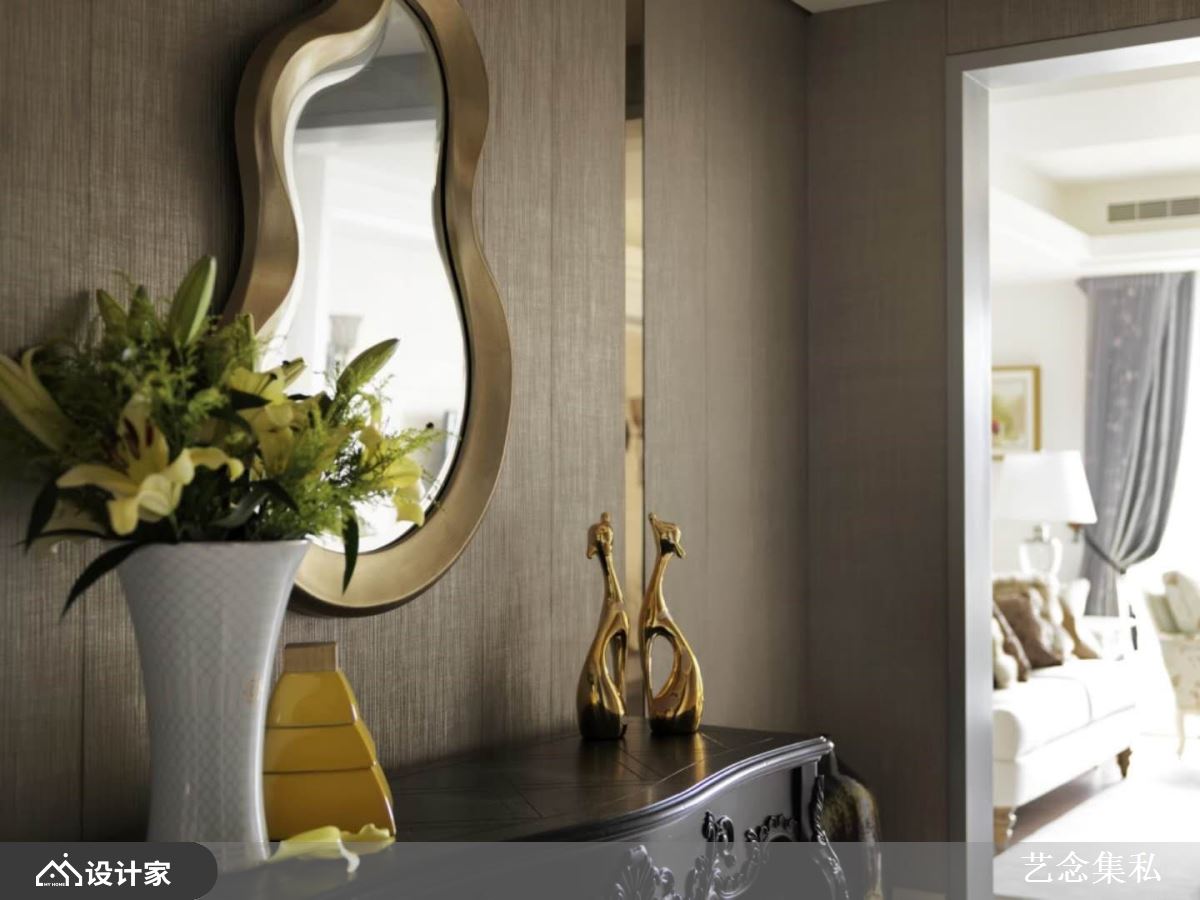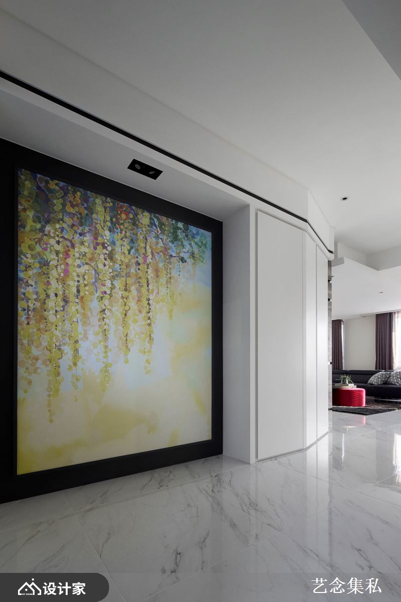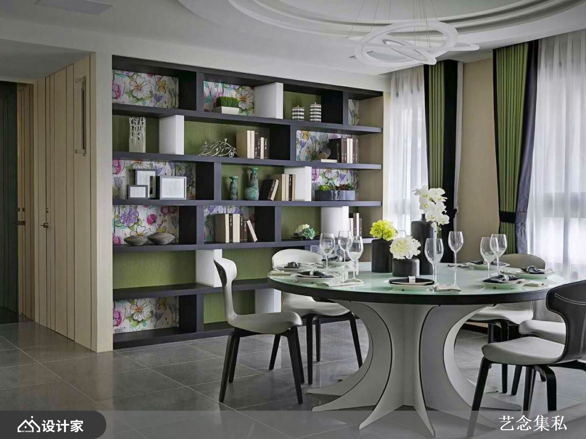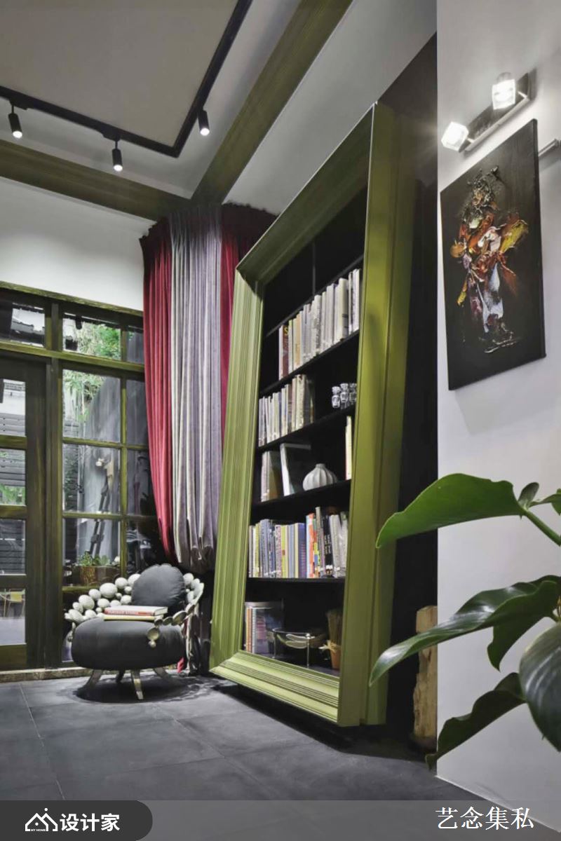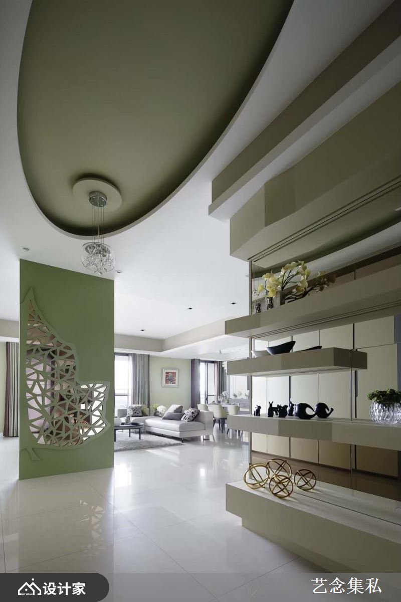 或为展示柜架的背墙及方框,有如茵茵嫩草般的色调,不但和植栽呼应着自然情愫,更让空间里的绿意视觉有了延伸性。此外,艺念集私善于运用不同建材层迭出色彩情景,例如客厅里有如泼墨山水般的大理石墙面,有着连绵山峦或叶纹脉络的内蕴意象,细细勾勒出大户人家的高端品味。
