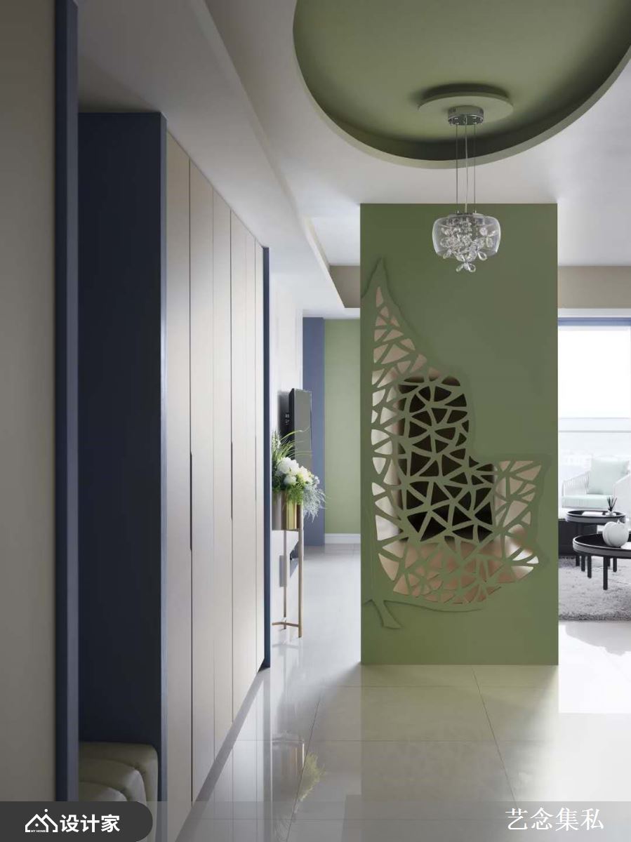 绿意象征大自然的万事万物,应用在室内空间内,除了营造舒缓惬意的家居情境,也和纯白色调有着绝佳的搭配效果,像是玄关艺术挂画以柳黄嫩绿作为主色调,和白底灰纹的大理石营造简敛素雅的豪宅底蕴;抑或是浅色调性的竹青翡翠隔断屏风,绿叶造型更增添了空间趣味性。