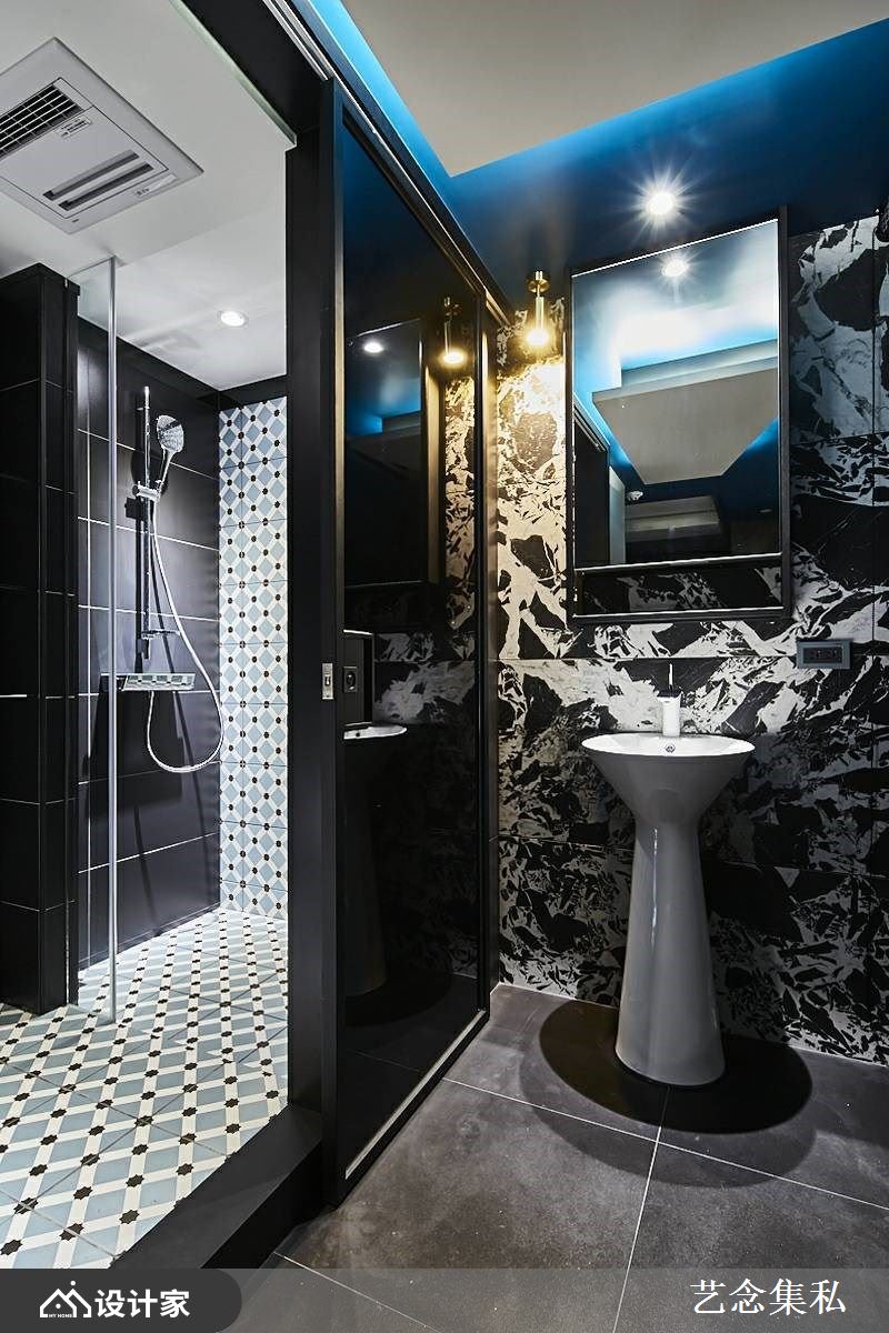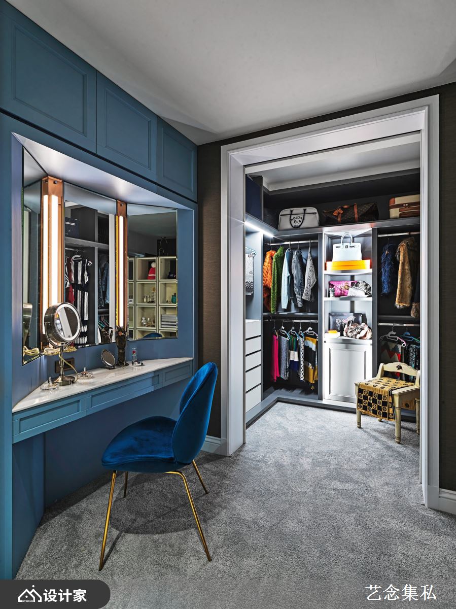 提及多层次色彩搭配,像是首图客厅空间的湛蓝沙发巧搭黄铜灯具与粉紫窗帘;抑或是同一色系的深浅浓淡之变化,例如主卧房灰蓝色化妆台与钴蓝色单椅;或为蓝天白云般的卫生间设计等,藉由淋浴区域的马赛克砖与白色大理石洗手台共衬出惬意悠闲气息。