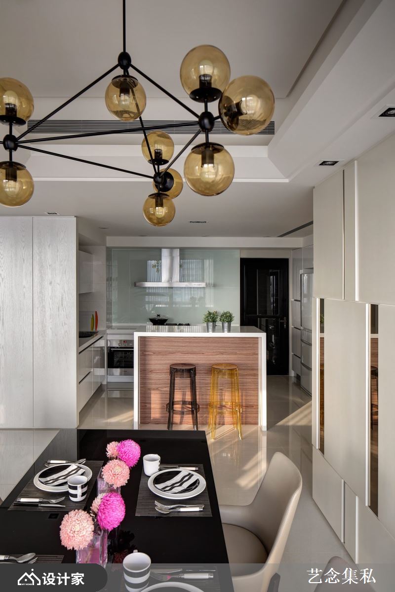 开放式餐厨空间方便和好友们热络聊天,除了配置餐桌餐椅的用餐区域之外,更有中岛吧台便于一边下厨、一边和座位上的亲友轻松闲谈,吧台椅拉近了烹饪、泡茶、泡咖啡时人与人之间的距离,不需因备料或冲泡饮品而中途离开友人话题。且开放式动线设计使空间更加通透宽广、便于走动,也有助于多人小派对的嘻笑热闹气氛,后方更可以放置咖啡机、气泡水机等厨房小家电,缩短进出厨房的时间。 重要的是,大家在此处话题不间断、彼此畅快闲谈,让用餐时刻充满欢笑,留下真挚情谊。艺念集私设计团队经由多年豪宅擘划经验,整合机能空间的同时,也深度洞察屋主生活型态与社交需求,将之打造最适切的整体动线,以及专属于屋主风格的家居情韵。