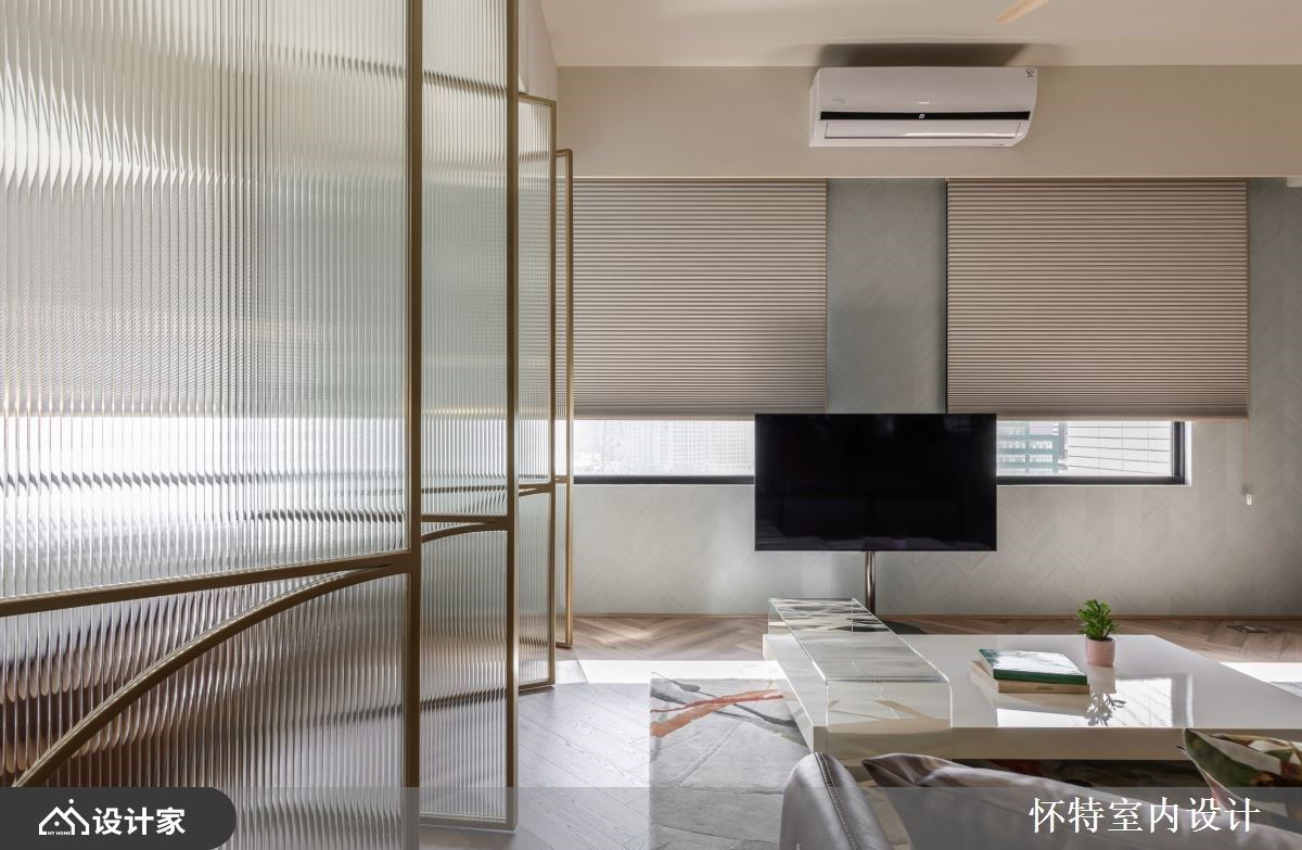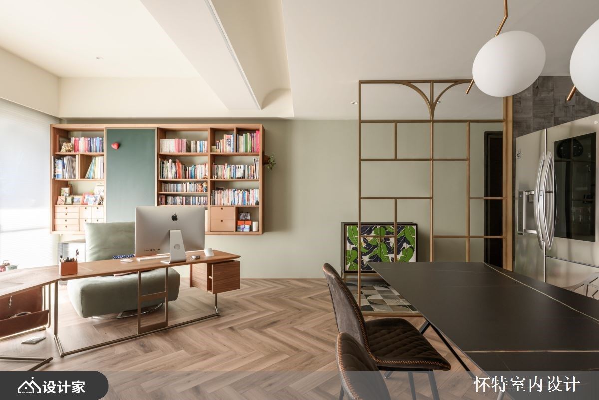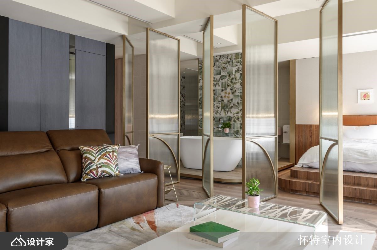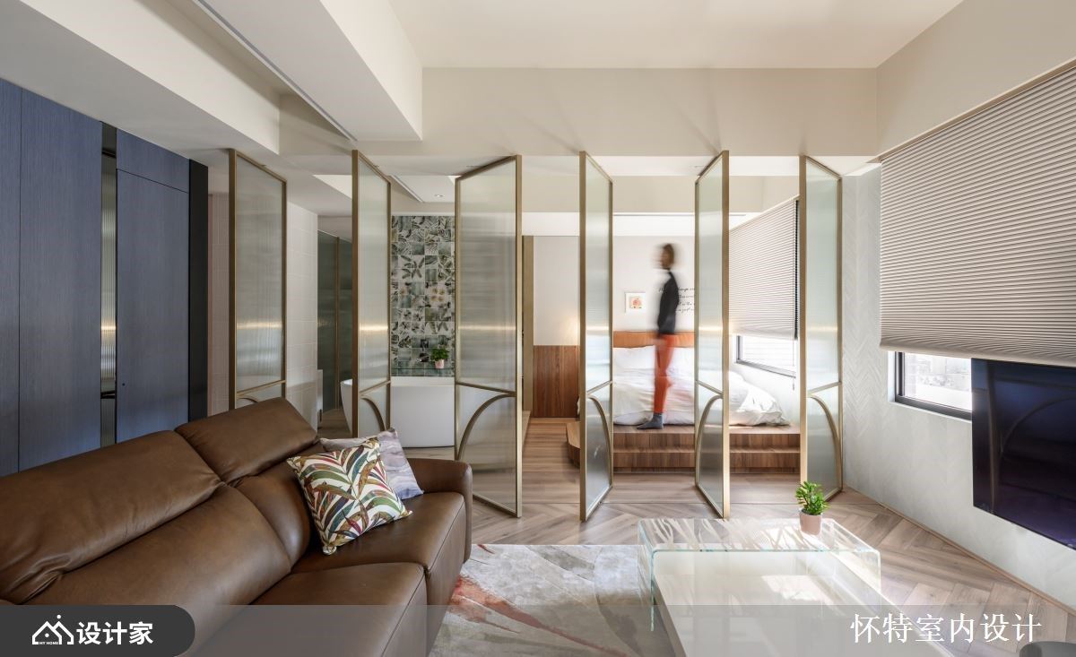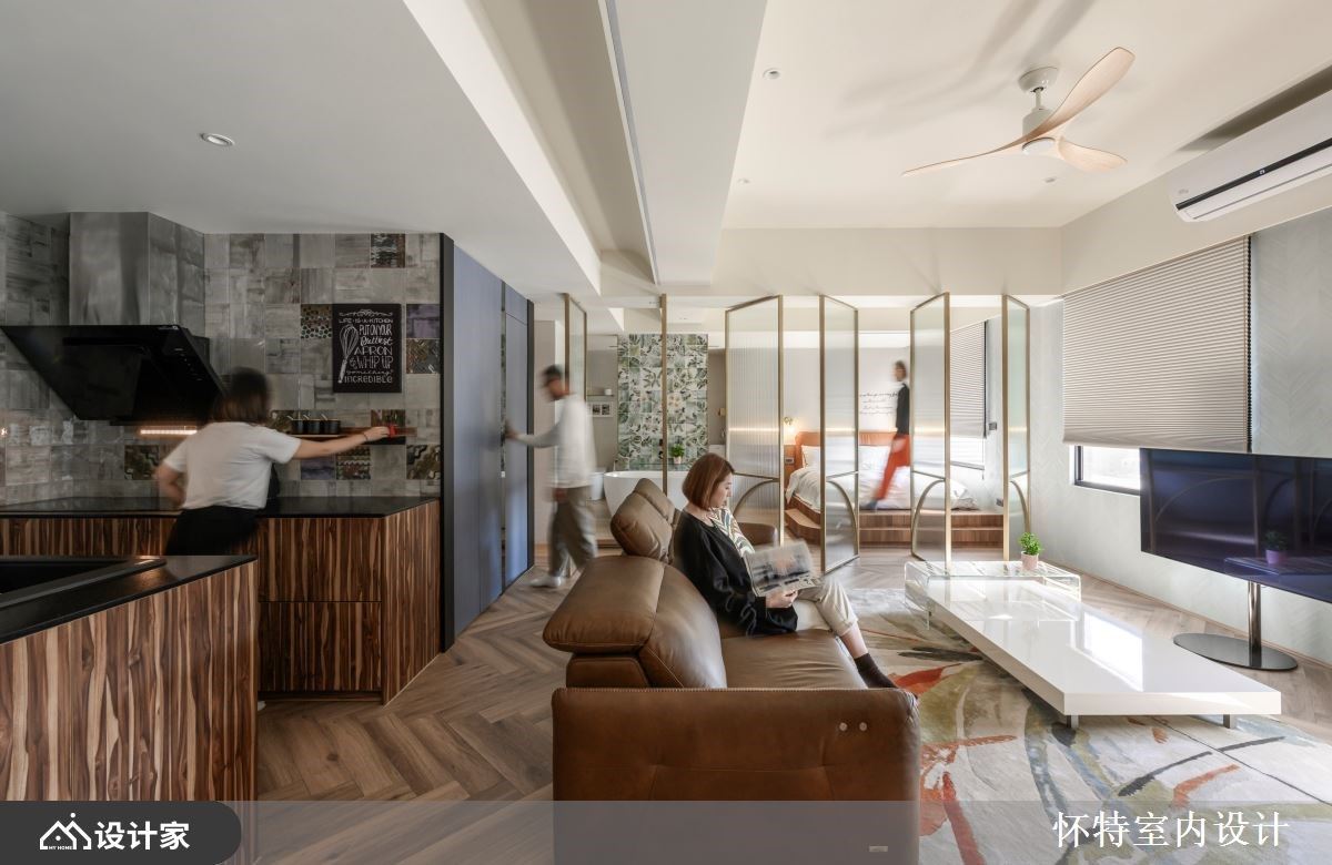 大胆开放的混搭风住宅,已是怀特设计与屋主的第三次合作,彼此默契十足,第三间房子成为设计师与屋主共同激盪、创作的成果。只有夫妻俩的生活空间,以全开放的设定,保留 99 平米的宽敞,玻璃隔门予以私领域独立隐私,开阖之间,打造若隐若现的两人世界。 全开放的空间中,以人字拼木地板带来第一个特色,并由清爽色彩、轻奢气息定调室内风格;领域之间透过不同的材质、色块作为隐形界线,如餐厨区浓重色系,框出开放中岛厨房的清晰范围,厨房瓷砖浓淡由男主人亲自铺排,再由职人手工拼贴,由屋主拼出属于自己的个性居家。客厅电视区以轻盈的旋转柱,予以弹性使用机能,搭配淡淡的牆面刷色与洁白的茶几,製造开放敞亮的舒适感,而通往私领域的廊道上,再刷上灰蓝漆面,铺陈回到睡眠空间的静谧与安定力亮。 小编的最爱 居室与泡澡空间规划在同一领域,透过透光不透人的玻璃门,打造一个人时全开放,两个人时关上的弹性使用机能,创造出跳脱框架的空间格局。寝居区的泡澡区与双人梳妆台,犹如装置艺术的设计方式,实用与美观兼具,让梳洗环境舒服又唯美。
