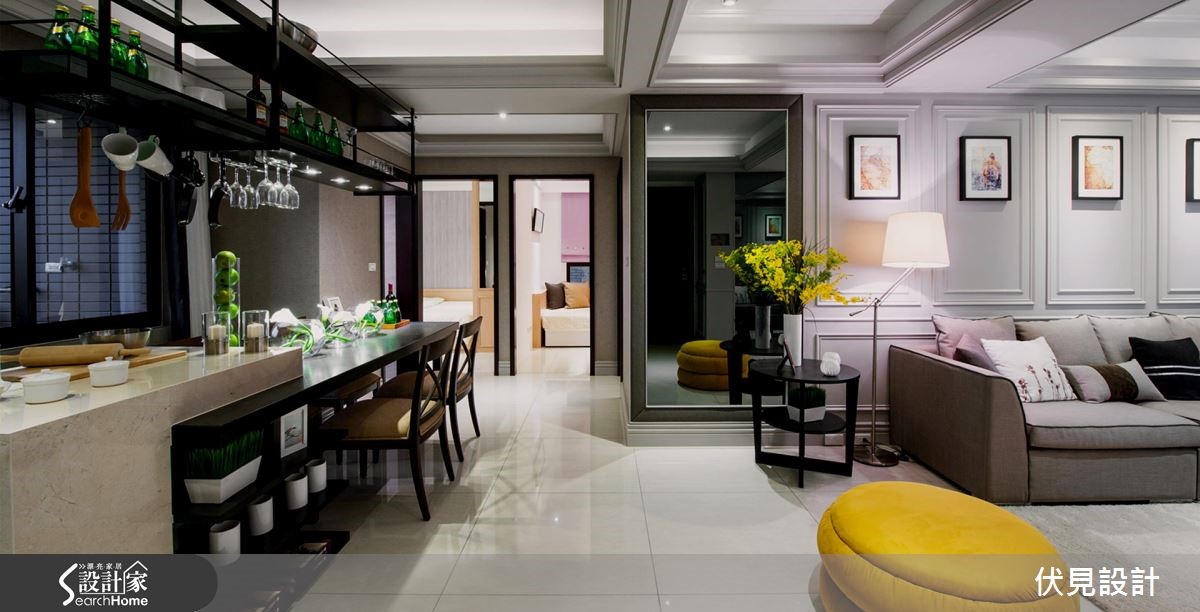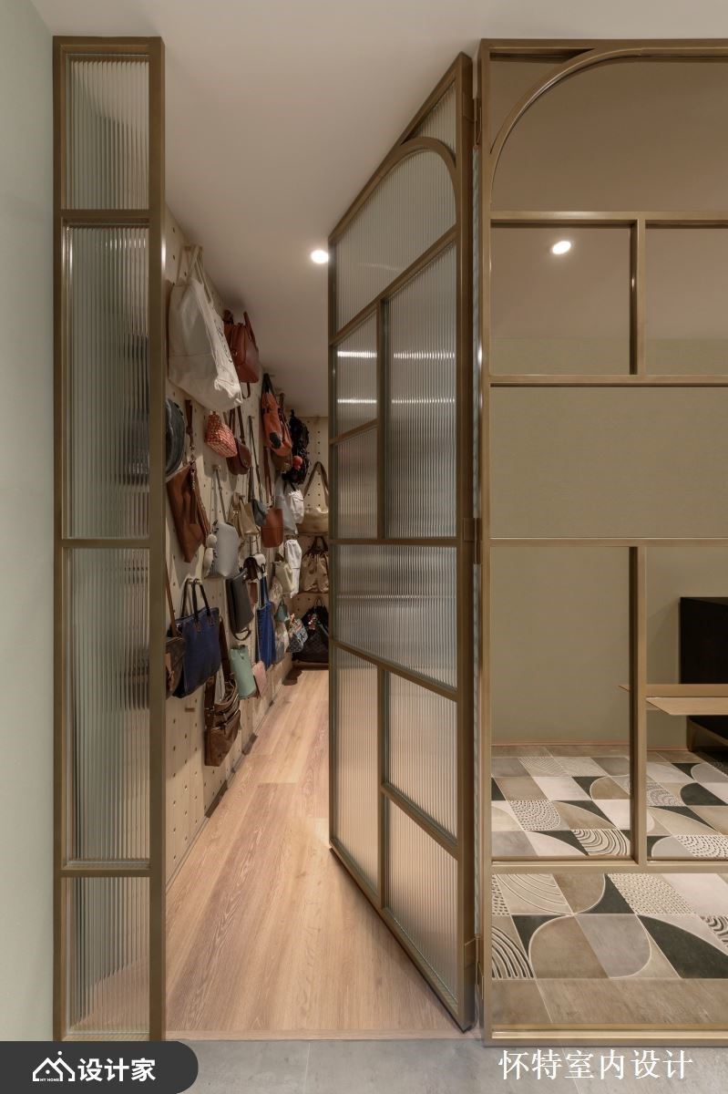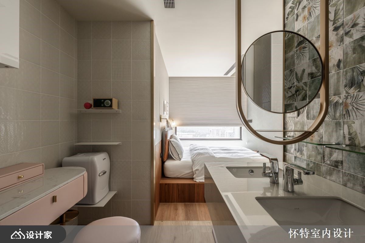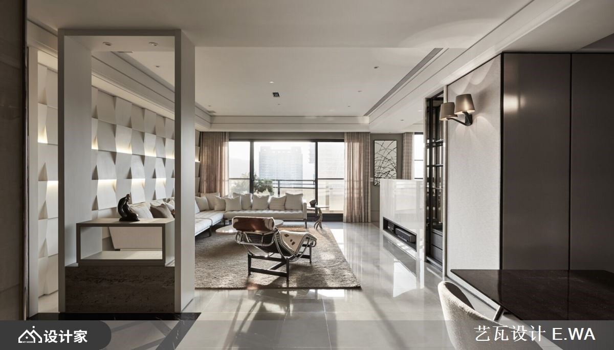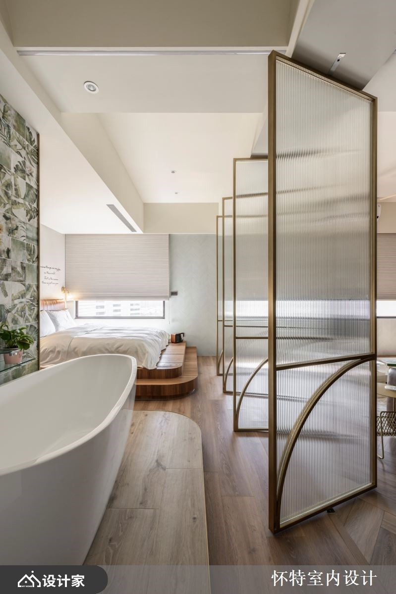 大胆开放的混搭风住宅,已是怀特设计与屋主的第三次合作,彼此默契十足,第三间房子成为设计师与屋主共同激盪、创作的成果。只有夫妻俩的生活空间,以全开放的设定,保留 99 平米的宽敞,玻璃隔门予以私领域独立隐私,开阖之间,打造若隐若现的两人世界。 全开放的空间中,以人字拼木地板带来第一个特色,并由清爽色彩、轻奢气息定调室内风格;领域之间透过不同的材质、色块作为隐形界线,如餐厨区浓重色系,框出开放中岛厨房的清晰范围,厨房瓷砖浓淡由男主人亲自铺排,再由职人手工拼贴,由屋主拼出属于自己的个性居家。客厅电视区以轻盈的旋转柱,予以弹性使用机能,搭配淡淡的牆面刷色与洁白的茶几,製造开放敞亮的舒适感,而通往私领域的廊道上,再刷上灰蓝漆面,铺陈回到睡眠空间的静谧与安定力亮。 小编的最爱 居室与泡澡空间规划在同一领域,透过透光不透人的玻璃门,打造一个人时全开放,两个人时关上的弹性使用机能,创造出跳脱框架的空间格局。寝居区的泡澡区与双人梳妆台,犹如装置艺术的设计方式,实用与美观兼具,让梳洗环境舒服又唯美。