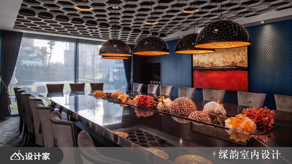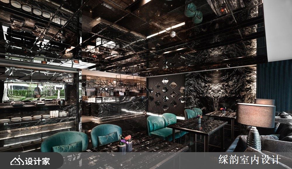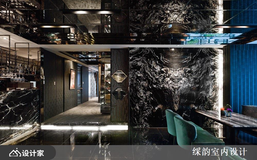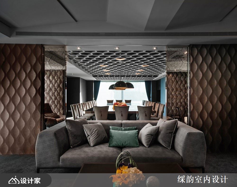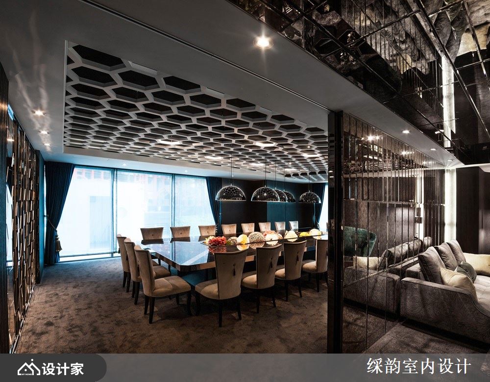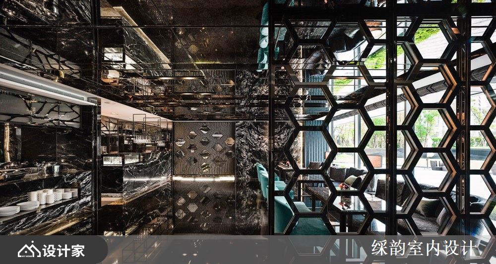 另外再以蜂巢意象作为奢华符号,延伸出镂空隔断墙、造型天花板等视觉概念,并善用镀钛不锈钢与镜面营造都会摩登的现代氛围,同时也让空间反射出更多幻丽层次的空间意象。