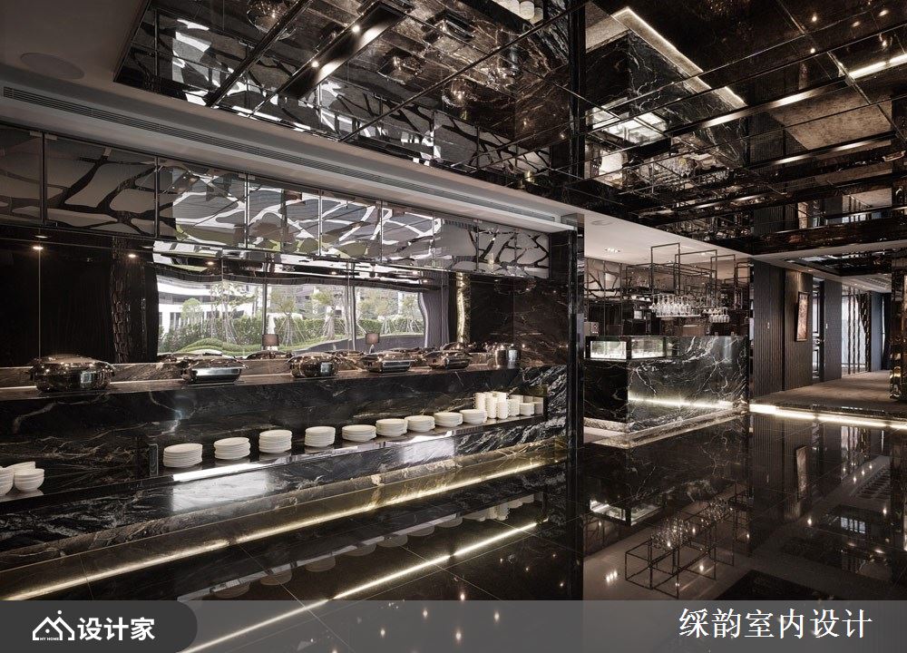 由于此案为企业福利设施空间,一来整体调性需贴合品牌核心精神,二方面也需完整规划出适合接待宾客、品酒交谊的优雅气息,因此綵韵首先运用黑夜昼纹的大理石建材作为视觉主轴,从墙面毗连至自助餐吧台,狂野不羁如墨洒般,泼下后缓缓释放极致高端品味。