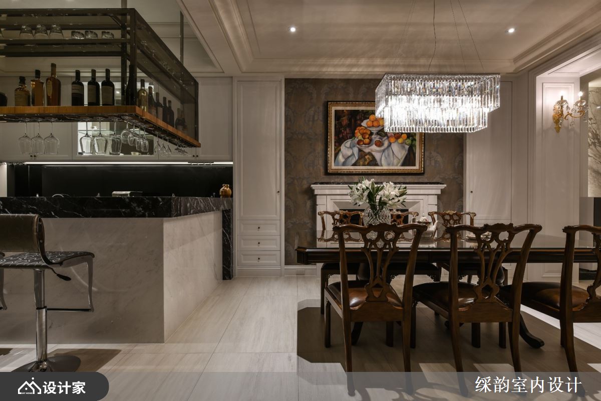 进入餐厅,中岛吧台发散着有如五星级酒店的大厅 Lounge bar 气息,壁炉设计则巧搭人文艺术画作与独具设计性格的水晶吊灯,开放式餐厨空间的整体氛围是实践优雅生活的沉稳脚步,一步一步踏向豪宅殿堂的高级质量。