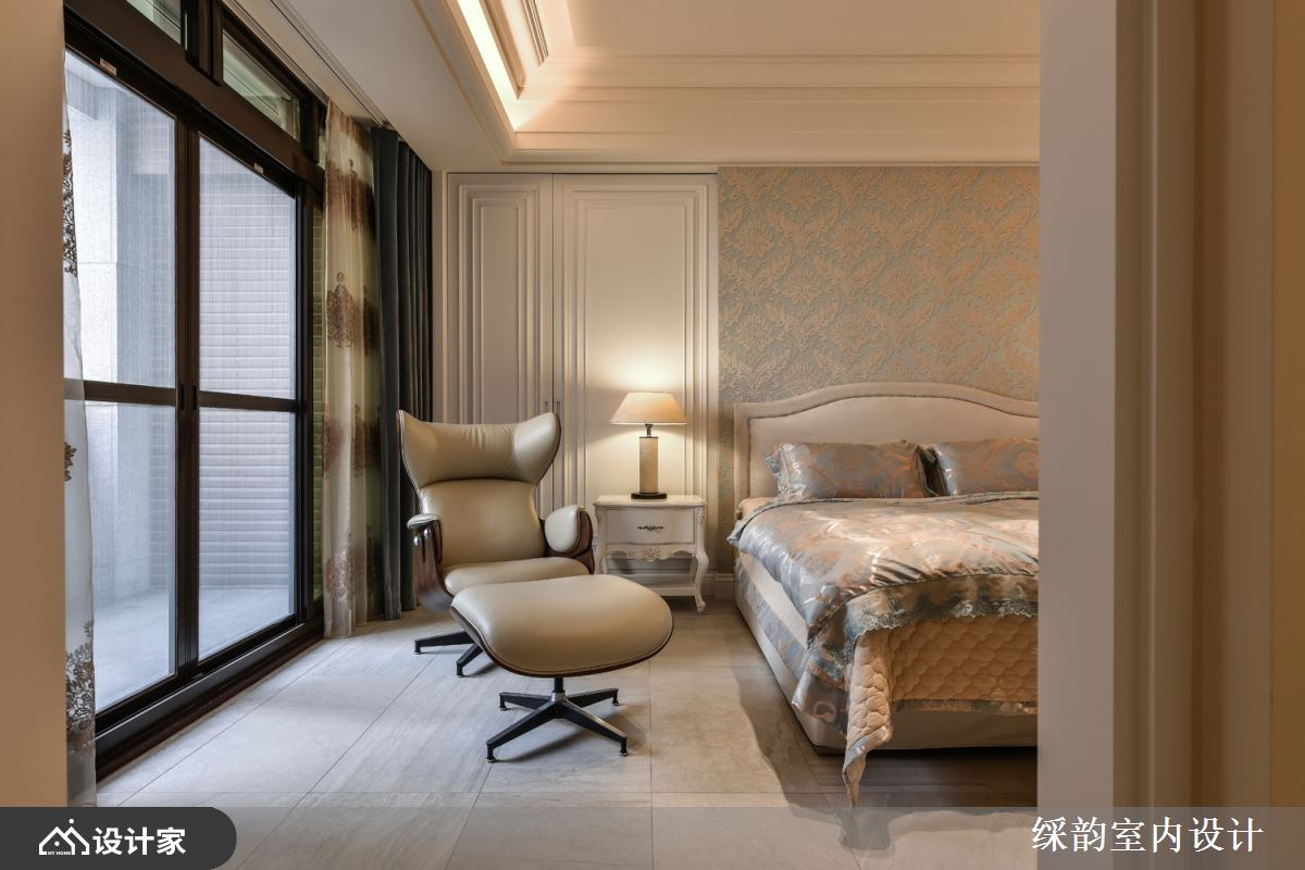 主卧延续公共空间的视觉主轴,但更为低调华贵与静谧沉稳,象征贵族般的私领域环境以大地色系为基底,搭配休闲椅、线板墙面、艺术挂画,呈现恬然静好的空间氛围;另一卧房也依循如此调性,粉嫩色墙面酝酿出更为慵懒甜美的舒适气氛。
