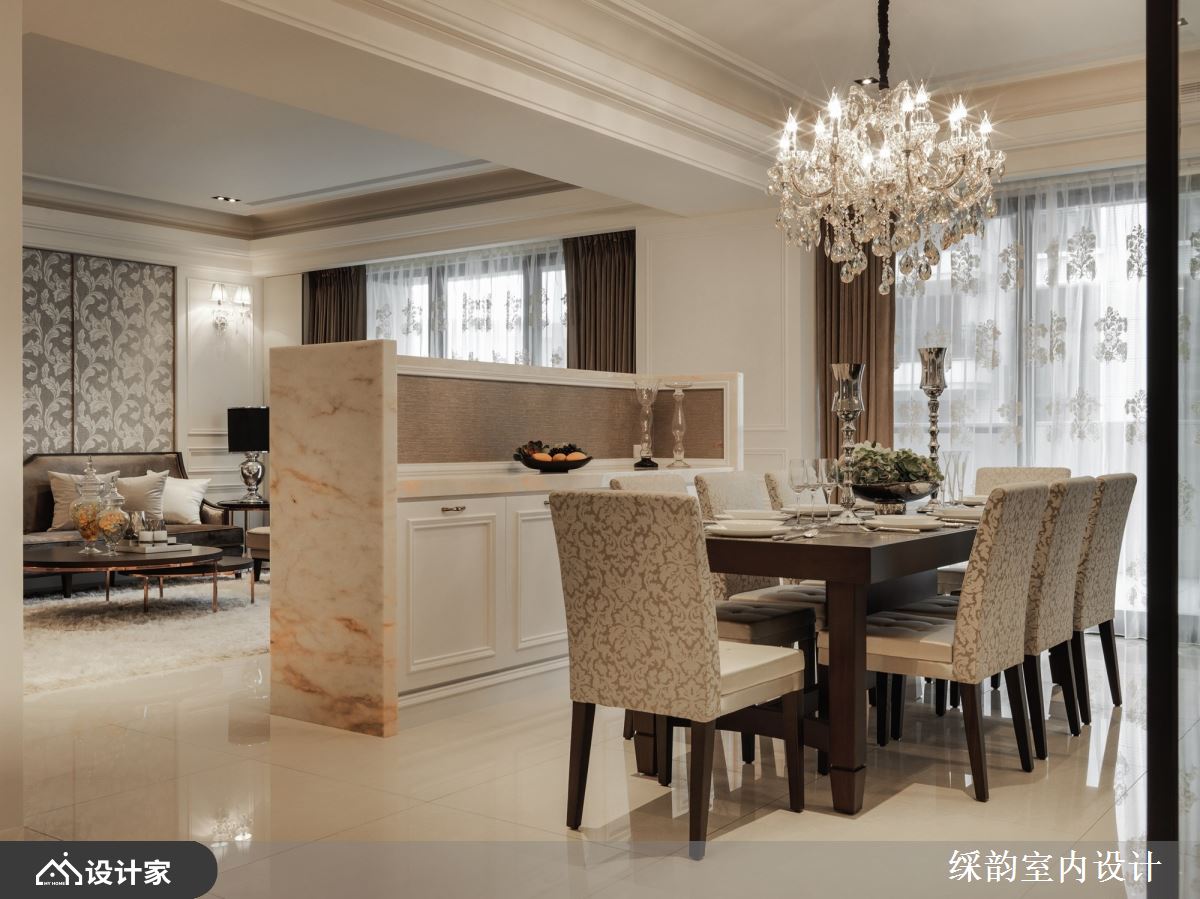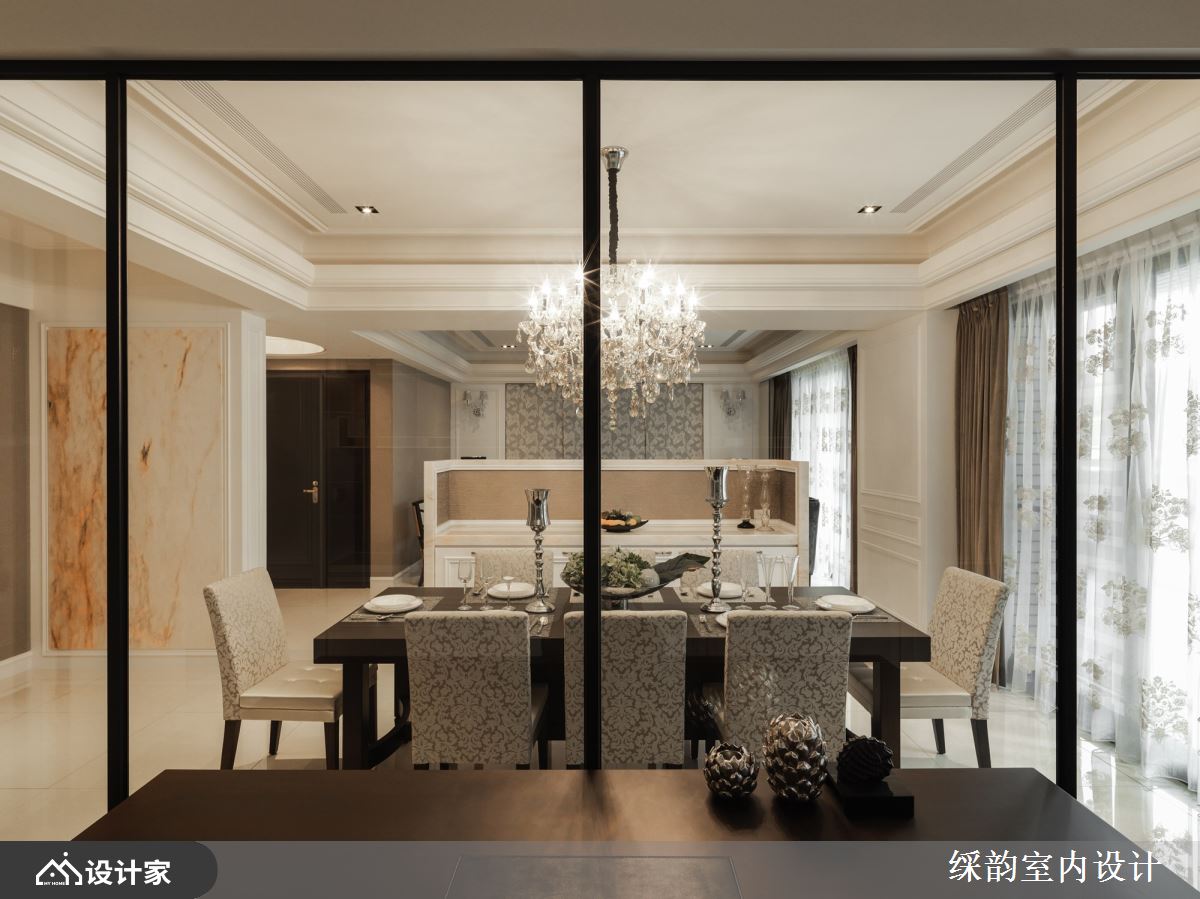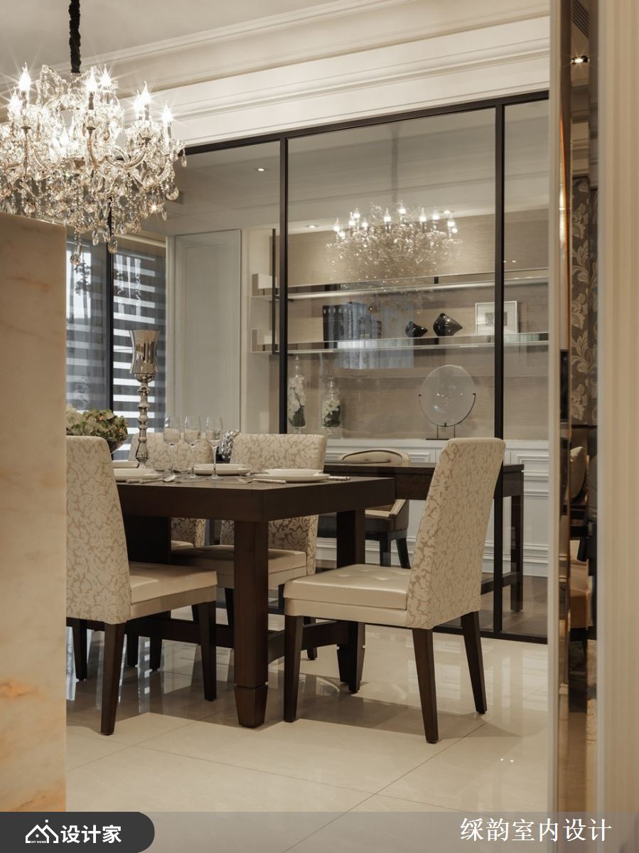 在餐厅部分,中间仅以矮型电视墙略为分界,避免实墙阻隔通透感受。而上方多盏灯泡的水晶吊灯呈现华美之姿,搭配实木餐桌,散发轻柔法式度假风情;后方则以铁框玻璃隔断保有书房的充沛采光,深色木地板清幽区隔了机能性质,细腻的设计巧思成就了豪宅典雅迷人之处。