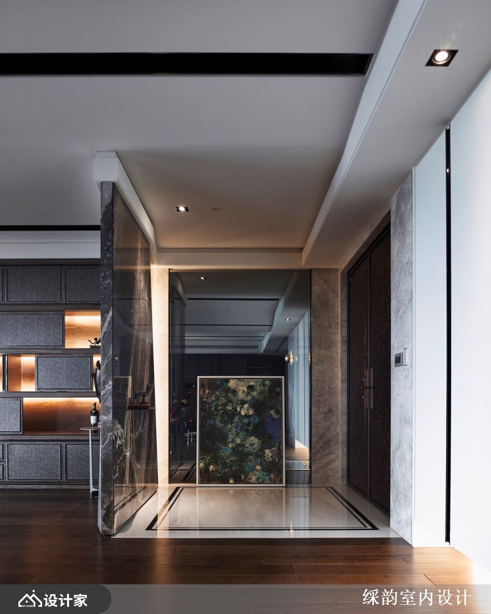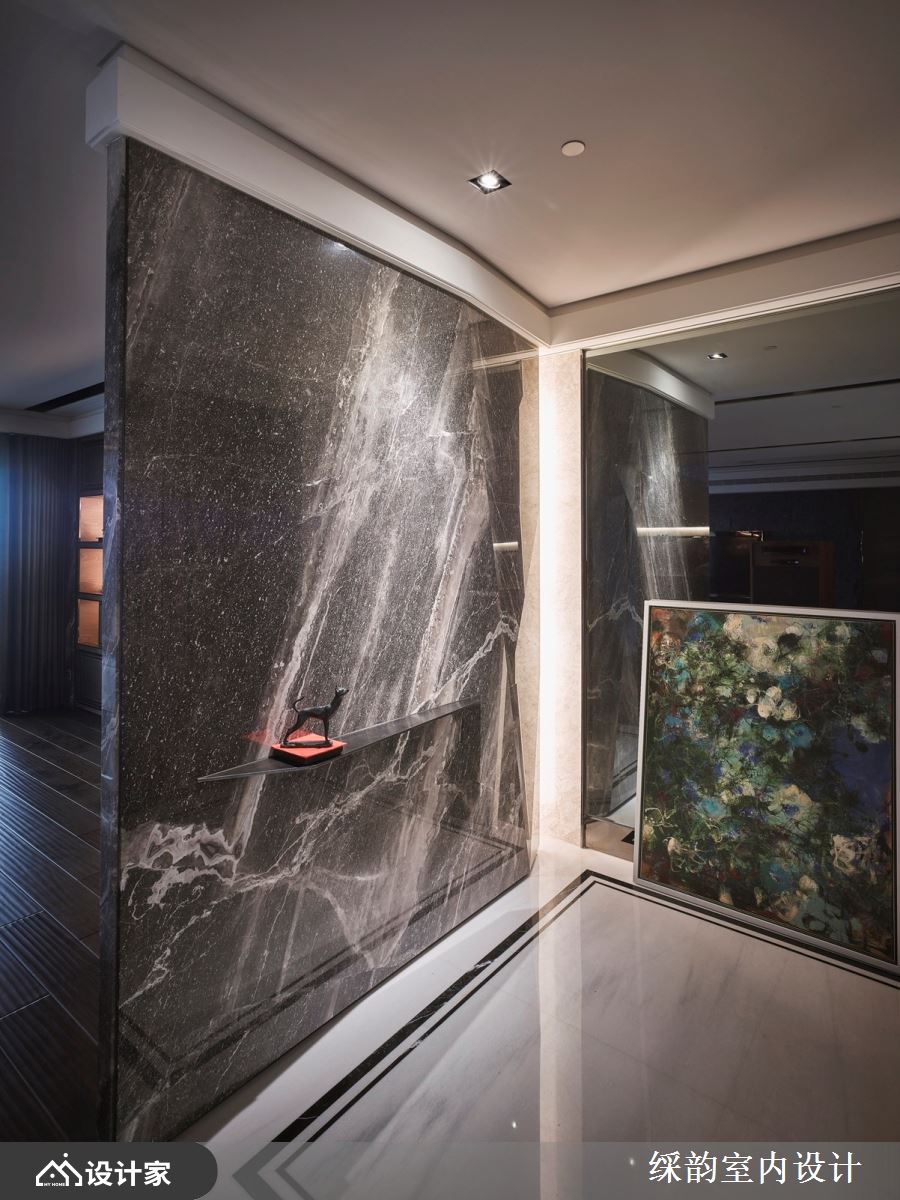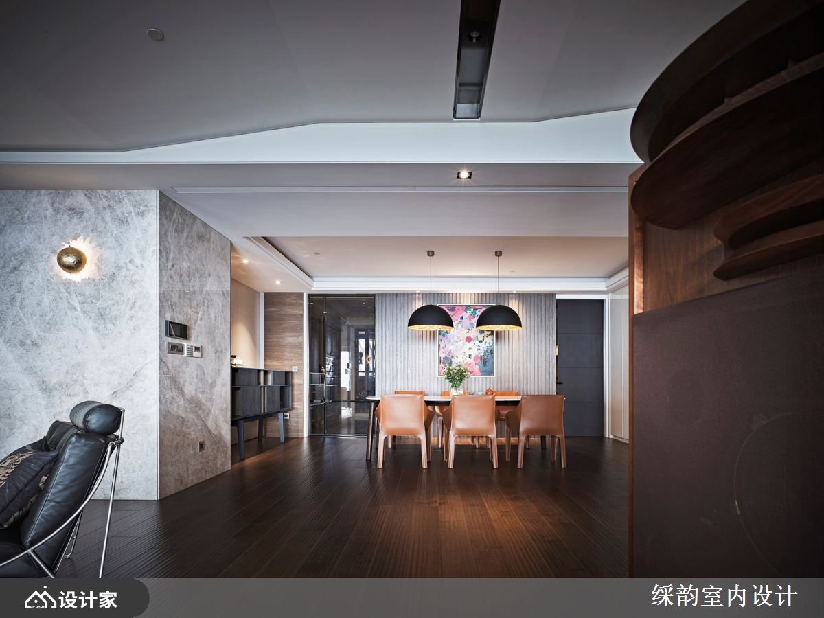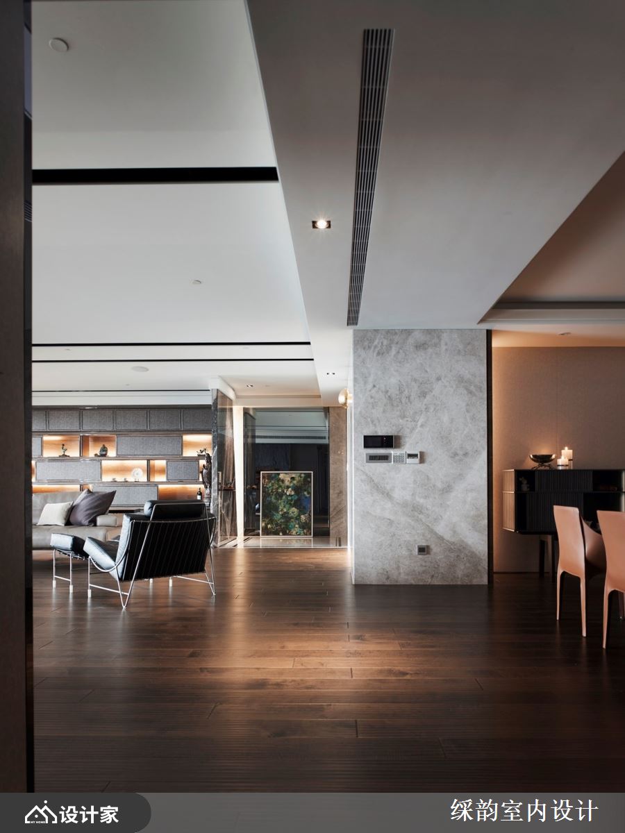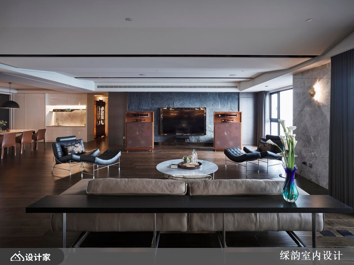 此案为一间 360 平米的豪宅府邸,屋主十分喜爱音乐,因此特地购买全组高端音响设备置放于客厅,拥有大量 CD 收藏,平日醉心享受优雅旋律与细腻音质的巧然流转,倾听浑厚低音与清脆高音;聆听之际,彷佛所有生活喧嚣都缓缓消却。 在氛围营造方面,䌽韵设计在客厅规划了宽松余裕的空间向度,从沙发到电视与大型音响,有着十分宽敞舒适的距离,让屋主能够慵懒入座,回到家中即能播放音乐,体验舒适放松的惬意居家。