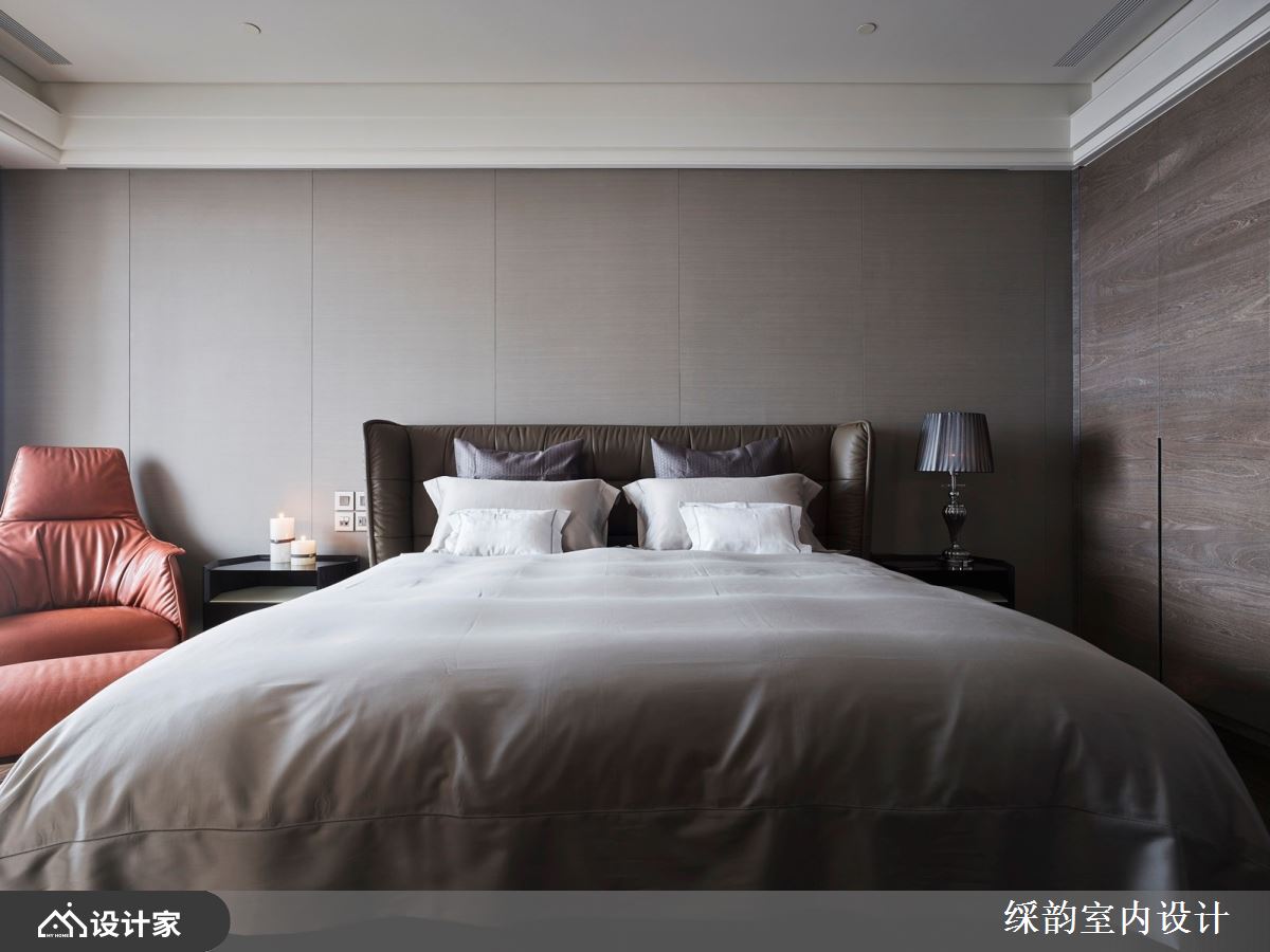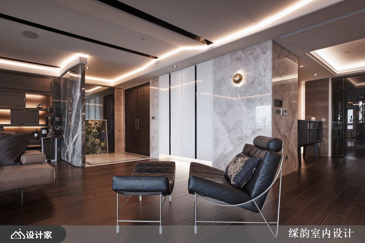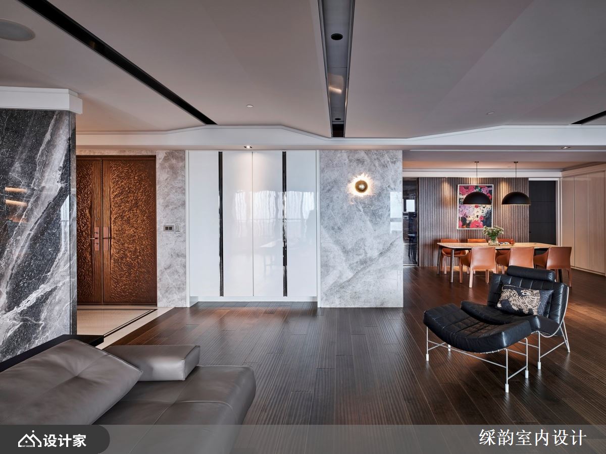 客厅空间保持简约设计品味,简单配置的皮革沙发、大理石茶几、Lounge chair,还有电视与音响,素雅极简的搭配便有着高端品味,散发都会时尚的现代风格。偌大空间也释放出无拘无束的情韵。为了突显豪宅意境与素雅调性,䌽韵多处使用石材,呼应大户人家的高大上,像是玄关端景墙面的灰底白纹大理石,化解了穿堂煞的风水疑虑,同时也成为迎宾的重要一景。