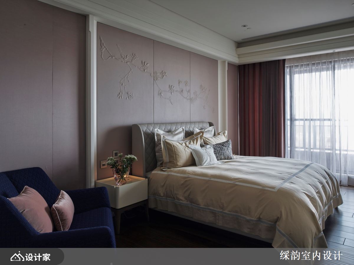 在餐厅空间,则使用荷兰前卫家具品牌 moooi 的大型设计吊灯 Skygarden,如其名所言,灯内的细致雕花有如漫步于空中花园般轻盈秀丽,娟秀美感油然而生,再搭配艺术挂画妆点空间,让用餐时刻充满人文风雅的氛韵情趣。 至于卧房空间,主卧床头墙面援引新中式古典风范,浮凸花雕栩栩如生,和房内绿植相互烘托惬意舒适的私领域空间;另一房则以简约素雅作为空间主轴,同色系的色彩计划使房内散发沉稳安心的家居情境。