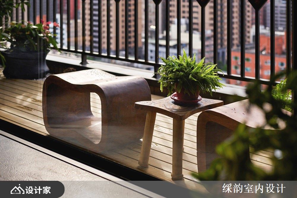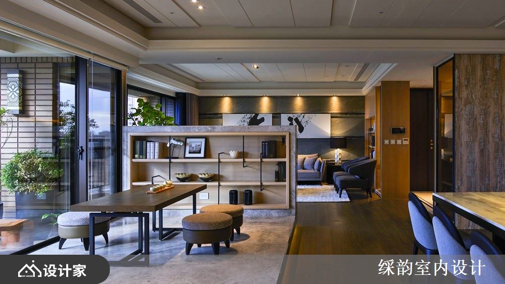 多久没有惬意放松,享受日光与慵懒泡茶时光? 此案落地窗旁的品茗泡茶区里以架高地坪,泡茶、喝茶之际还能欣赏阳台的绿意美景,电视墙背面利用铁件与木作层架转化为书架,其利落的分割线条,巧妙与木皮、铁件与金属创造的书柜墙相互呼应,错落有致的视觉造型,替幽静的空间氛围注入趣味活泼性。