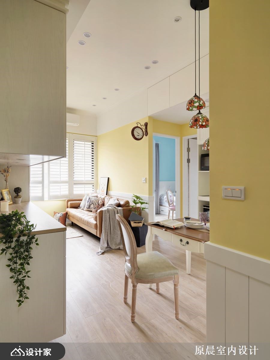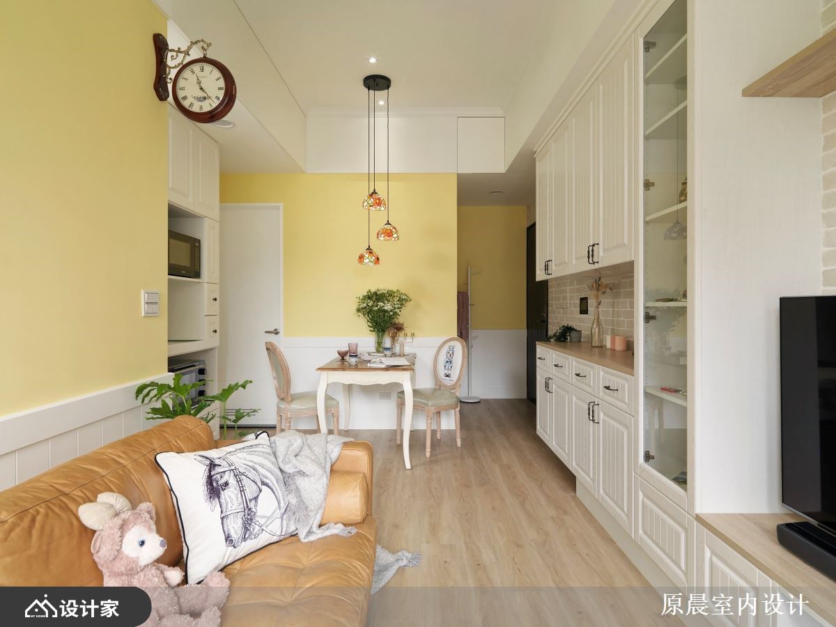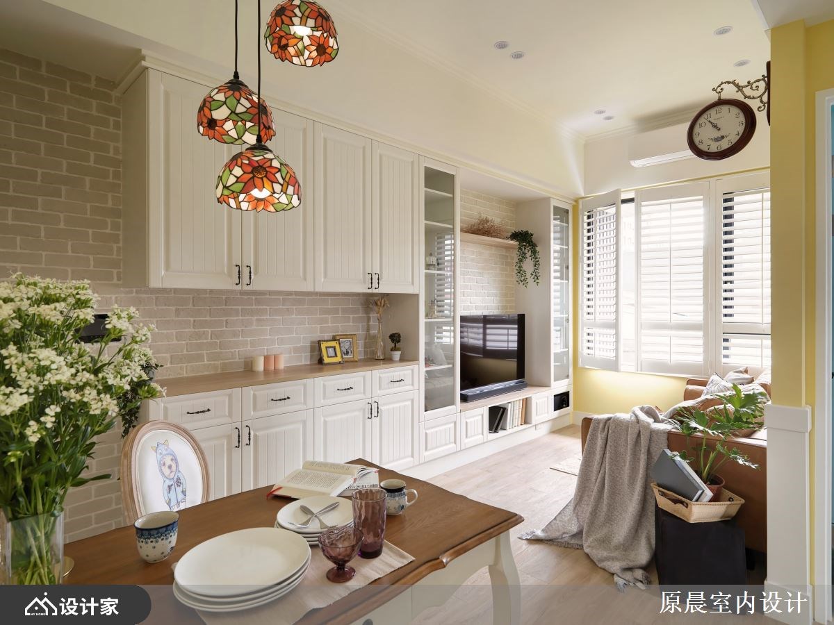 开放的格局规划,拉开空间视野,鲜明的亮黄、天空蓝,铺陈全室活泼敞亮气氛,文化石、百叶窗以及线板的应用,则刻划出置身于田野般的乡村风小屋,从格局规划、建材用运、软装佈置共筑两个人的温馨生活。 进门玄关壁面刷上亮黄漆色,提亮无光照角落,揭开室内活力的居家情景;文化石壁面及线板门片,定调乡村风主题,公领域共用的大型收纳柜,更让视觉动线一路导引至客厅窗边,鞋柜收纳、电视机柜与展示收纳一体安排的设计,将小坪数视线统整一致。小巧别緻的餐厅区,透过精选的彩绘玻璃吊灯,搭衬古典客桌椅,框出用餐空间的可爱与温馨;客厅由对称的展示收纳柜佐文化石牆,创造客厅领域的气派与层次感。 小编的最爱 主卧回归单纯的睡眠机能,大面窗景与透光帘幕挹注室内好採光,而天蓝色的漆面带来柔和浪漫的休息气氛,再安排基础的梳化、阅读书桌规划,满足私领域的基础需求。