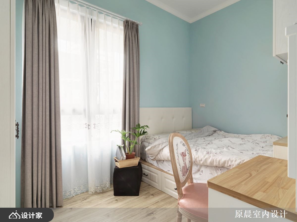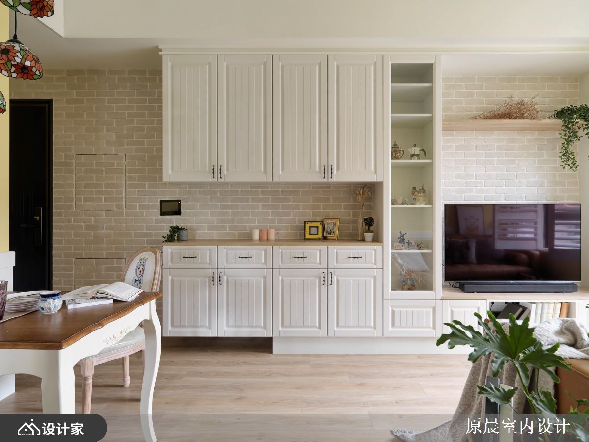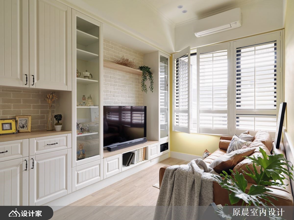 开放的格局规划,拉开空间视野,鲜明的亮黄、天空蓝,铺陈全室活泼敞亮气氛,文化石、百叶窗以及线板的应用,则刻划出置身于田野般的乡村风小屋,从格局规划、建材用运、软装佈置共筑两个人的温馨生活。 进门玄关壁面刷上亮黄漆色,提亮无光照角落,揭开室内活力的居家情景;文化石壁面及线板门片,定调乡村风主题,公领域共用的大型收纳柜,更让视觉动线一路导引至客厅窗边,鞋柜收纳、电视机柜与展示收纳一体安排的设计,将小坪数视线统整一致。小巧别緻的餐厅区,透过精选的彩绘玻璃吊灯,搭衬古典客桌椅,框出用餐空间的可爱与温馨;客厅由对称的展示收纳柜佐文化石牆,创造客厅领域的气派与层次感。 小编的最爱 主卧回归单纯的睡眠机能,大面窗景与透光帘幕挹注室内好採光,而天蓝色的漆面带来柔和浪漫的休息气氛,再安排基础的梳化、阅读书桌规划,满足私领域的基础需求。