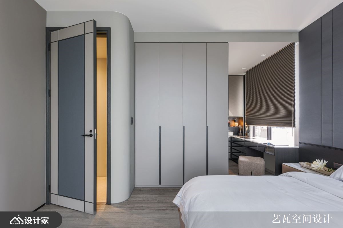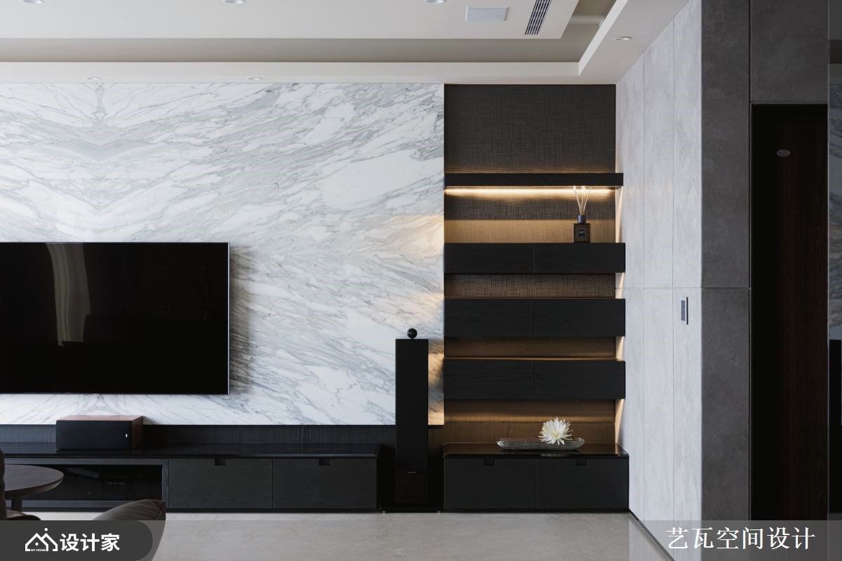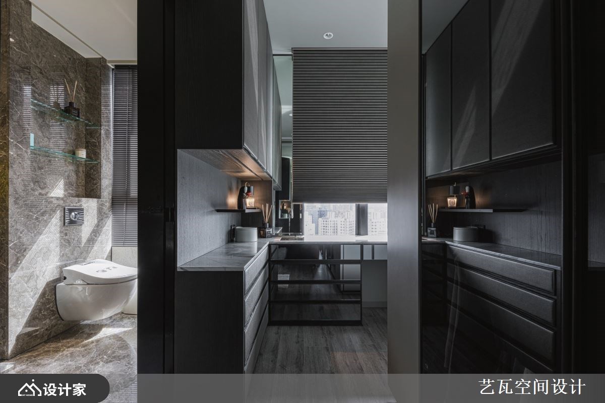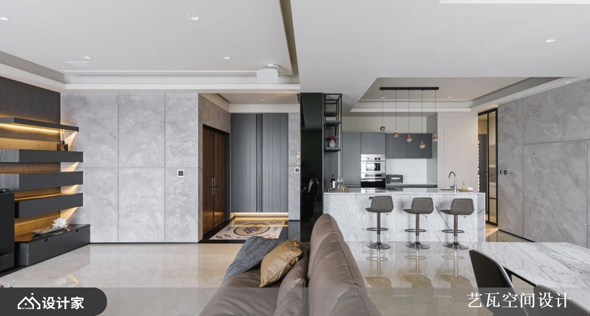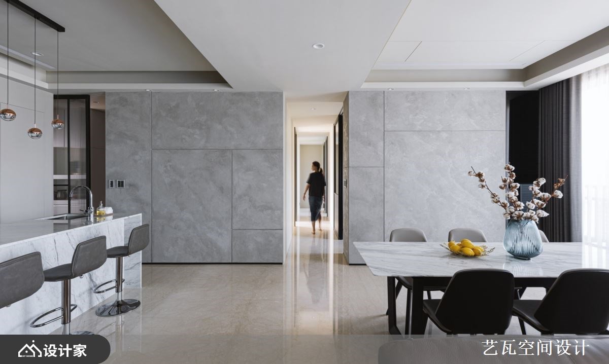 夫妻即便个性、想法有所差异,但总能经过耐心沟通,找到相处共识。这间314平米现代风豪宅的男主人喜爱米色调的温馨氛围,女主人则爱好深色调的个性质感,而在设计师的协调整合之后,透过大理石、特殊漆、木皮等异建材混搭,为年轻夫妻营造出明亮开阔的新颖居家。 【玄关好风水,创造进门的高雅感】 年轻的男主人特别注重玄关风水,因此从皮革收纳柜的安排、花艺端景的布置到照明灯光的搭配,甚至是拼花大理石地板的图腾与尺寸,都完全符合他对风水和美感的追求。公领域天花板以驼色带灰的中性色调,跟米白色石材地板相互辉映,同时满足夫妻俩的内心企盼,又能细腻地创造出室内的立体层次。 豪宅内部采取开放式设计,客厅、餐厅、中岛厨房依序呈现,让落地窗采光能够照亮整个空间。客厅大理石电视墙的灰白纹理,与特殊漆妆点的灰阶墙面,形成高雅和朴实的艺术碰撞,迸发出与众不同的空间审美。厨房藉由镜面延伸中岛吧台的视觉深度,加上哑光灰的烤漆厨具给人沉稳洗炼的安心感,让夫妻俩可以在此慢慢品尝生活况味。 小编的最爱 主卧室选择低调沉着的灰色绷布装饰床头墙,无把手的收纳柜设计使空间动线更为流畅,而化妆台、卫浴位置的层层递进,让彼此相处时也能维持自己的隐私,感情自然走得长久隽永。