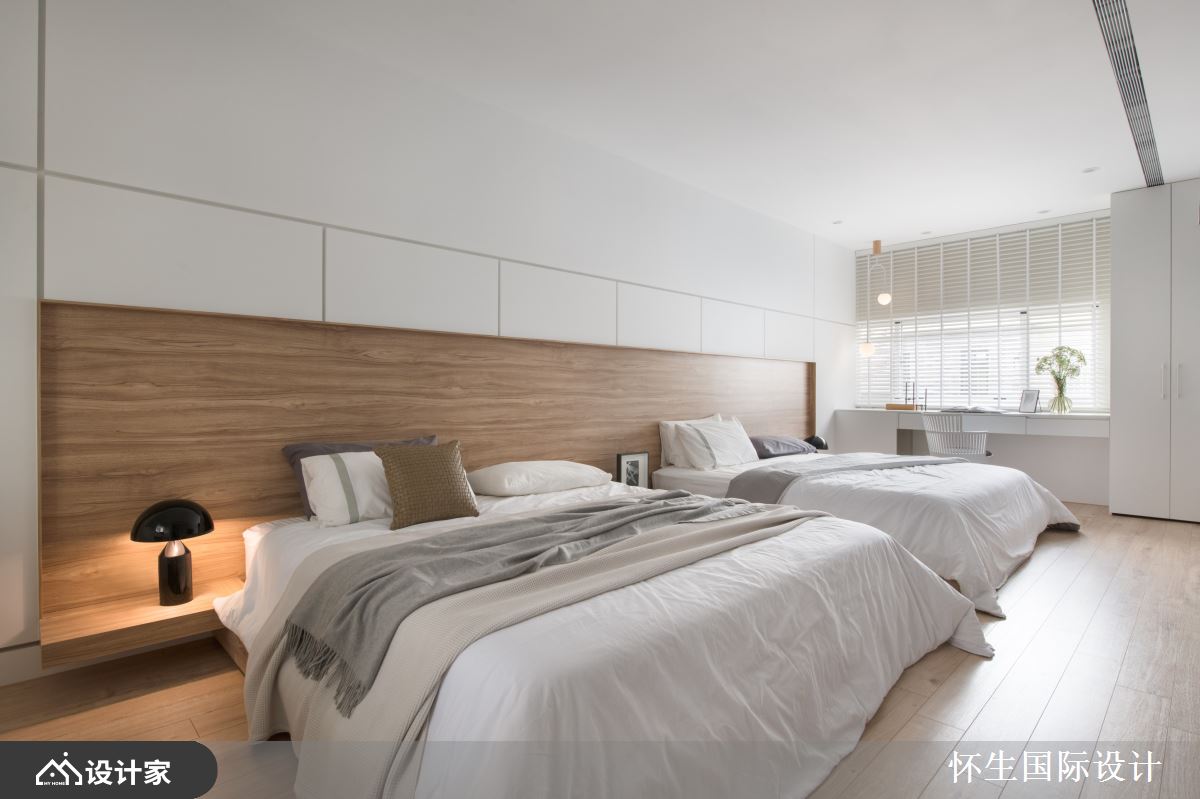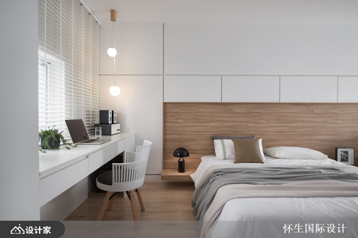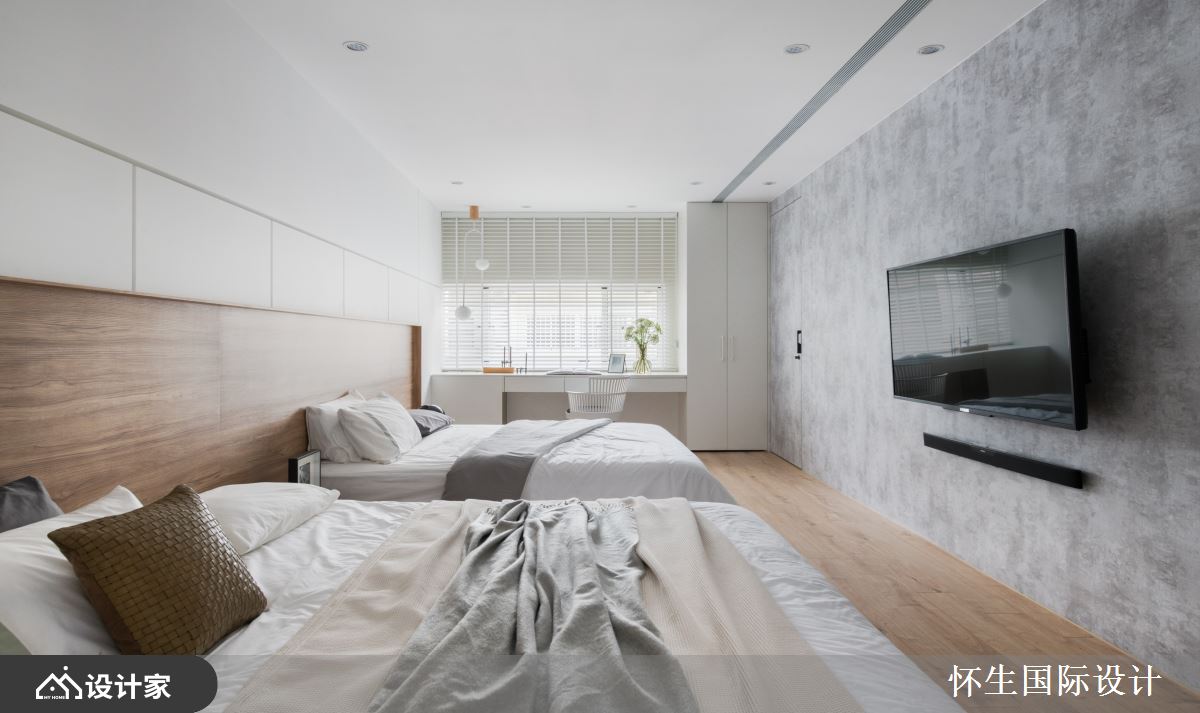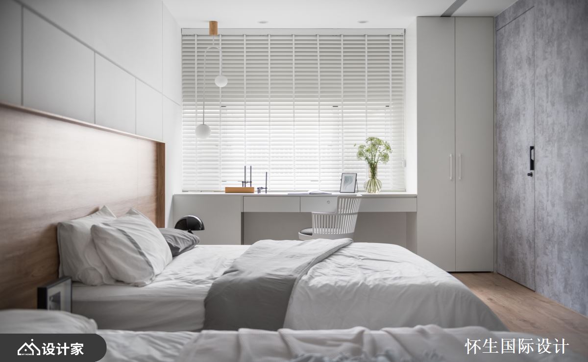 小编带你看好宅 设计师以简约风进行住宅翻新,在有限预算内,将老式透天厝进行局部翻新,让年轻一辈可在多代共居的家宅中、满足新婚生活的需求,快跟着小编一起来看看吧! 重新设计的单层室内,规划为卧房与健身室两大区块,并设置独立的更衣室空间满足收纳需求;卧房整体以纯白色调为主,藉由前后双向开窗的设计,让狭长透天厝在布局上也能拥有良好采光,结合仿水泥材质的灰色贴皮壁面与浅色木质床头墙面、地坪,营造出年轻明亮的空间感;卧房中央以双 KING SIZE 大床并排陈列,前后临窗两侧各设置专属夫妇各自的书桌台面,以对称性的配置,让卧室在夫妇共处之余能保有各自独立的活动区域,同时也考虑到未来下一代出生后方便抚育、共住! 小编的最爱 设计师发挥「麻雀虽小,五脏俱全」的精神,在家中规画独立健身室,以灰色仿水泥铺面,透过大面积镜面墙放大空间、延伸卧房尺度,搭配各式运动器材与液晶电视,体现空间设计与生活日常的完美结合!