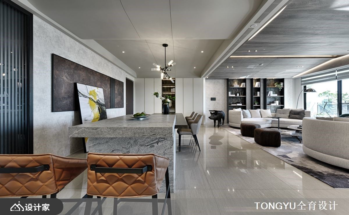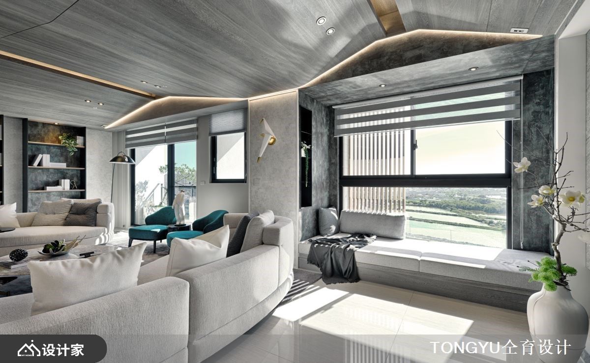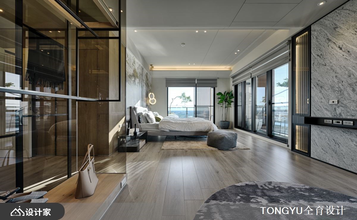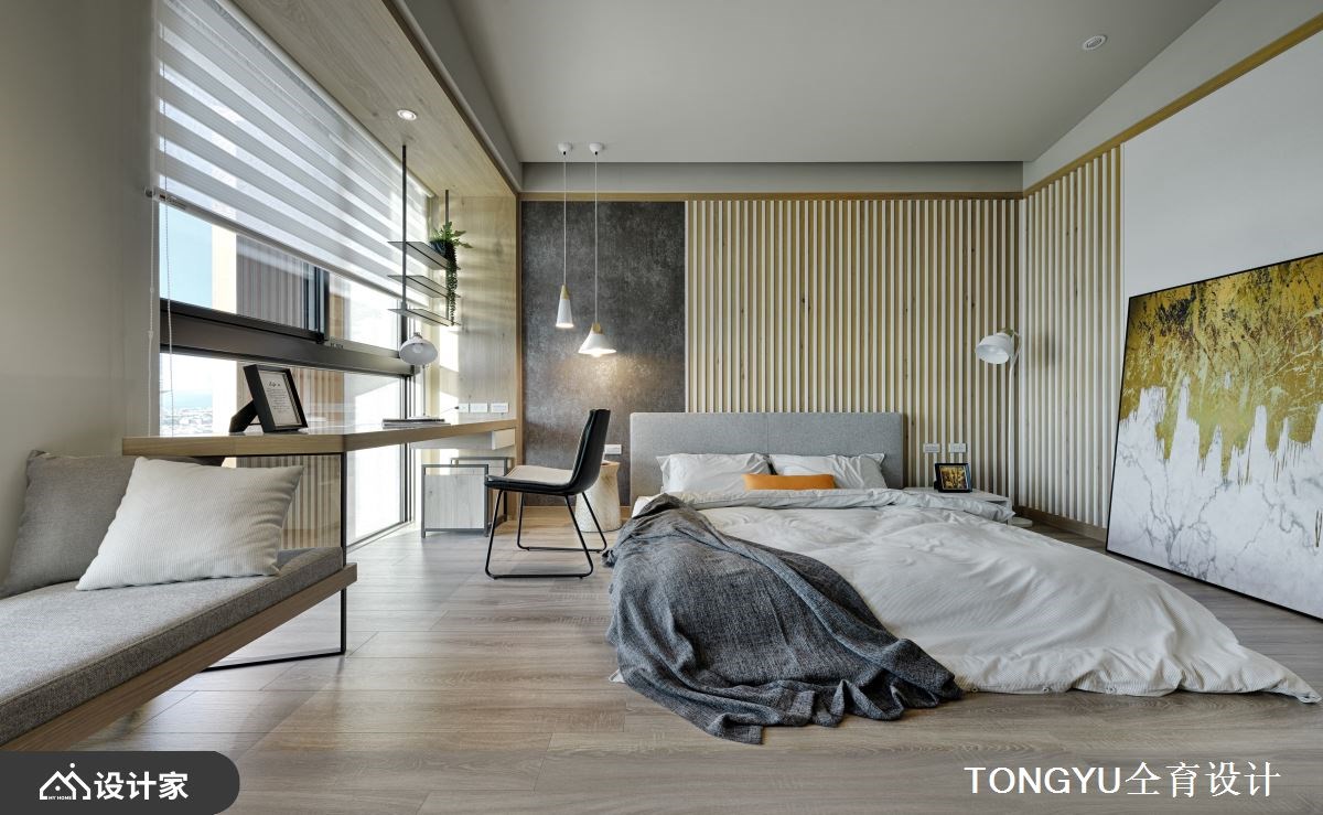 坐卧在窗边宽敞的舒适飘窗,吹着冷气边沐浴着阳光眺望窗外美景,无疑地是放假在家最完美的享受。以“疗愈休闲”作为 241 平米大宅的设计灵感,活用窗边空间以及自然建材让室内空间也能感受到山林里放松的自在感,让疗愈光感与包覆天花的木皮疗愈辛苦上班回家的夫妻。 【材质与家具诠释一处一景】 着重在休闲自然氛围的形塑,因此在大理石材的选择上以轻柔的灰白与米色调为主,靠近采光窗的客厅区域间,将木皮铺设于造型天花板上,营造出度假木屋般的休闲感。大面积落地窗规划宽敞的飘窗座椅,将户外躺椅化移植到室内空间,打造居家惬意放松的角落。沙发家具跳脱制式化设计,以流线造型的沙发搭配单椅座,利用坪数优势还规划了起居室,在照顾生活机能之外透过视觉陈列强化放松疗愈的氛围。 开放式设计的中餐厨规划也以欧美杂志令人向往的大中岛连结餐桌为设计概念,中岛搭配略高的吧台椅将户外轻食吧的意象带入室内,而长型餐桌则维持舒适的餐椅坐高,将度假风情的美好与居家的自在完美融为一体。 小编的最爱 宽敞的居室在设计上以架高床板取代一般床架设计,木格栅造型拼贴石纹墙纸,营造带点日式休闲风格的私人休憩区。从木地板、木质收纳柜到窗边的飘窗休憩与阅读区,一路延伸到天花板的海浪造型,让屋主透过建材与造型感受到居家带来的疗愈力。