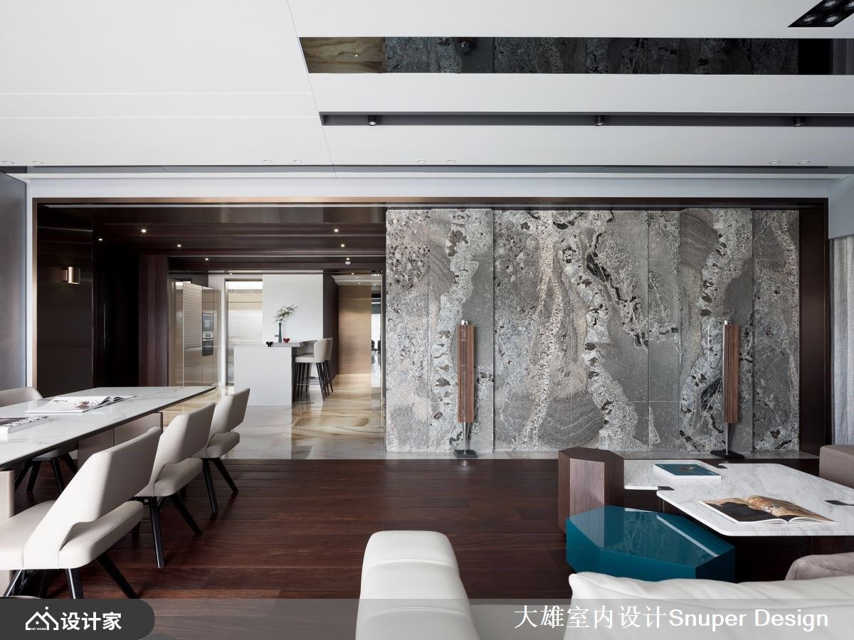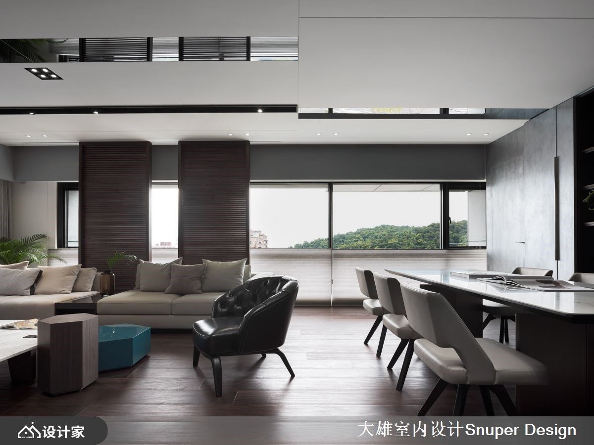 172平米的现代风豪宅以南洋度假风情作为空间主轴,木质的温暖、石材的冷冽、金属的光亮,在夏日微风的阵阵吹拂中,交织出沁人心脾的丰富印象,同时运用明确的公私领域界线,赋予室内层层递进的安稳与神秘感。 【双向大面开窗,打造明亮公领域】 客餐厅天花板透过长条形镜面,延展出公共空间的开阔感,反射着居住者的生活与彼此的热络互动,而双向的大面积开窗,让空间拥抱明亮充沛的日光,并照亮位于深处的中岛吧台区,定义干净无负担的公领域氛围。窗边还设置机动性高的百叶推拉门,让光影在门片的移动之间,转换多采多姿的迷人神情。 客厅电视墙采取立体的石材堆砌,呼应着绿意盎然的山峦远景,点亮空间的自然气质;餐厅主墙藉由灰阶的特殊漆面与南洋红木调,打造能够摆放小家电、生活用品的收纳端景。作为公私领域的转折点,中岛吧台提供居住者一处静心休息的角落,一旁半透明推拉门隐藏了后方的书房和卧室,营造完整不受干扰的私密空间。 小编的最爱 卧室采取人字拼木地板,铺排出与众不同的空间表情,再搭配低彩度的家具与墙面,形成舒适惬意的睡眠环境。私领域还特别配置Sauna Room,让人回到家中可以沉浸于满室的木质香气,卸下一整天的疲惫,找回最放松的自我。