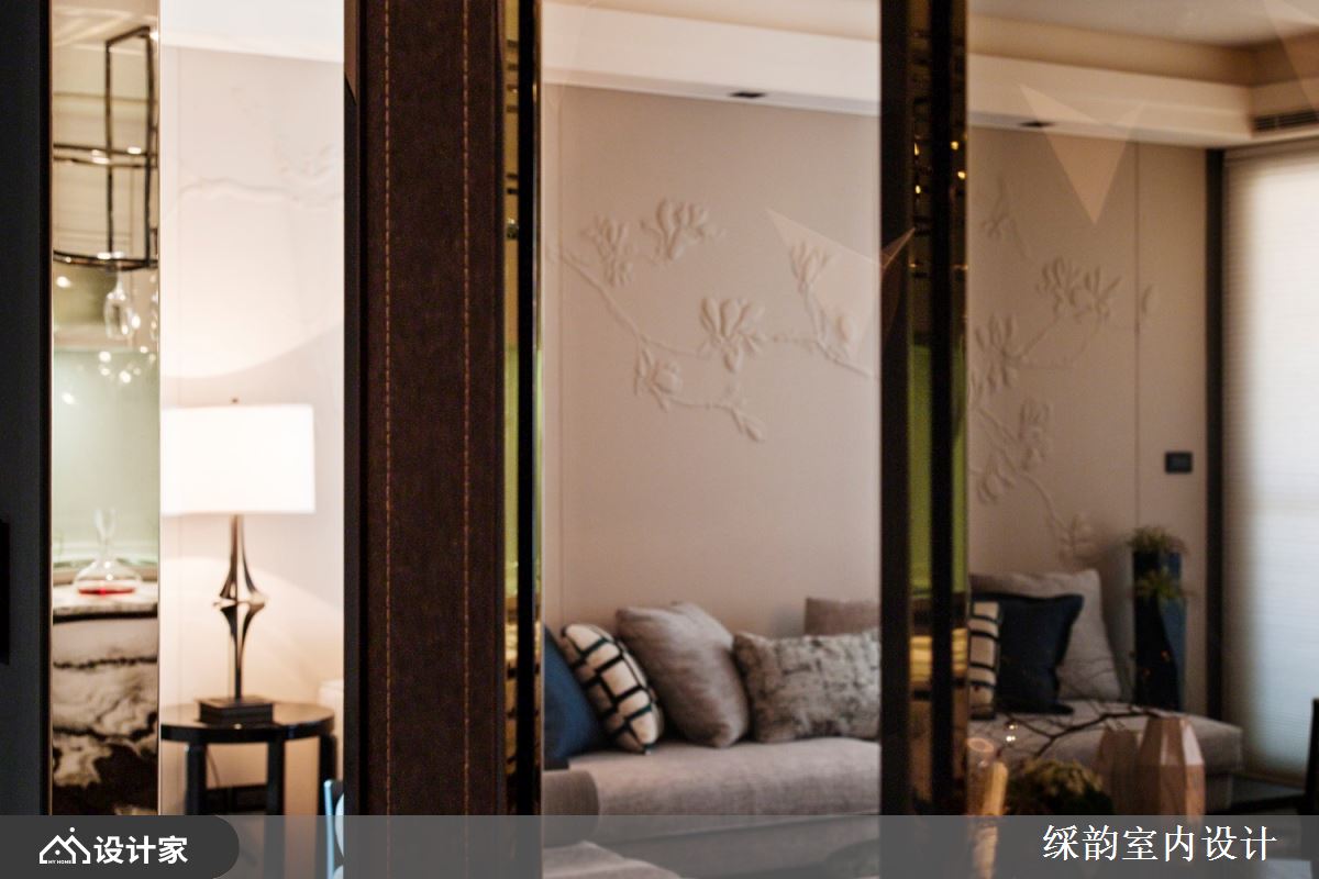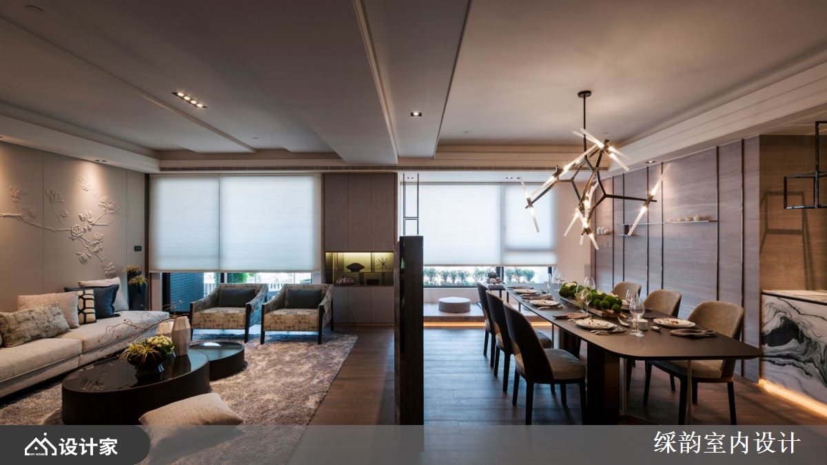 此案为 315 平米的豪宅府邸,各个空间皆有自然采光,因此䌽韵设计运用大片落地窗作为呼应衬托,引光入室之余,也将典雅风格导入其内,诠释细腻别致的空间韵味。从玄关步入大厅,花卉浮凸的墙面设计透着柔美诗意,也缀点出屋主的高端品味;开放式客厅与餐厨仅以电视矮墙做为轻盈分界,让视觉动线保持顺畅通透,同时也让客厅、餐厅之间保有空间连结。